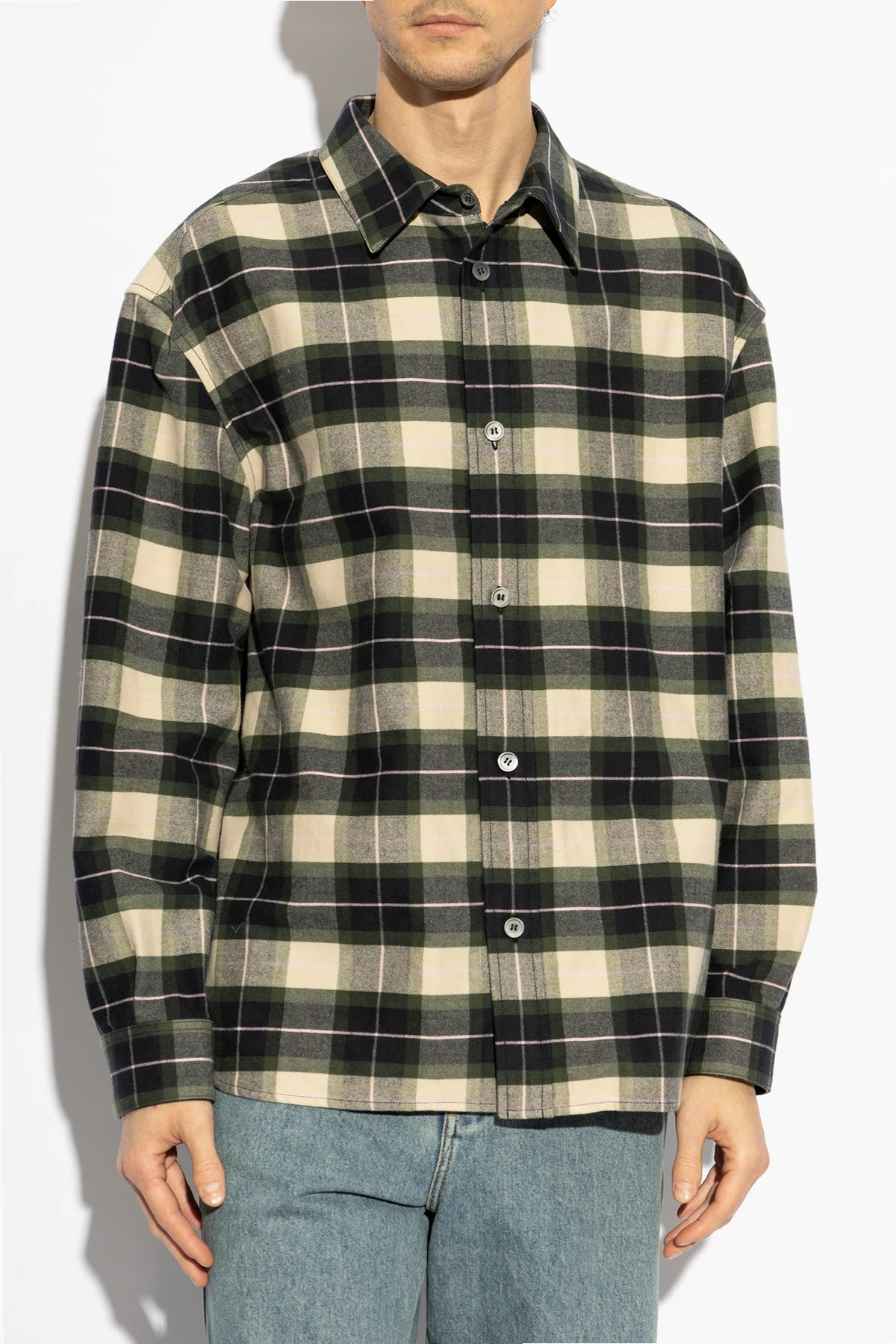 Gefertigt aus hochwertiger Baumwolle , besticht dieses Hemd durch ein klassisches Karomuster in den Tönen Dunkelgrün, Creme und Schwarz. Sein gerader Schnitt, lange Ärmel und Knopfverschluss machen es zur idealen Wahl für kühlere Tage.