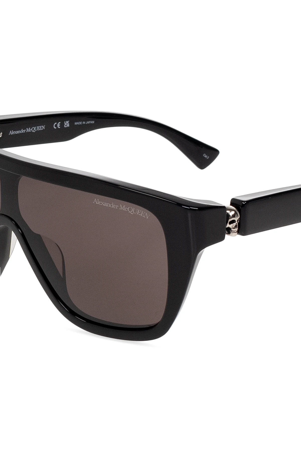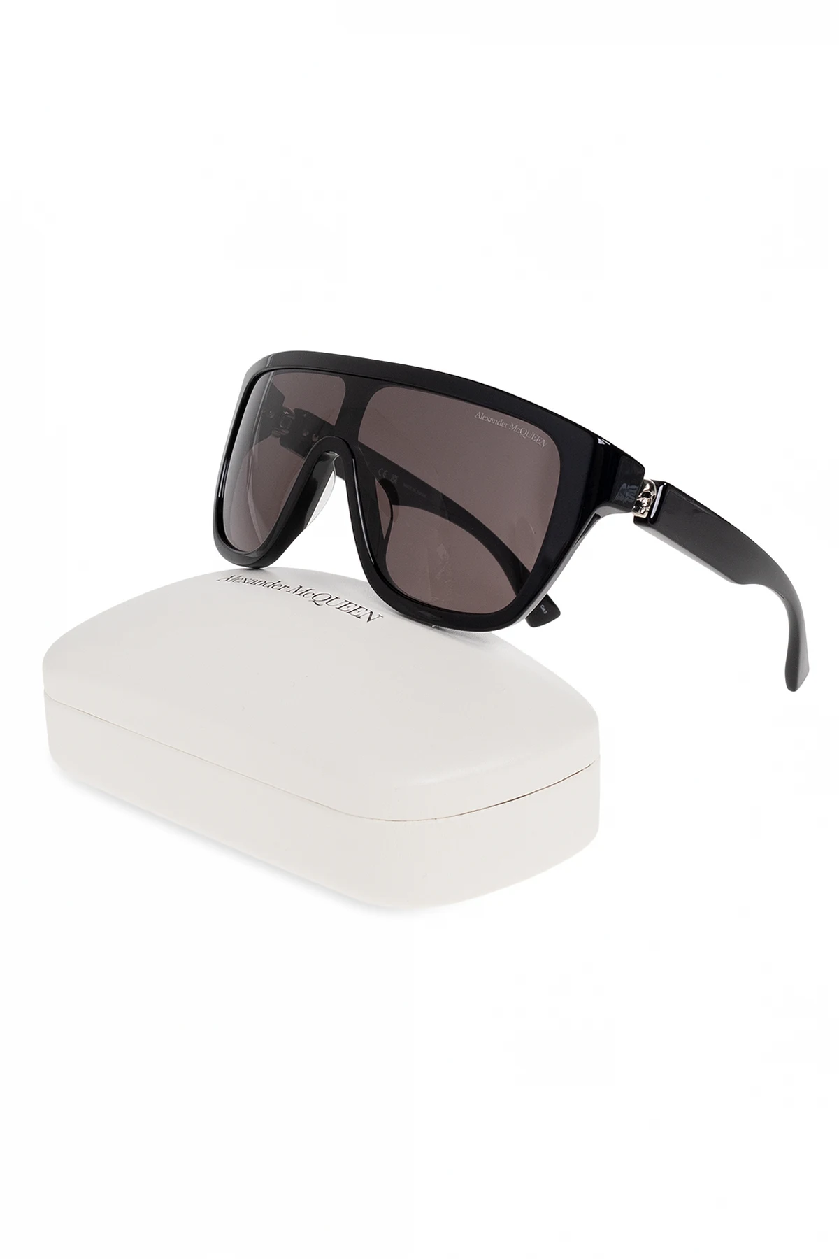 Black sunglasses from Alexander McQueen. Made of recycled materials, this pair features a mask frame with a single bridge and integrated nose pads, temples with decorative hinges in the shape of the brand's signature skull and grey lenses with 100% UV protection and engraved logo. Case included.