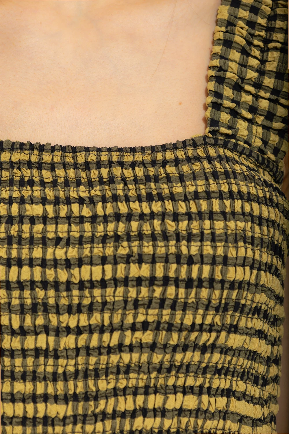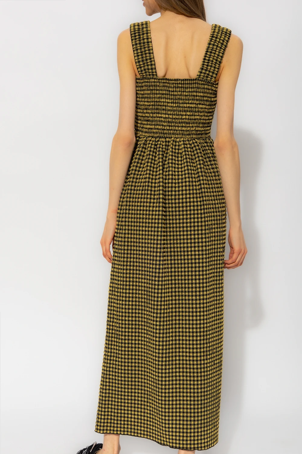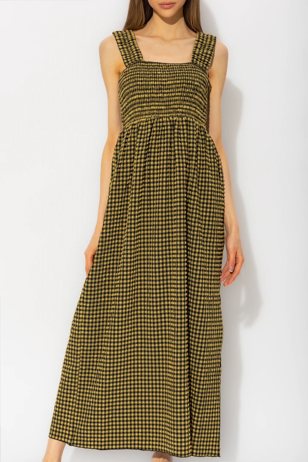 Khaki and black ‘Georgia’ sleeveless dress from Notes Du Nord. Made of seersucker fabric, this design features a vichy check, fitted top with gathers and flared skirt.