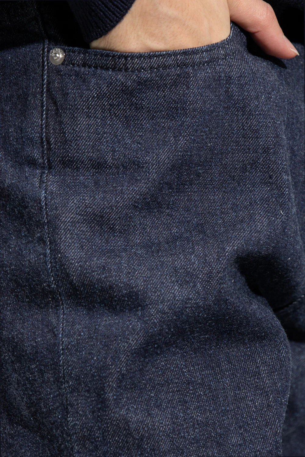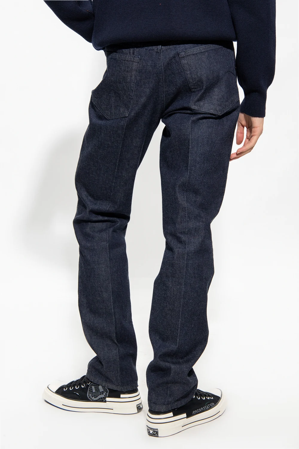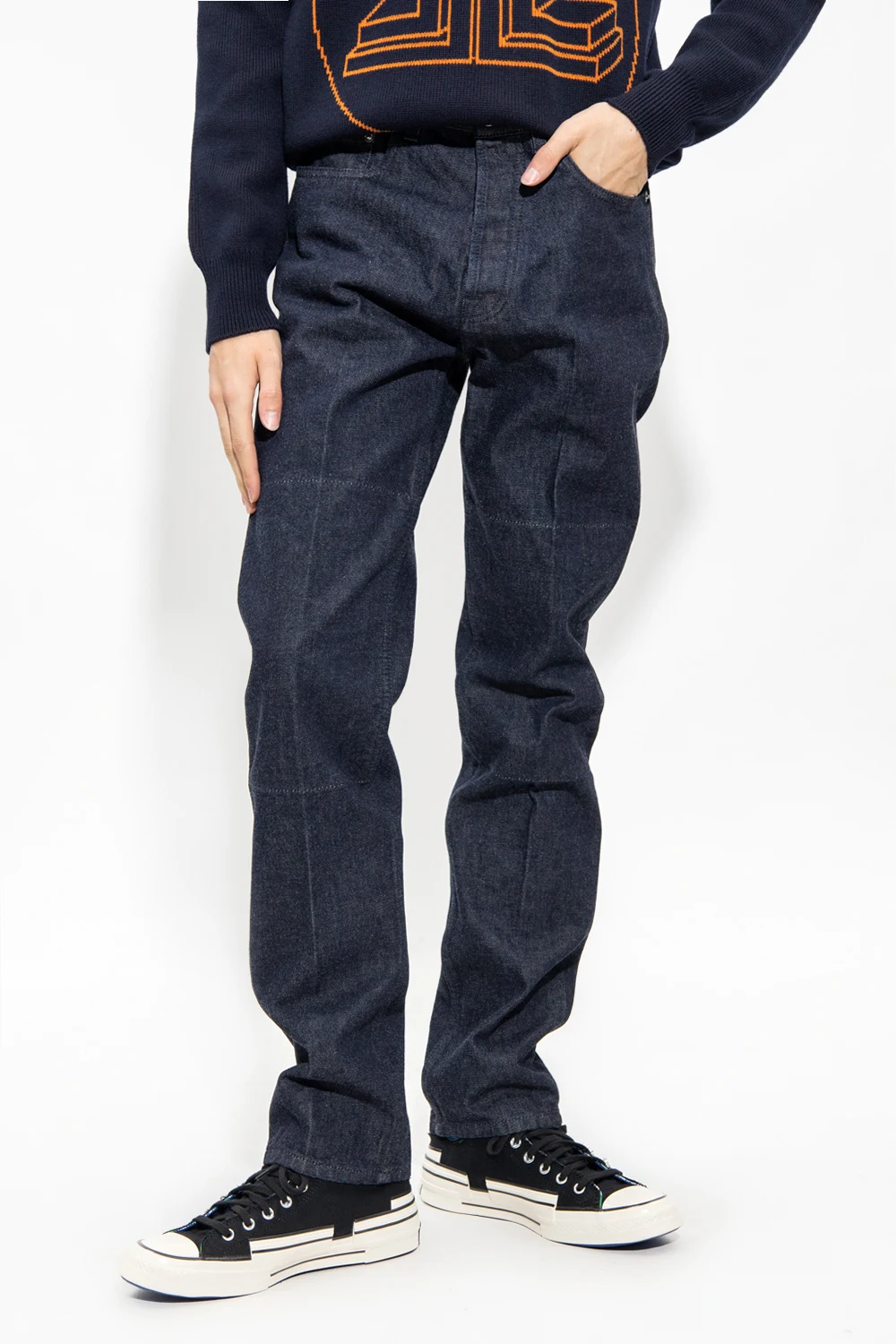 Navy straight leg jeans from Lanvin. Fastened with buttons, this pair features a black logo patch at the back, five slip pockets and pleat-front trousers