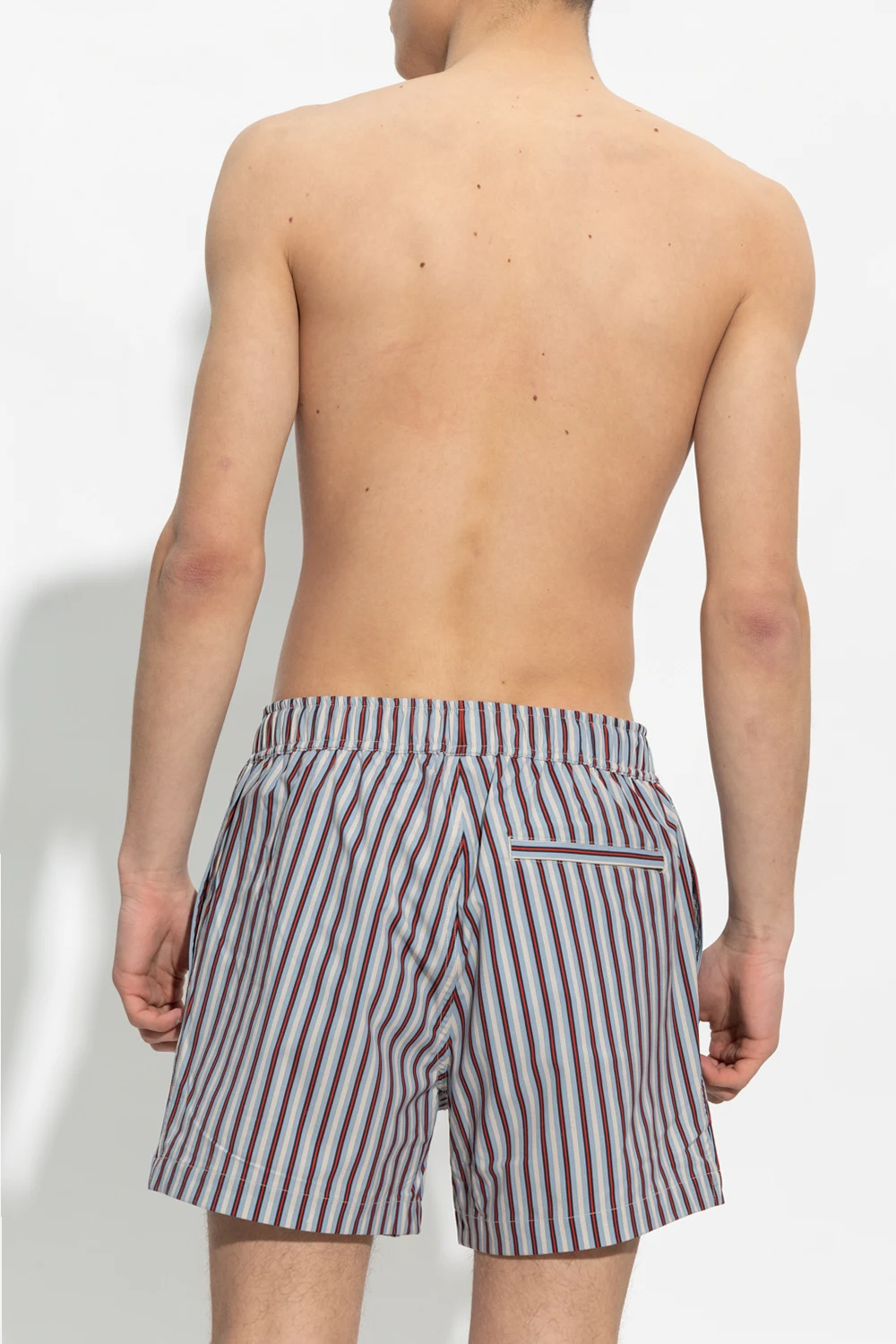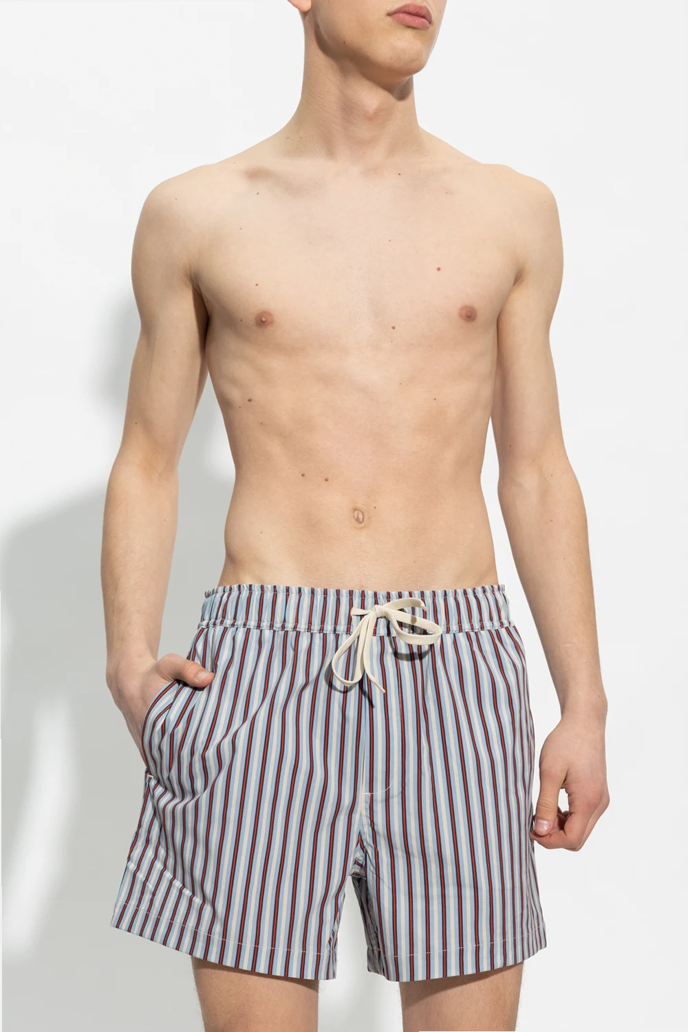 Blue, red and navy ‘Moses’ swim shorts from Samsoe Samsoe. Decorated with a stripe pattern, this pair has an elastic drawstring waistband and three slip pockets.
