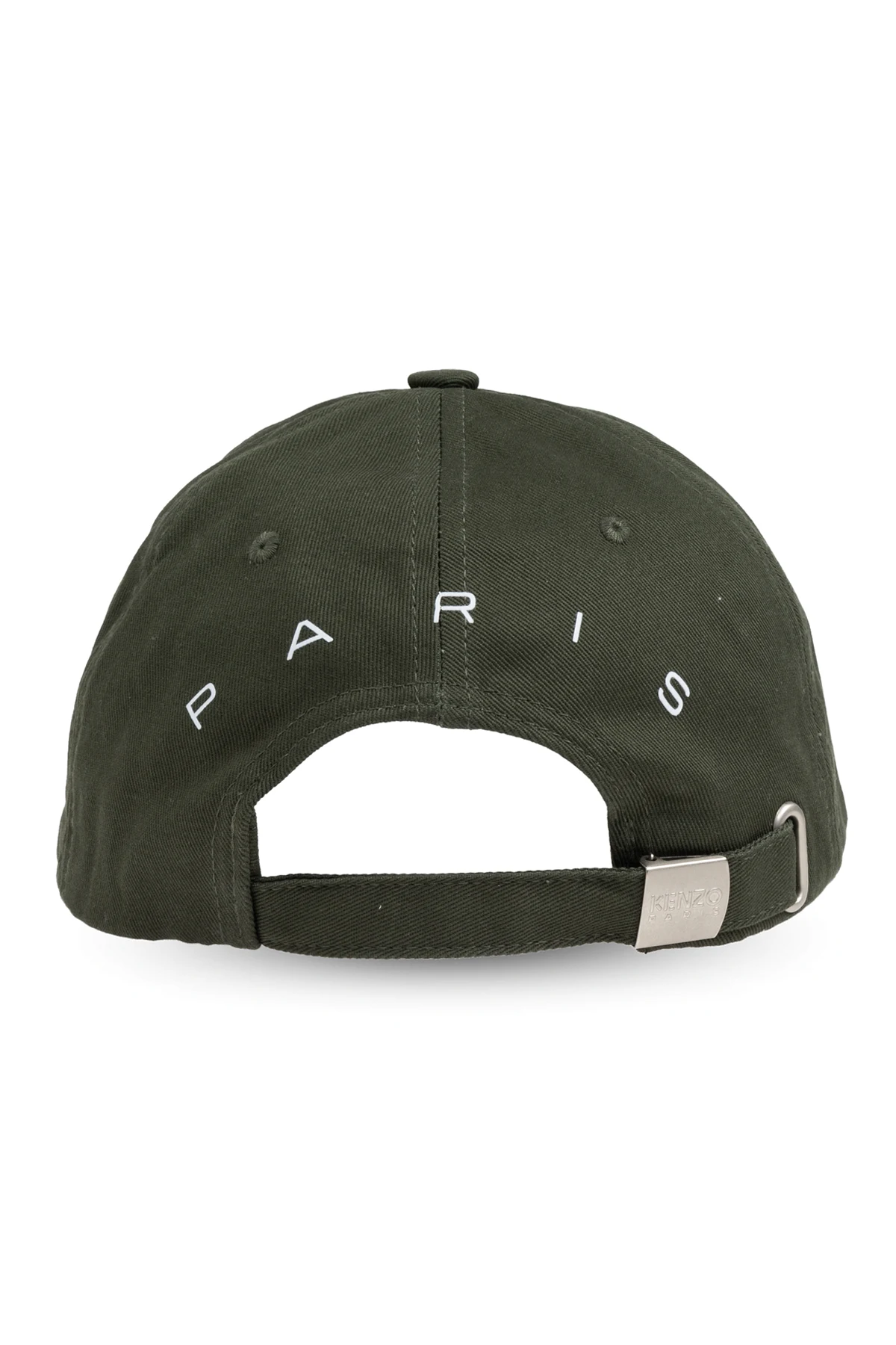 Die Kappe ist aus hochwertiger Baumwolle gefertigt und zeichnet sich durch eine glatte, matte Textur aus, die einen hohen Tragekomfort bietet. Die dominierende Farbe ist ein elegantes Dunkelgrün, und das Ganze wird durch ein großes, weißes „KENZO“-Logo auf der Vorderseite und den Schriftzug „PARIS“ auf der Rückseite ergänzt.