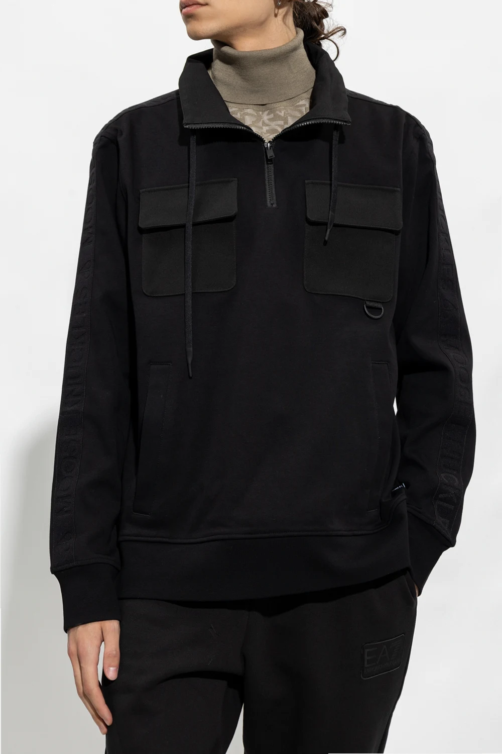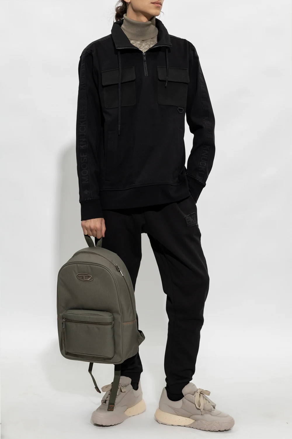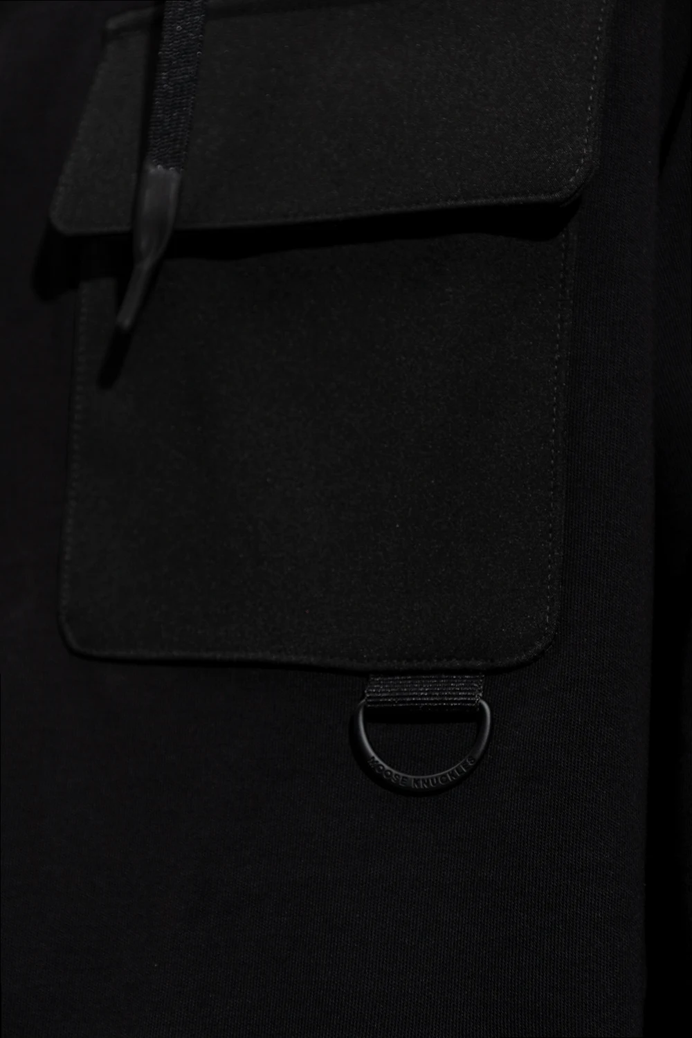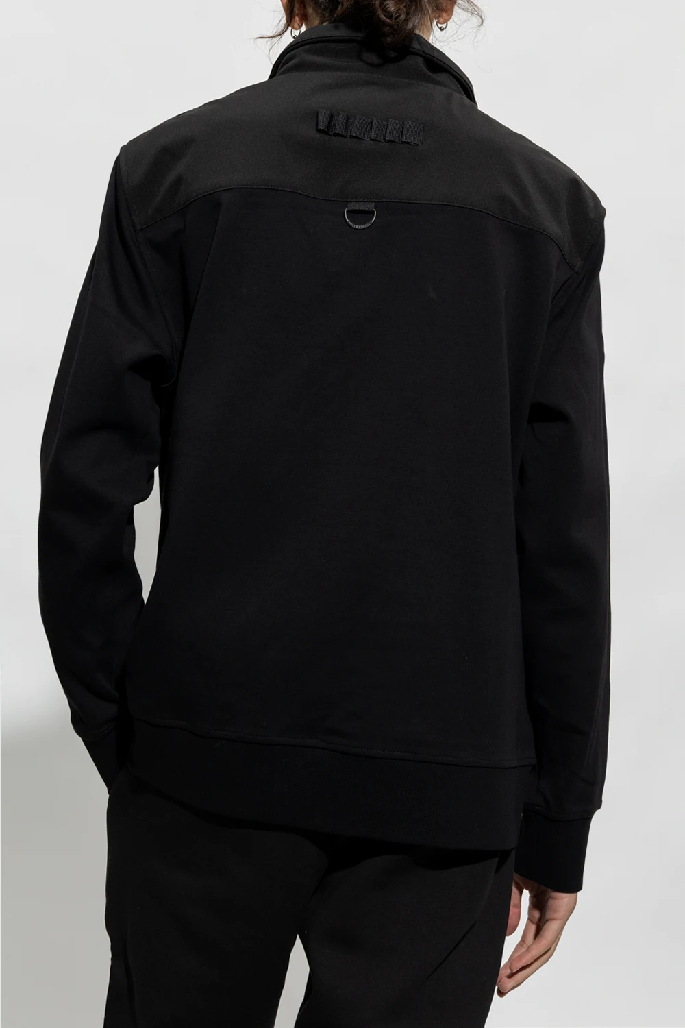 Black panelled sweatshirt from Moose Knuckles. Crafted from cotton, this style features a standing collar with a quarter-zip closure, textured inserts with an embroidered logo, four pockets on the front, including two flapped ones with a velcro closure, and ribbed trims on the bottom hem and cuffs.