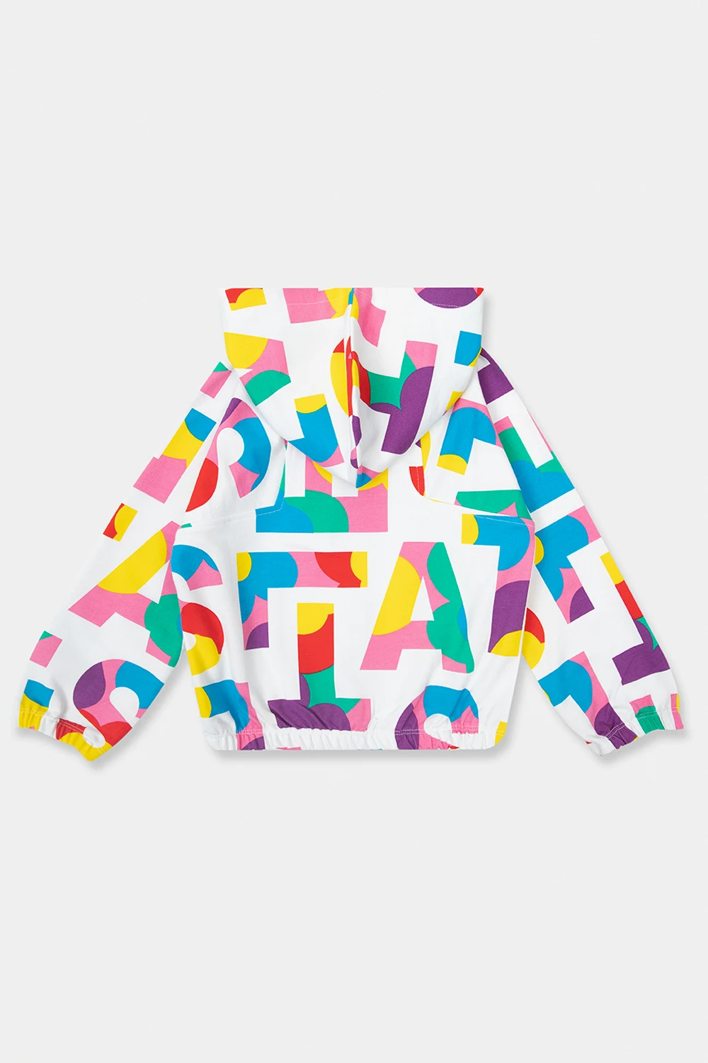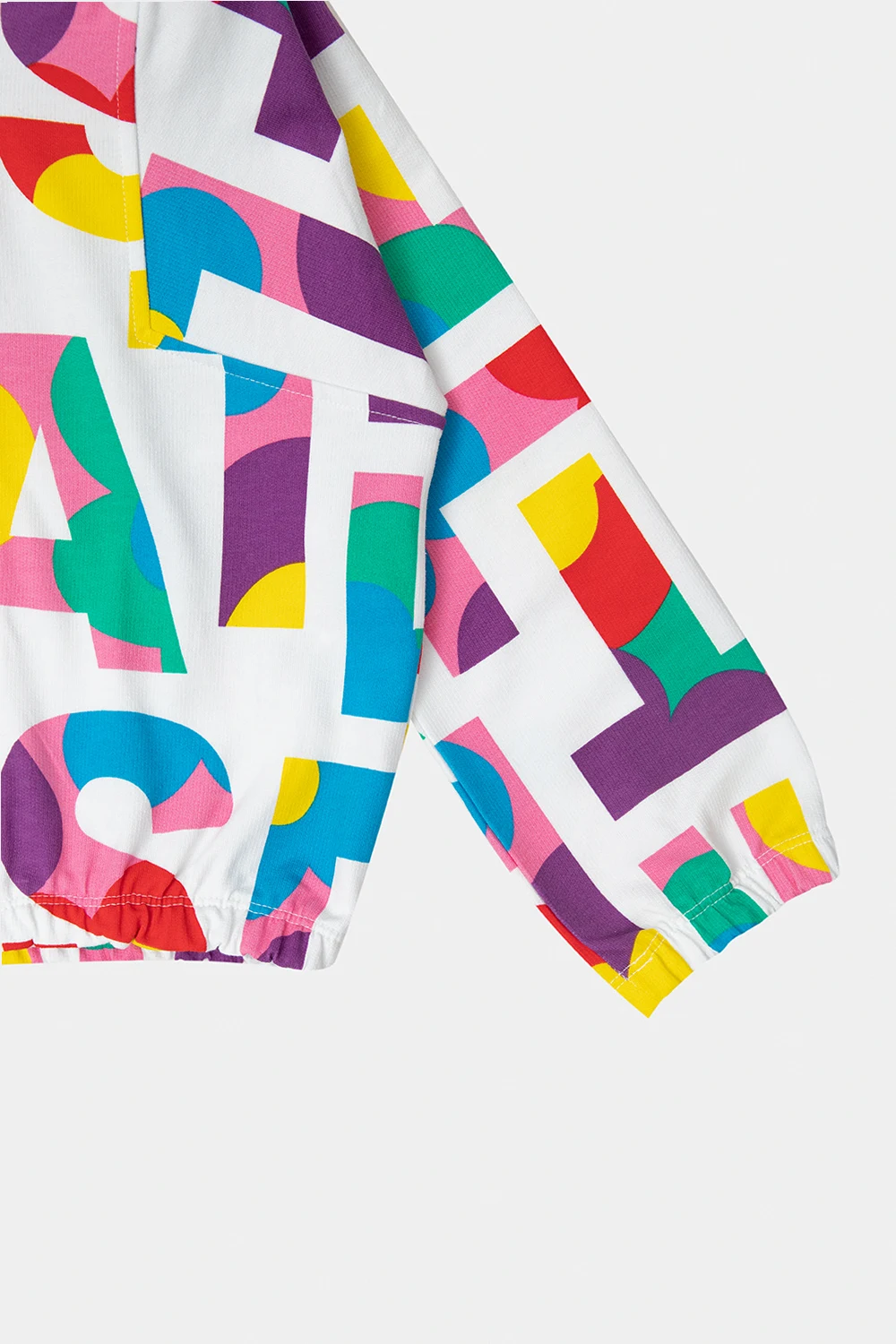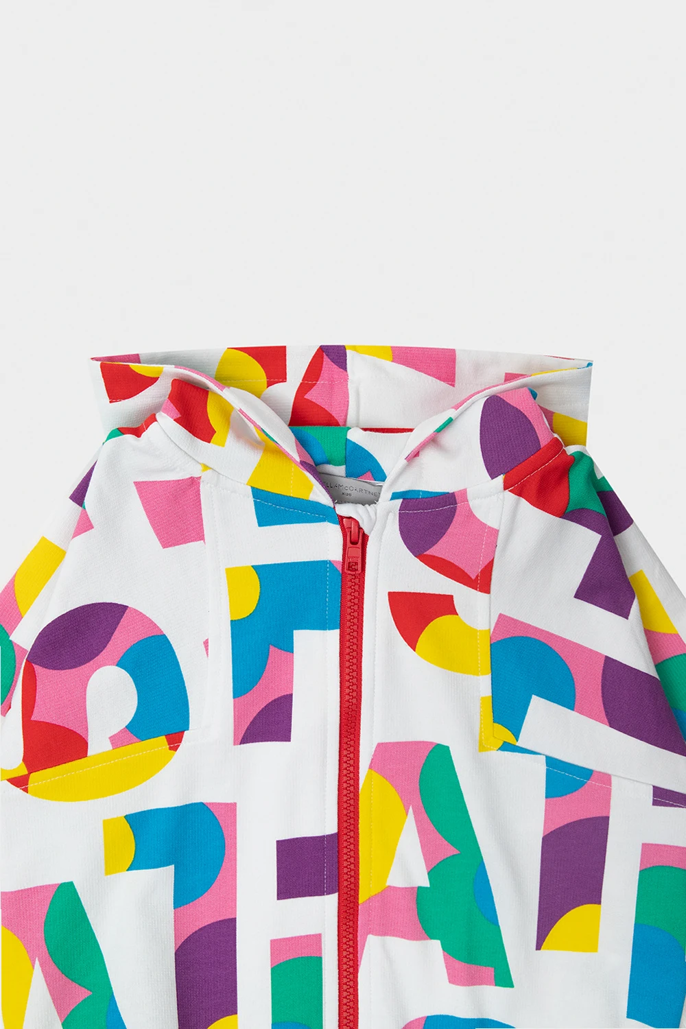 White sweatshirt from Stella McCartney Kids. Made of cotton, this garment features a zip fastening, multicolored geometric pattern and ribbed trims at the hem and cuffs.