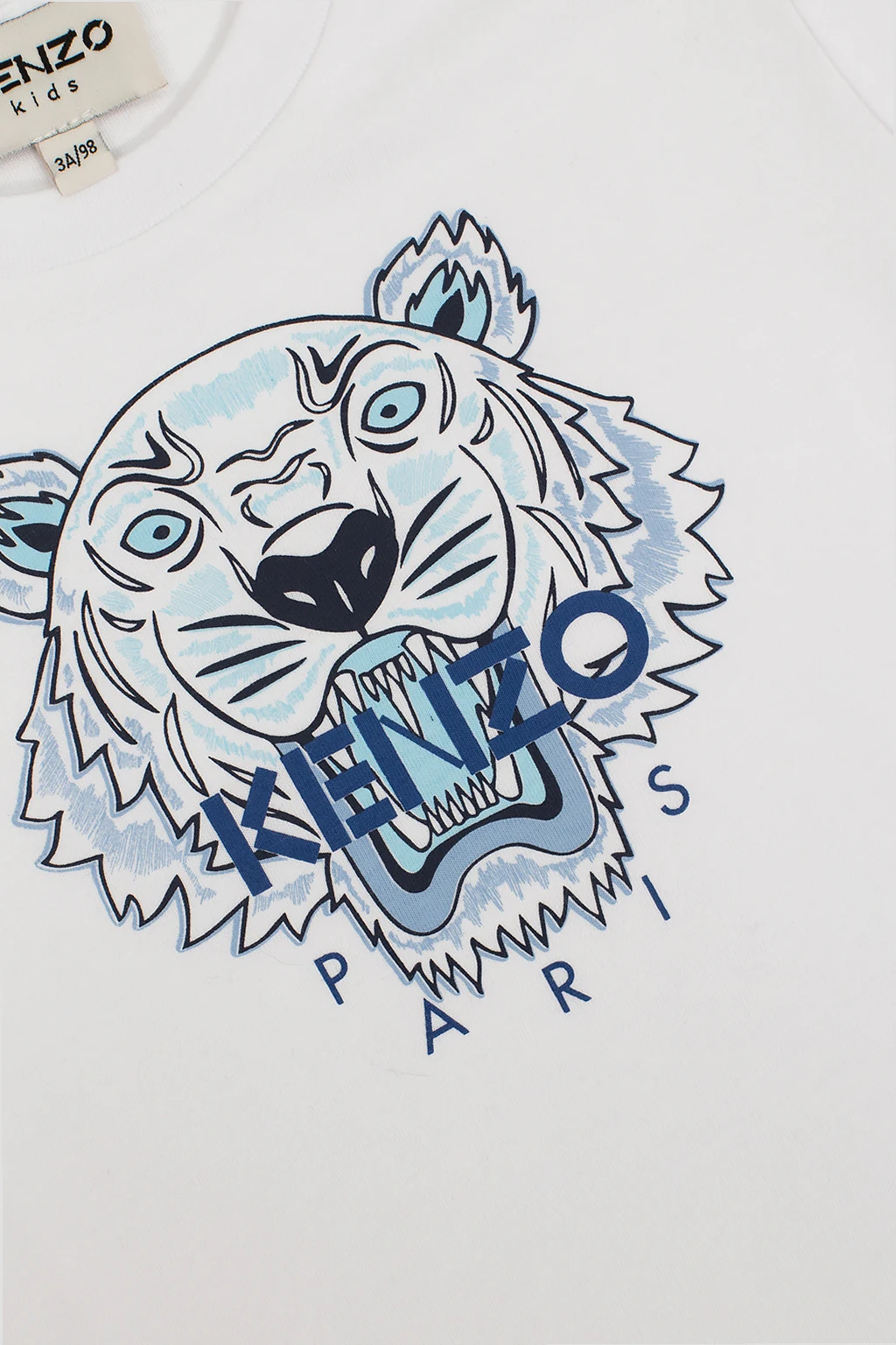 White crewneck T-shirt from Kenzo. Made of cotton, this garment features snaps at the shoulder, blue logo print, the brand’s signature tiger head and short sleeves.