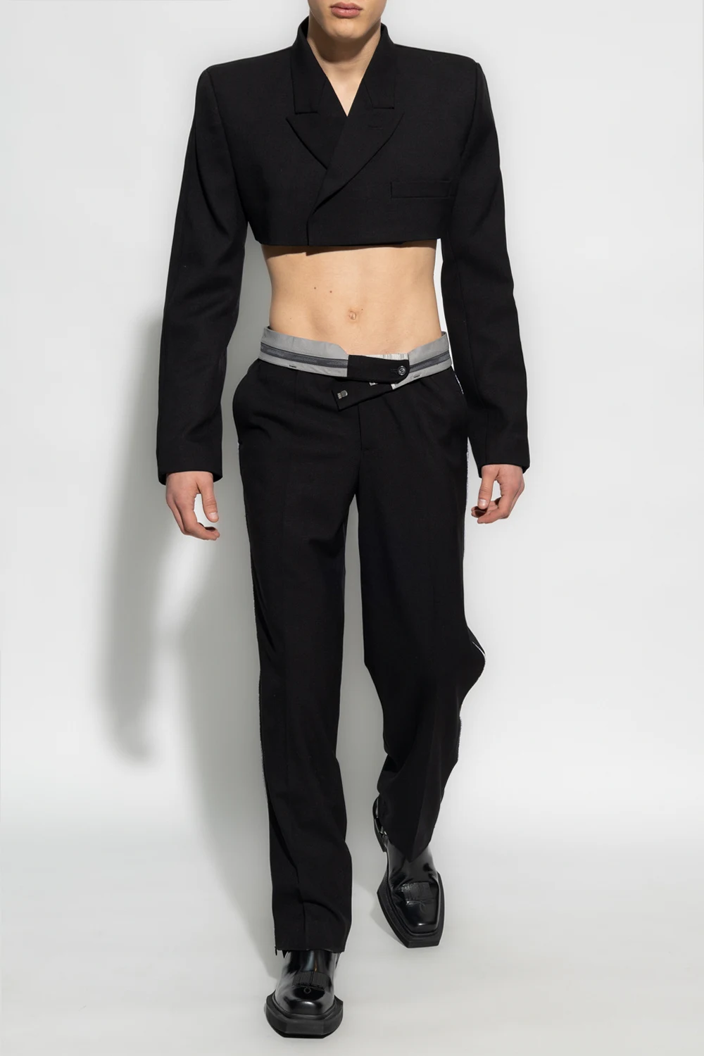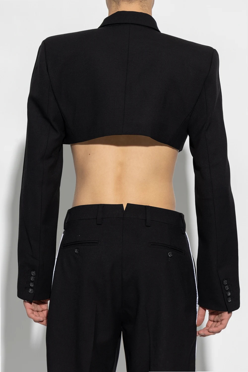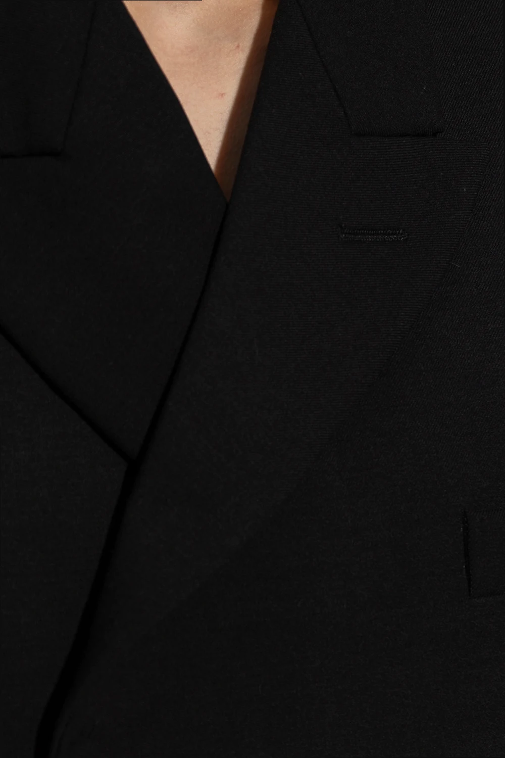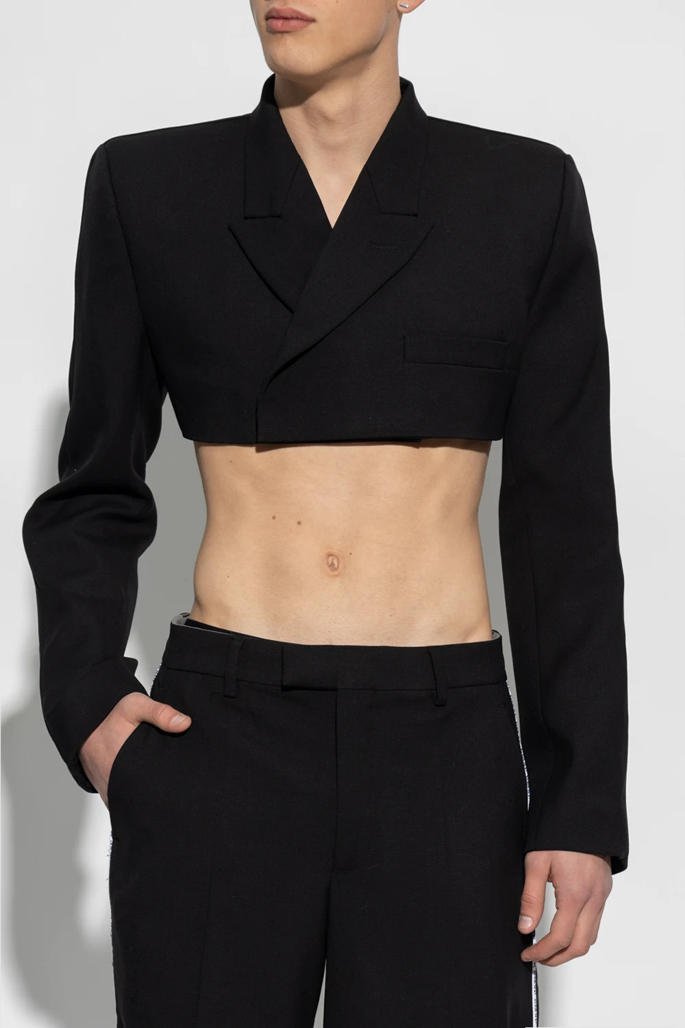 Black blazer from VTMNTS. Crafted from wool with a double-breasted, cropped silhouette, this style features button fastenings, one welt pocket, peak lapels, detachable shoulder padding and long sleeves with button cuffs.