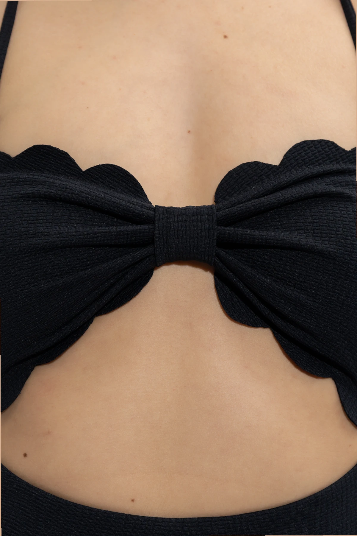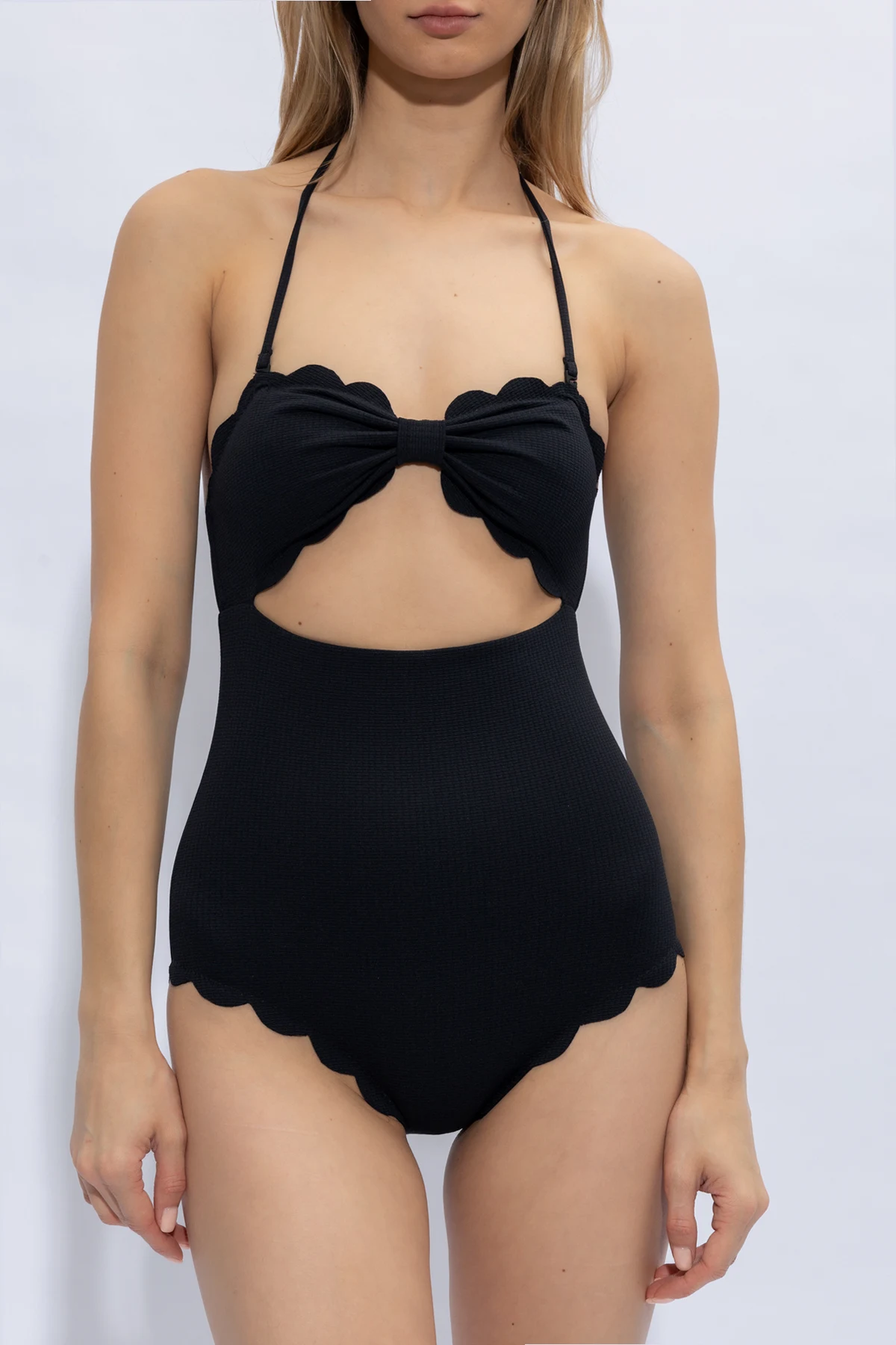Black ‘Antibes’ one-piece swimsuit from Marysia. Made of stretchy, textured fabric, this item fastens via a logo-embossed hook on the back and showcases a detachable neck strap, decorative opening and signature, hand-cut scalloped edges.