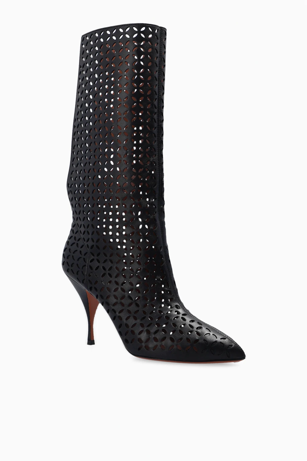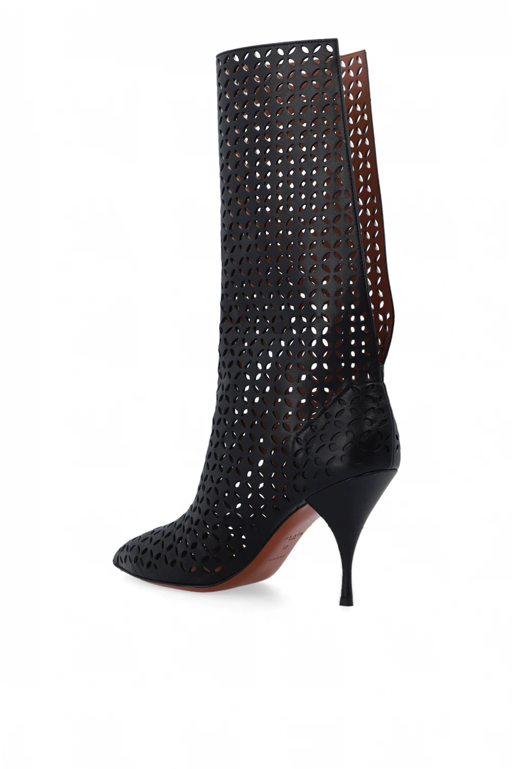 Black heeled ankle boots from Alaia. Made of lamb leather with an openwork design, this model features a pointed toe silhouette, a back split and a light brown sole in leather and rubber.