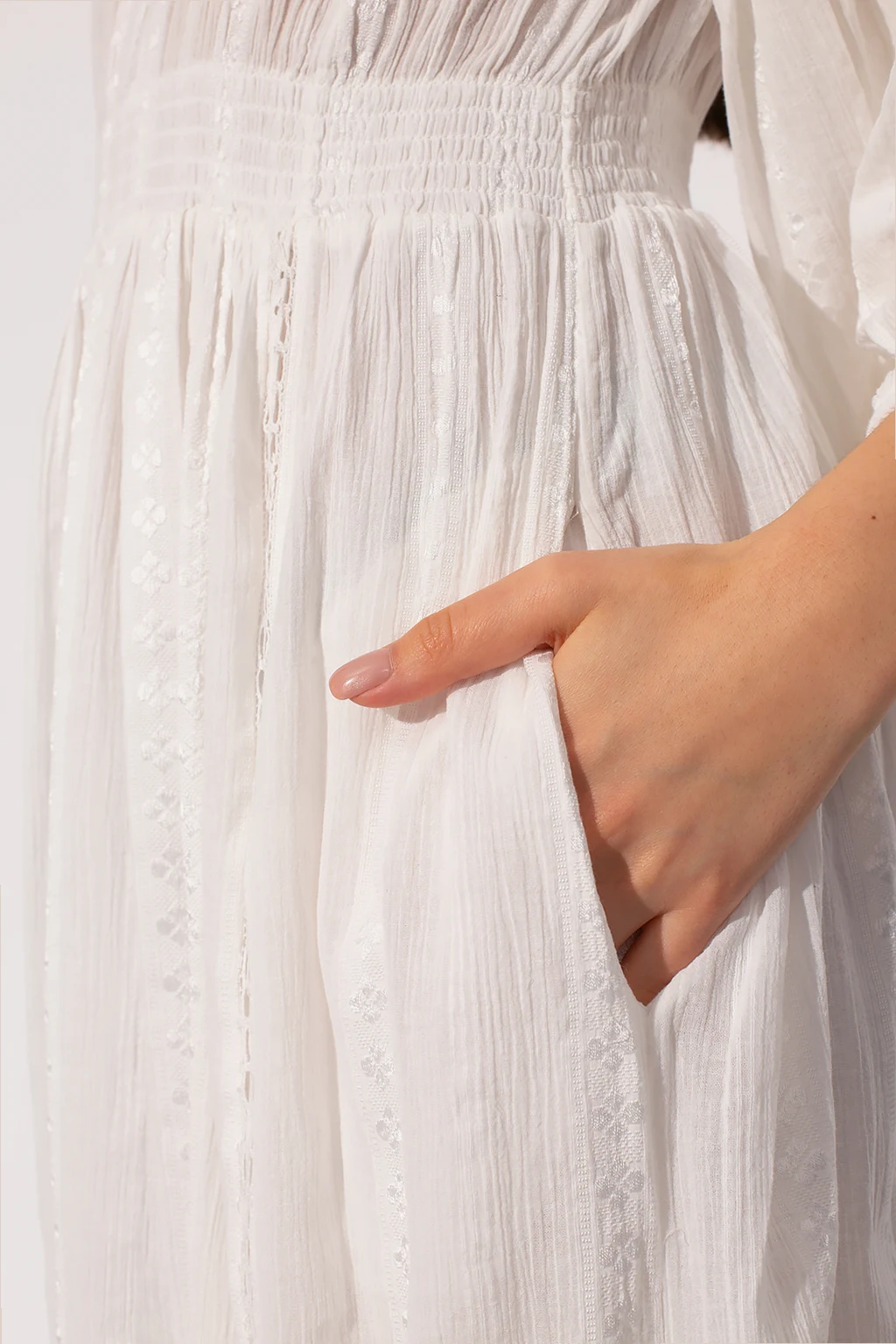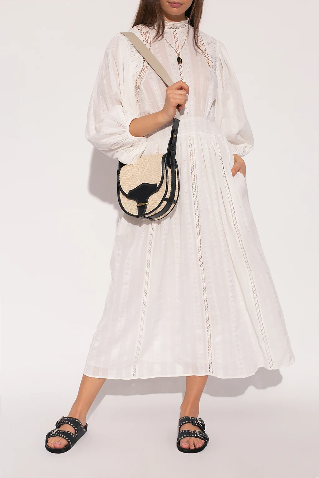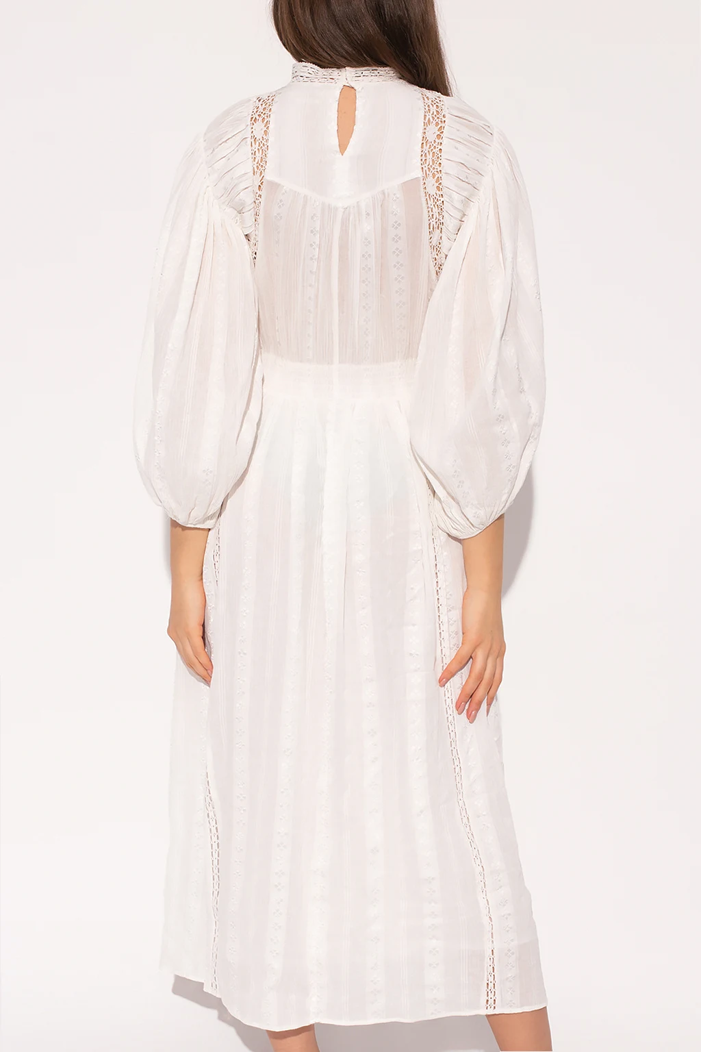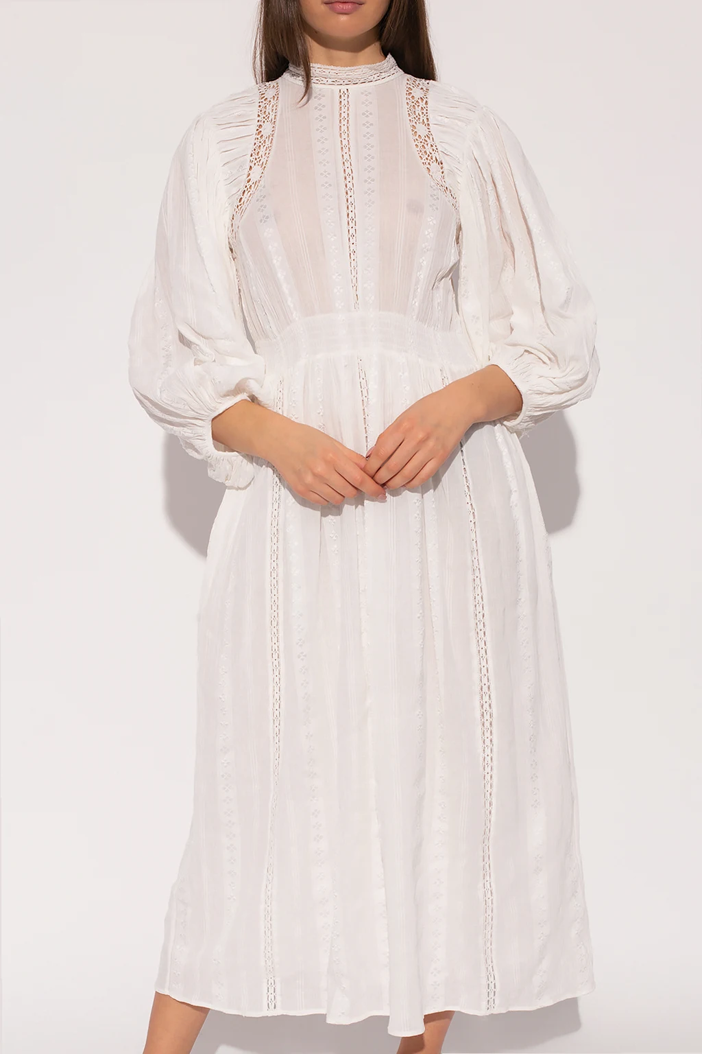 White ‘Jaena’ dress from Isabel Marant Étoile. Made of cotton, this flared design features a high neck with buttons, decorative stitching details and long puff sleeves with elasticated cuffs.