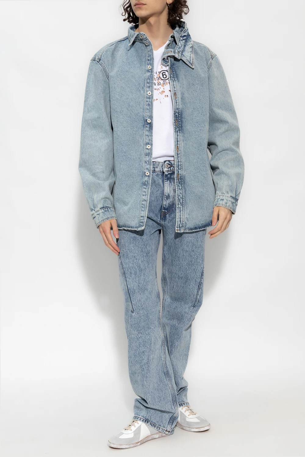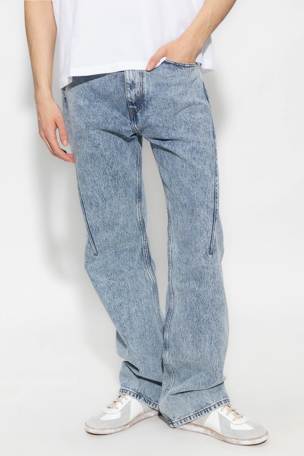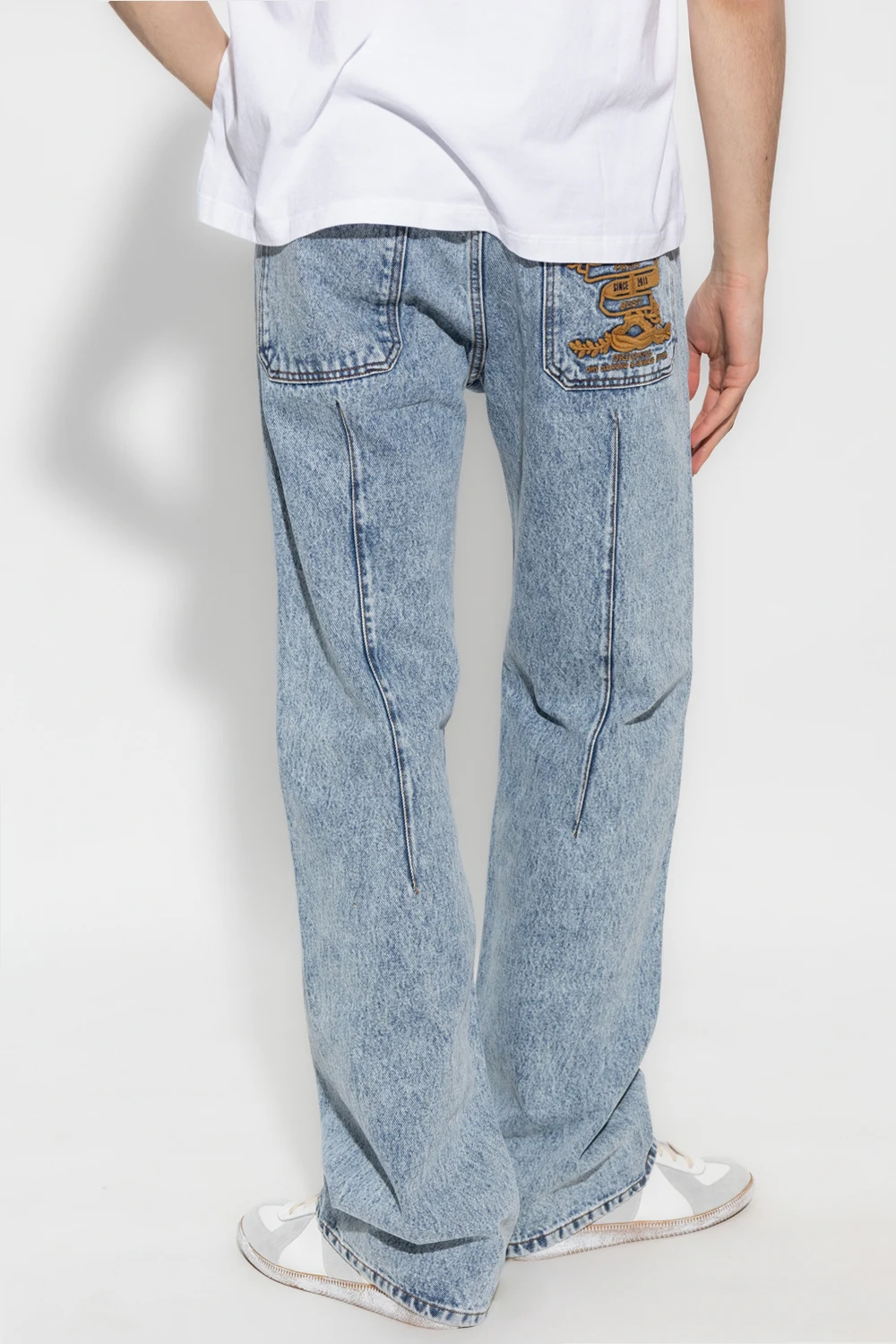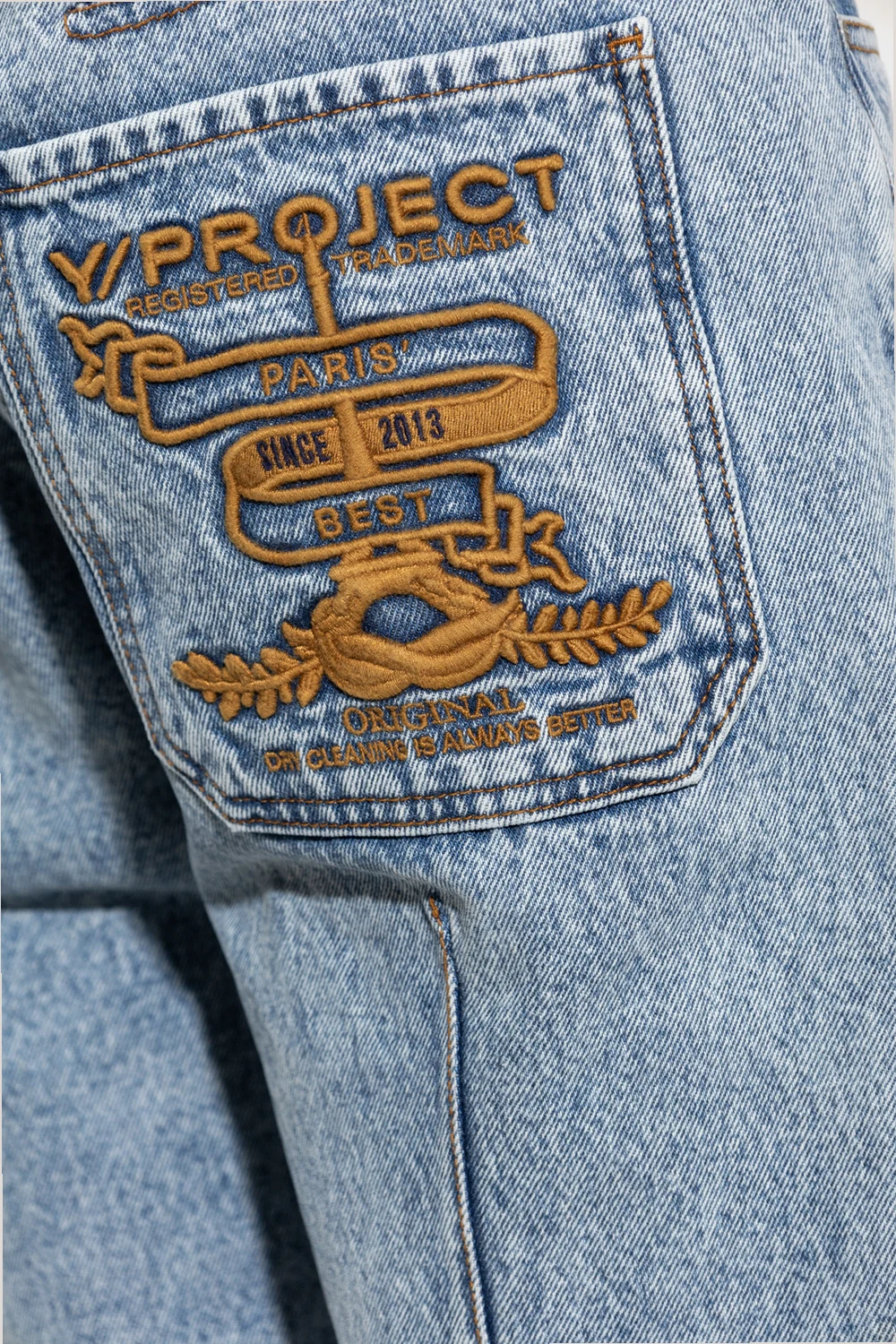 Blue jeans from Y/Project. Fastened with a zip and button, this straight leg pair features three front pockets, two back pocket with an embroidered logo pattern in beige and wide, straight legs.