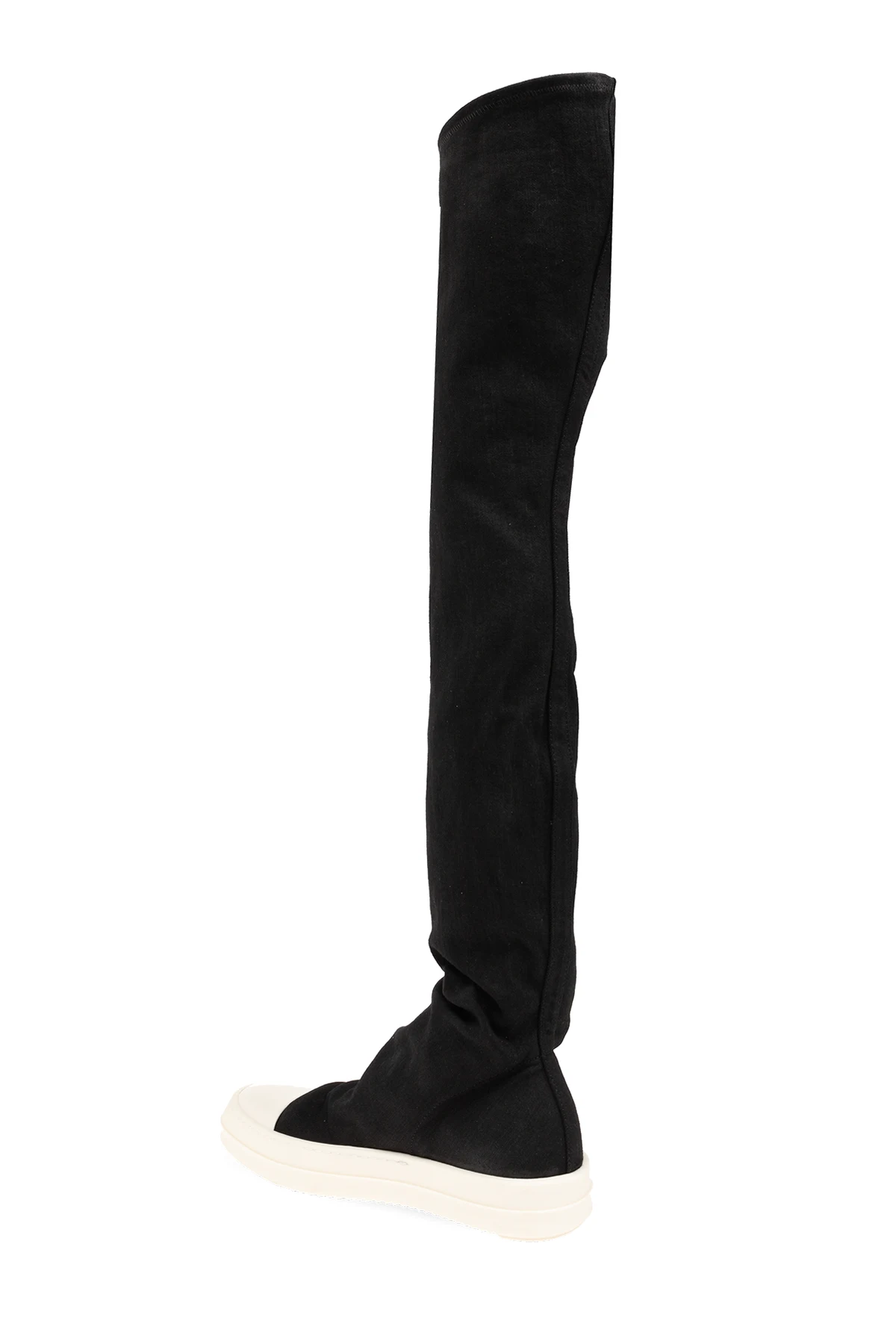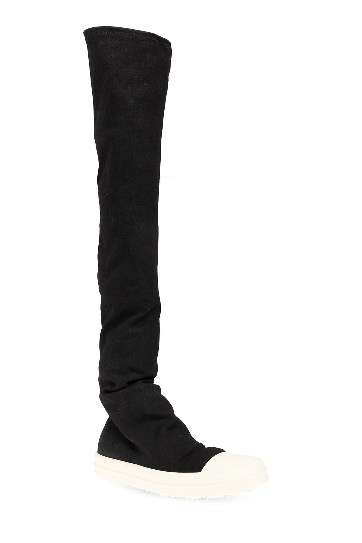 Black sneakers with over-the-knee socks from Rick Owens DRKSHDW. Made of cotton with a wax matte finish, this pair is set on a cream platform sole.
