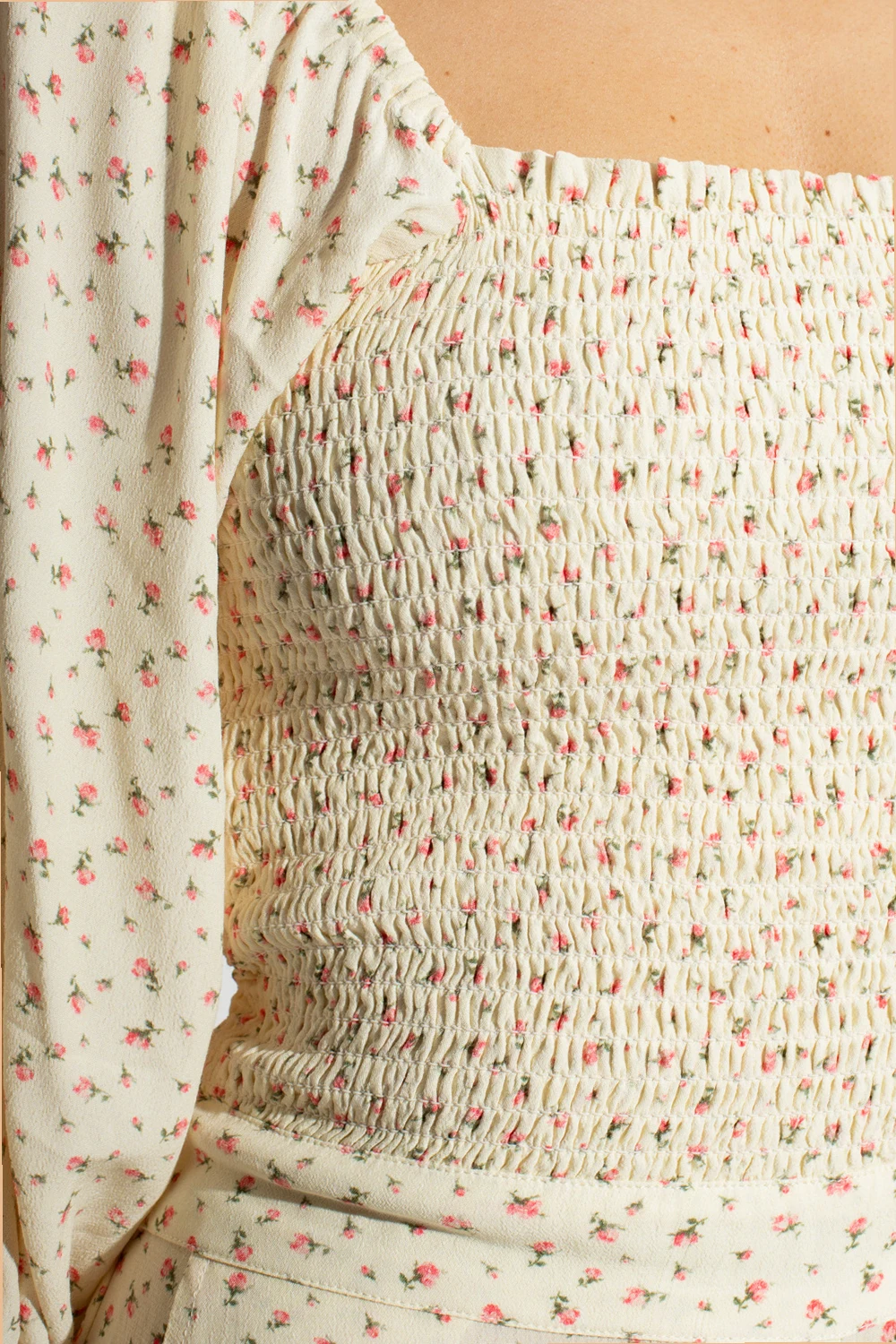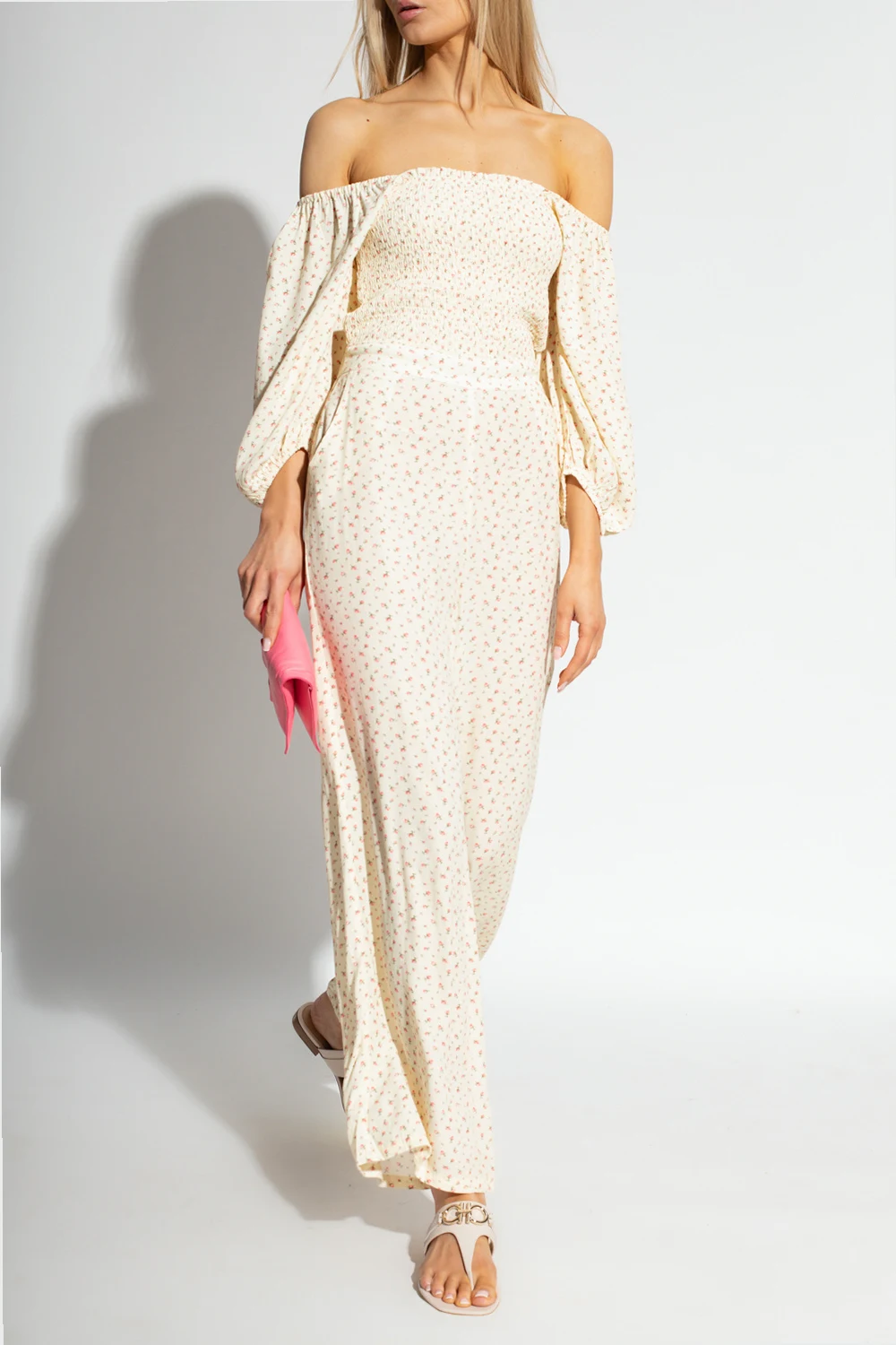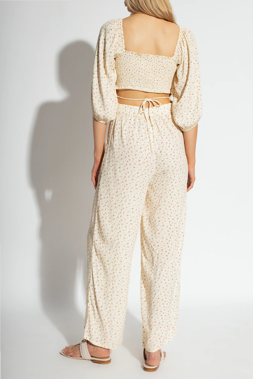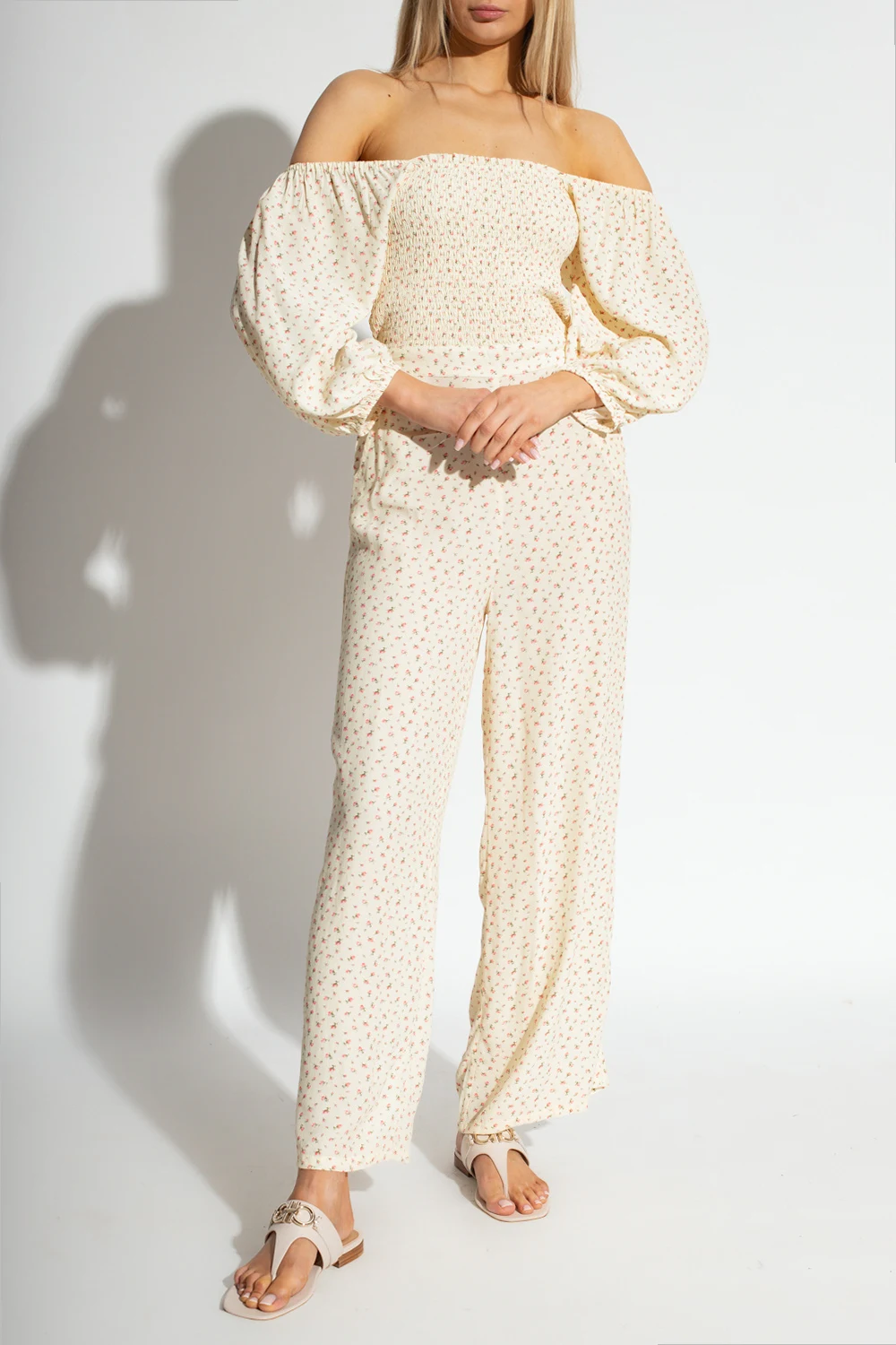 Cream ‘Dolly’ floral jumpsuit from Notes Du Nord. Made in part from ECOVERO, this garment features drawstrings at the back, concealed zip, elasticated waistband, pink and green floral motif, fitted top with a square neck and low cut back, puff sleeves with elasticated cuffs, two slip pockets and loose-fitting legs.
