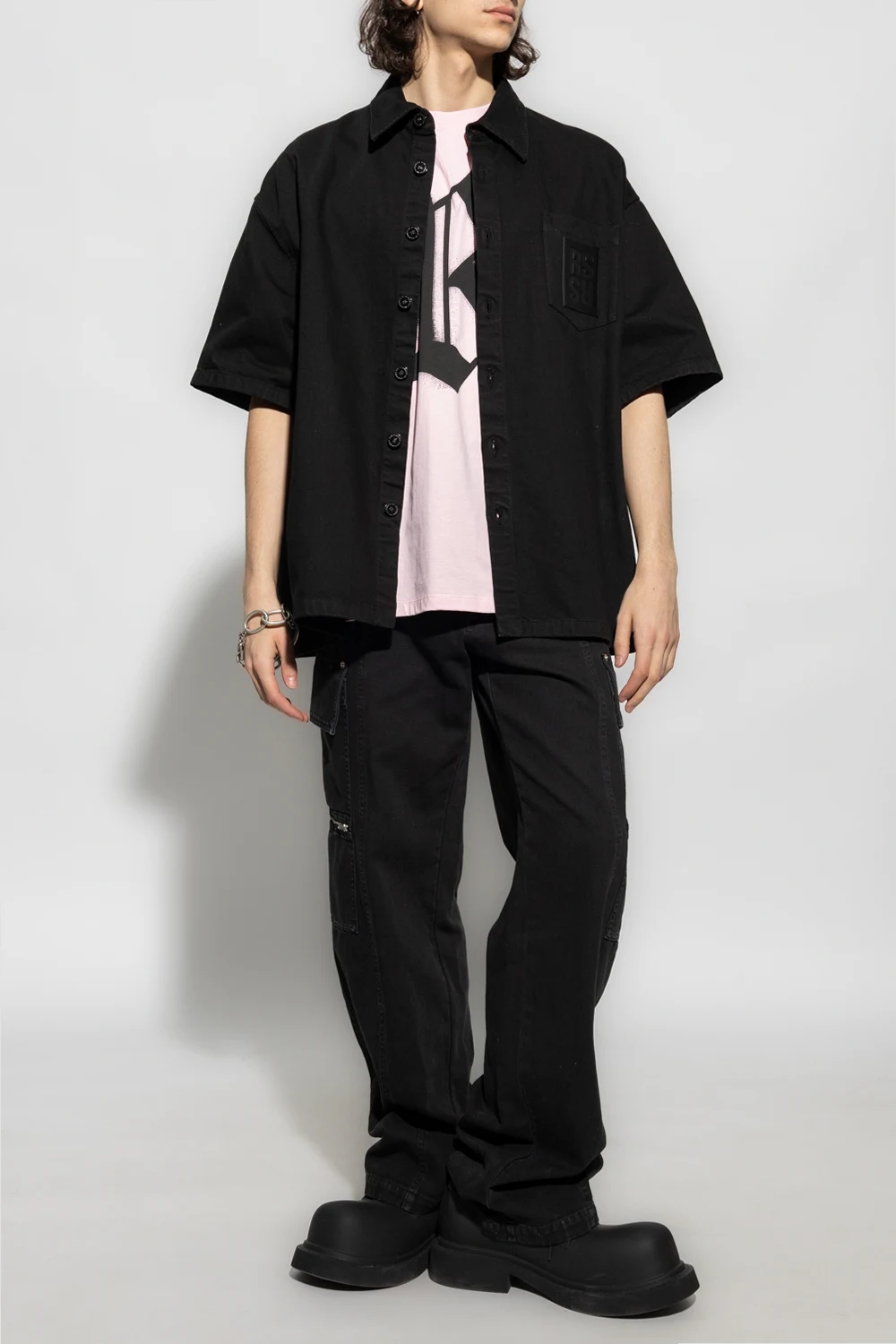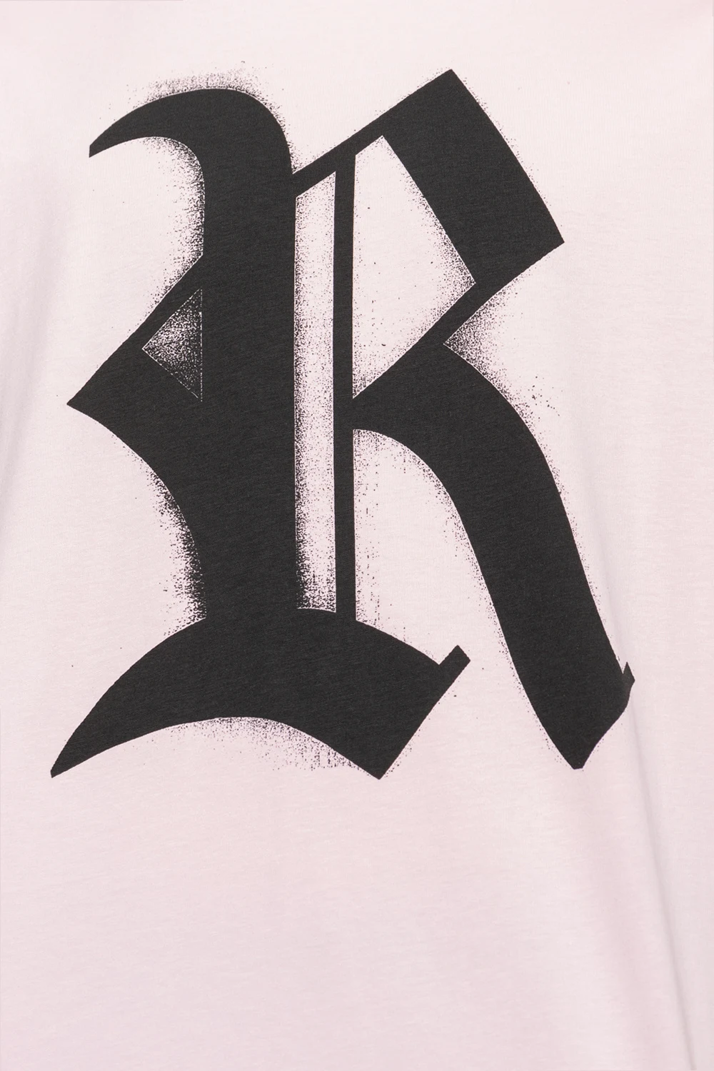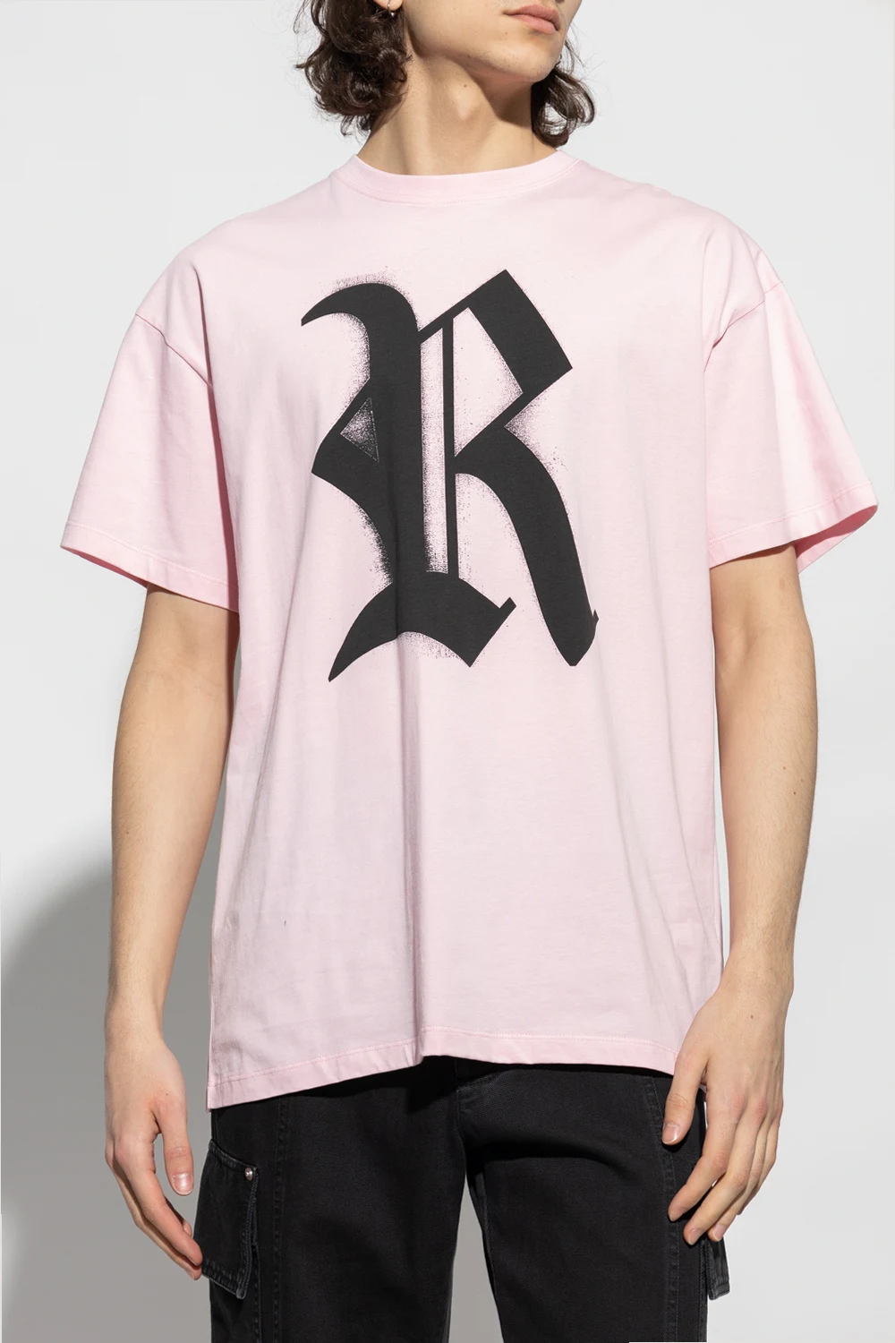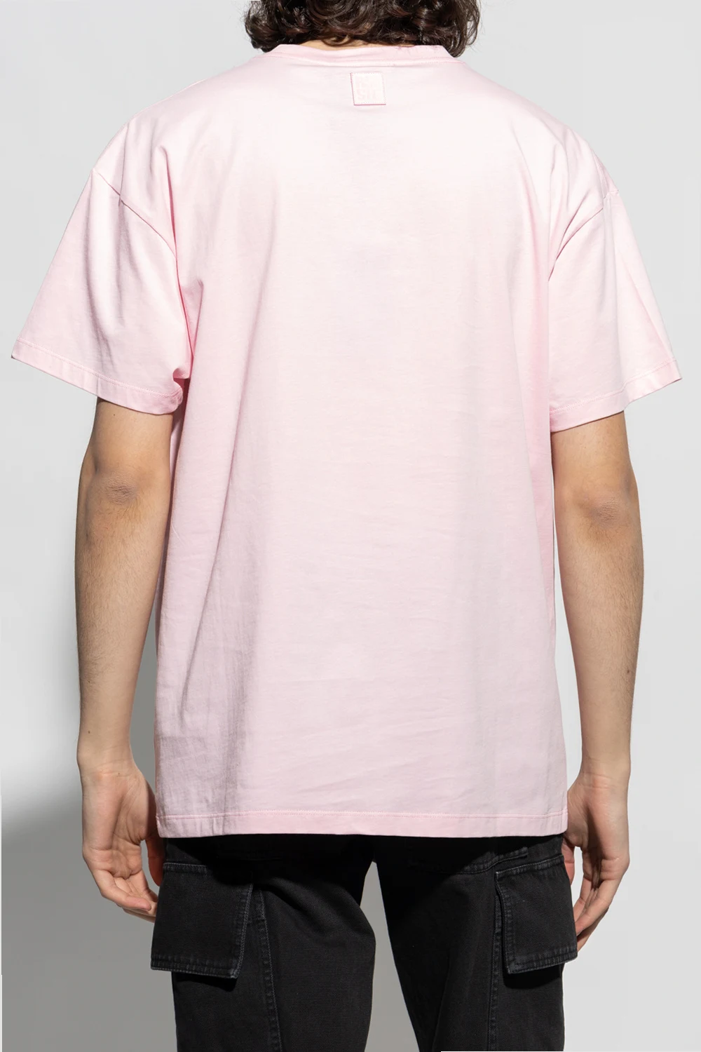 Light pink crewneck T-shirt from Raf Simons. Made of cotton, this style features short sleeves, a printed black logo on the front and a logo patch at the back.