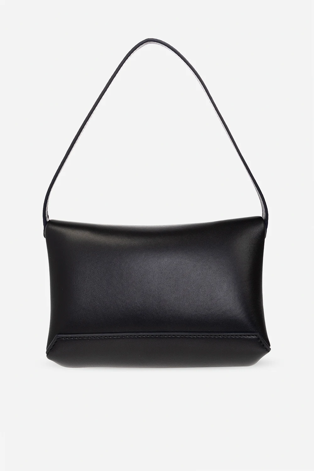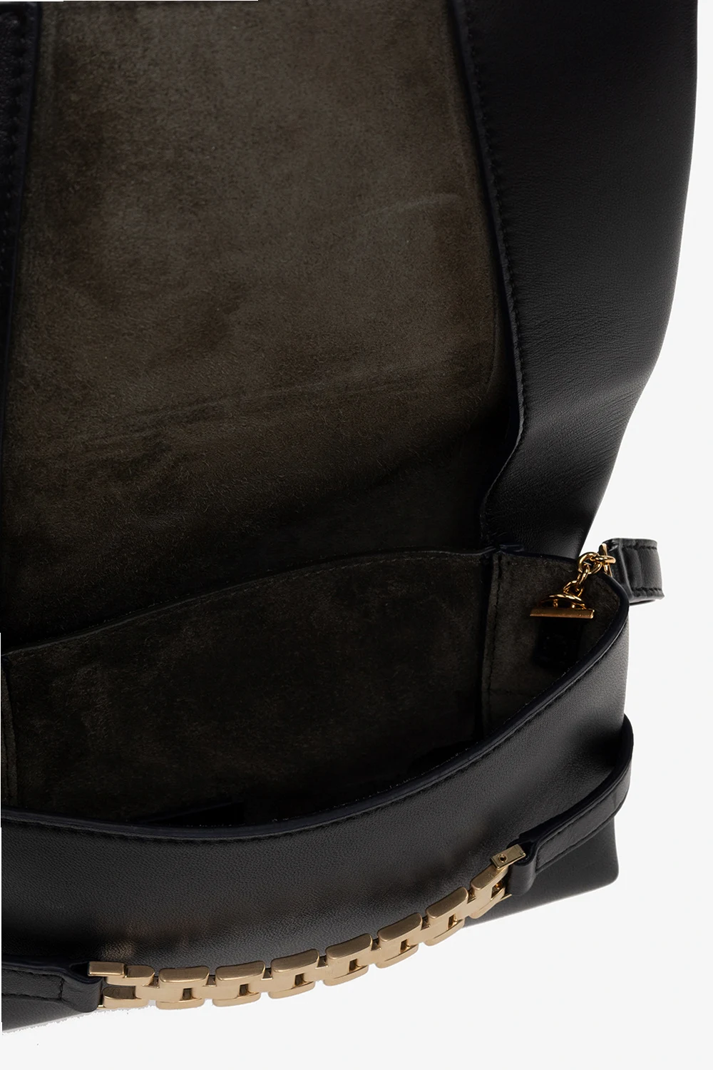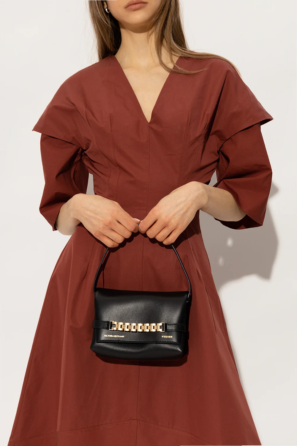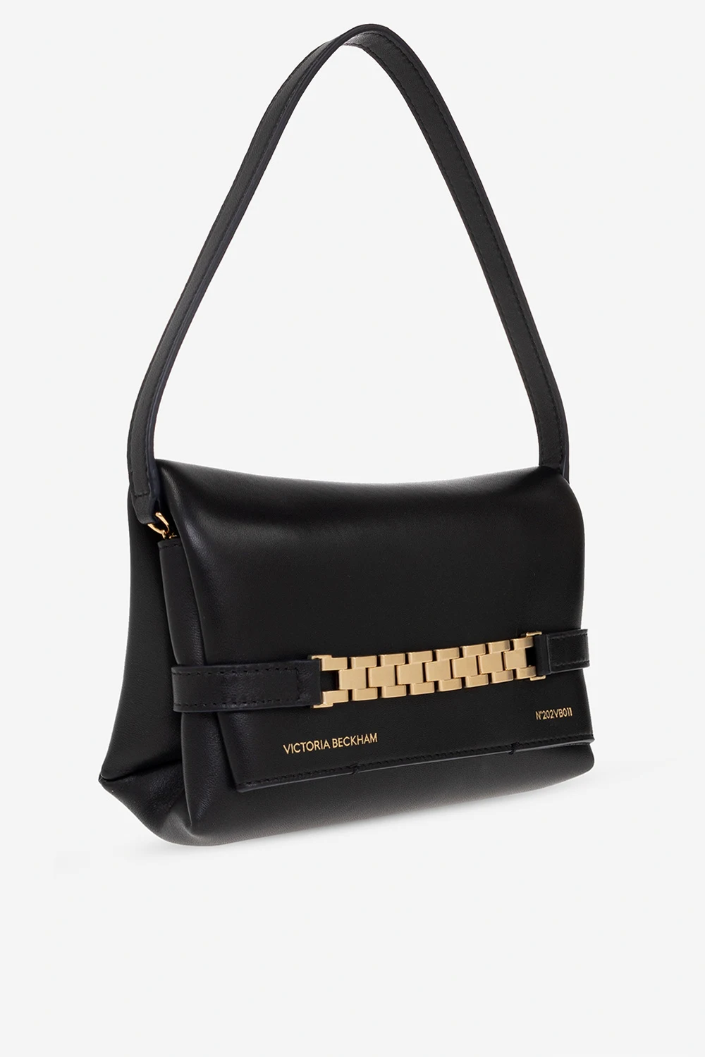 Black handbag from Victoria Beckham. Made of lamb leather, this design secures with a flap and showcases an embossed logo, a hand strap, gold-tone metal hardware and two internal compartments.