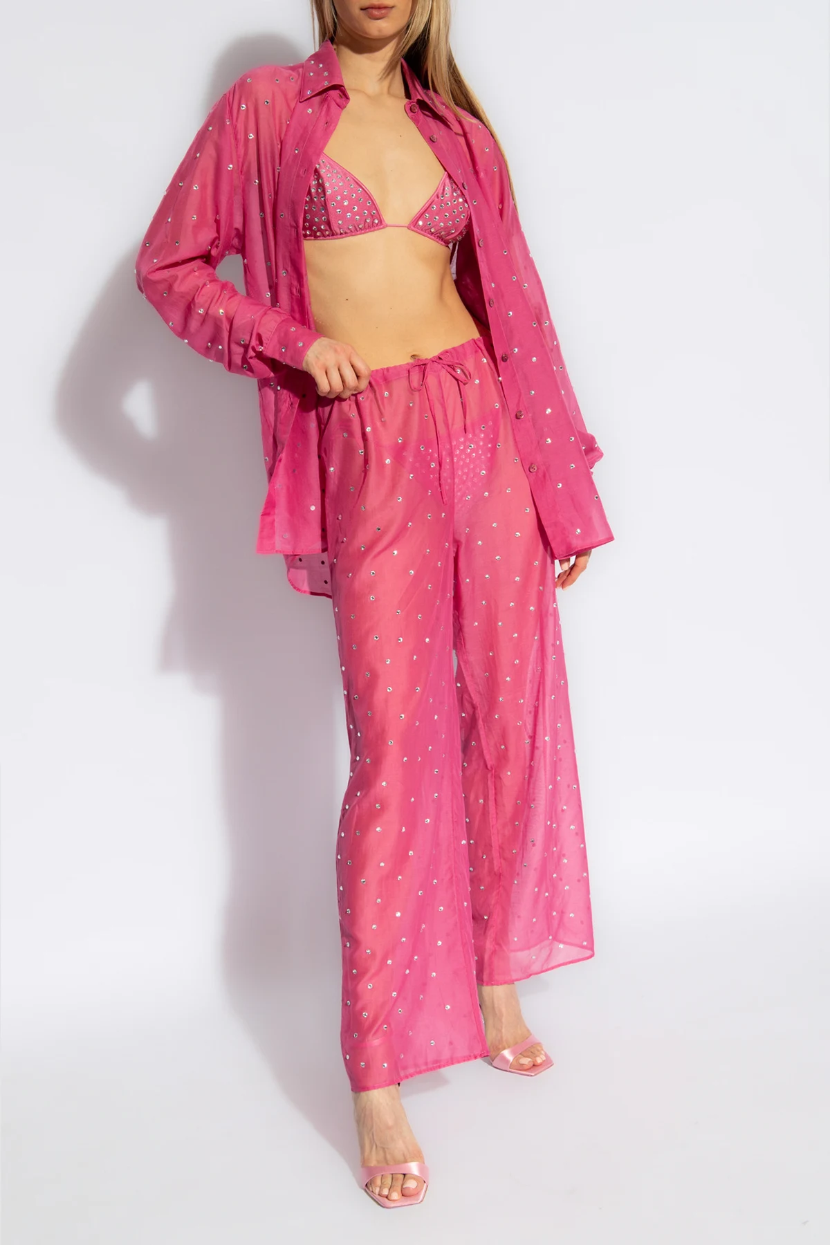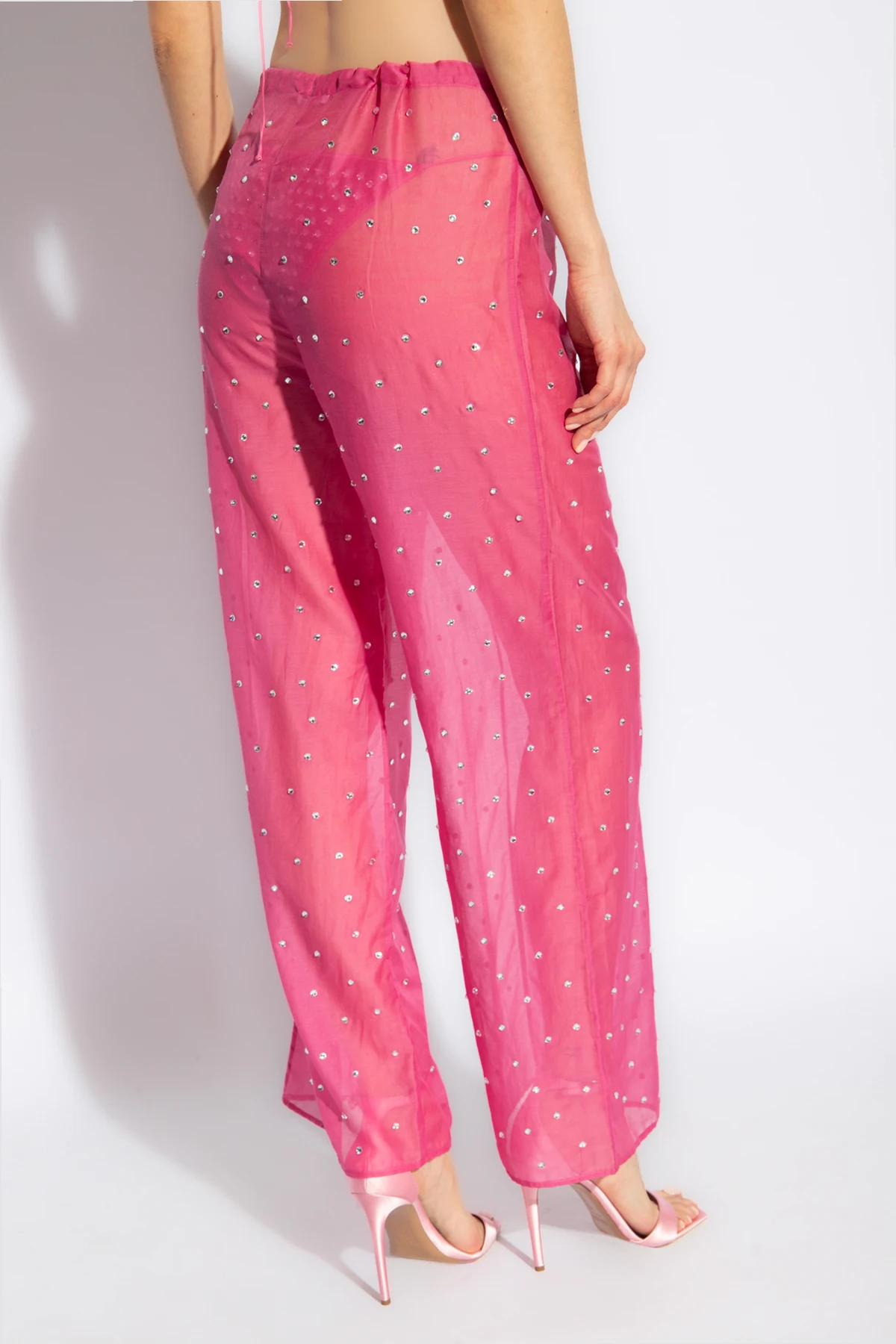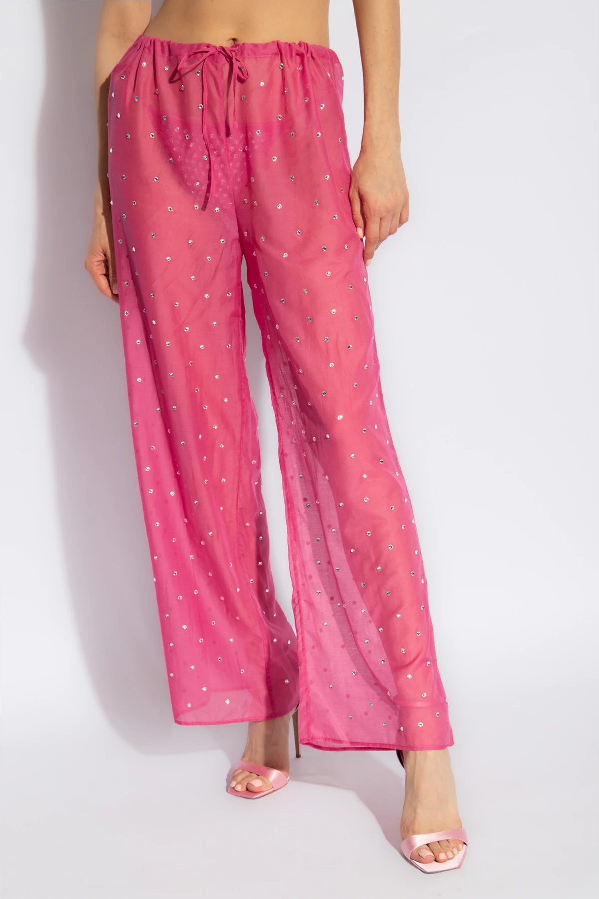 Pink trousers from Oseree. Made from a cotton and silk blend, this pair falls with wide, straight legs and showcases sparkling crystals and a drawstring waist.