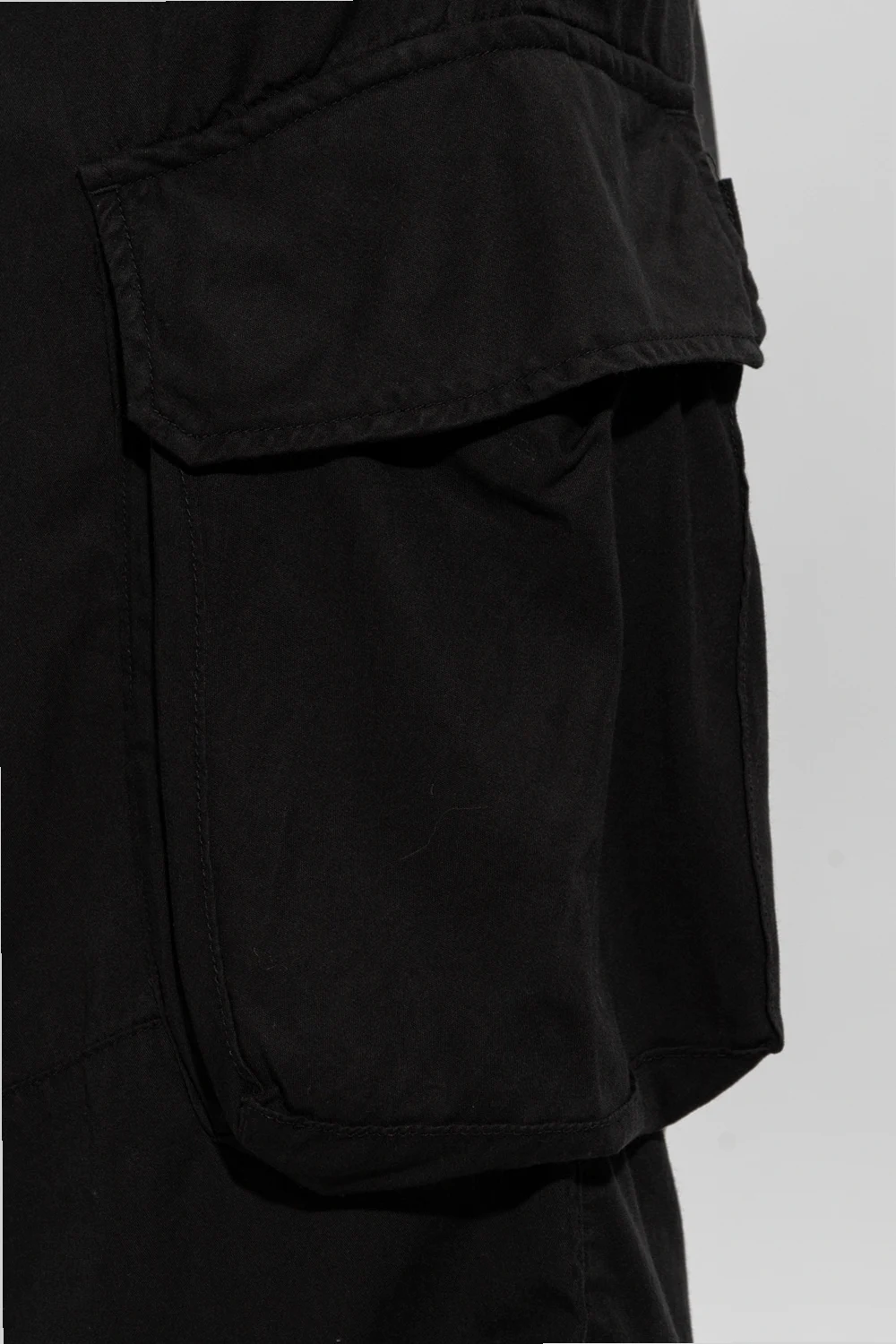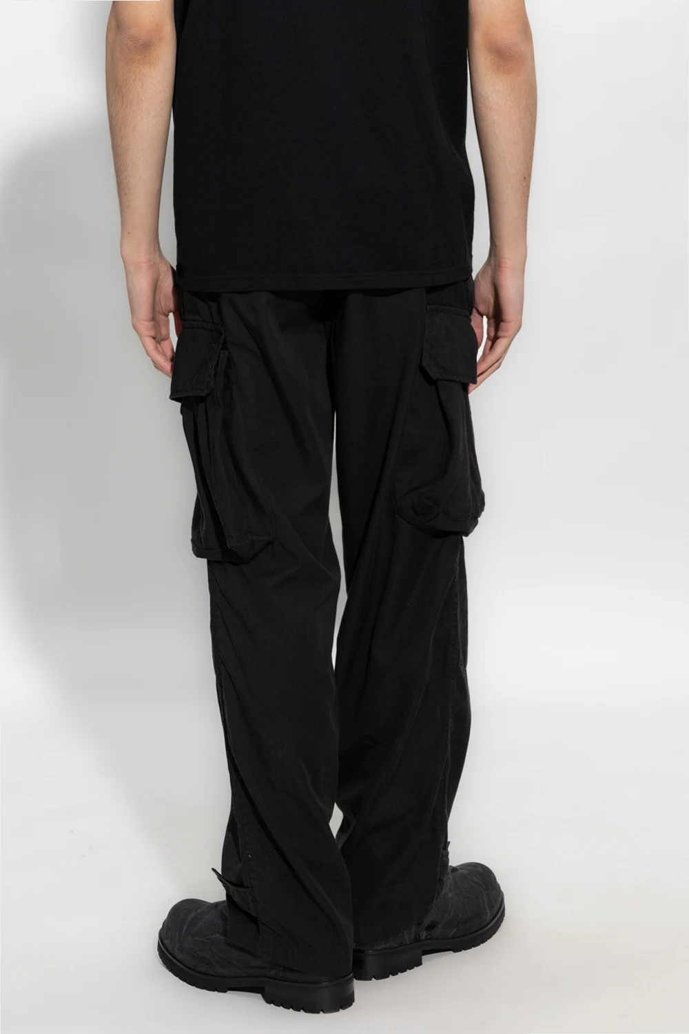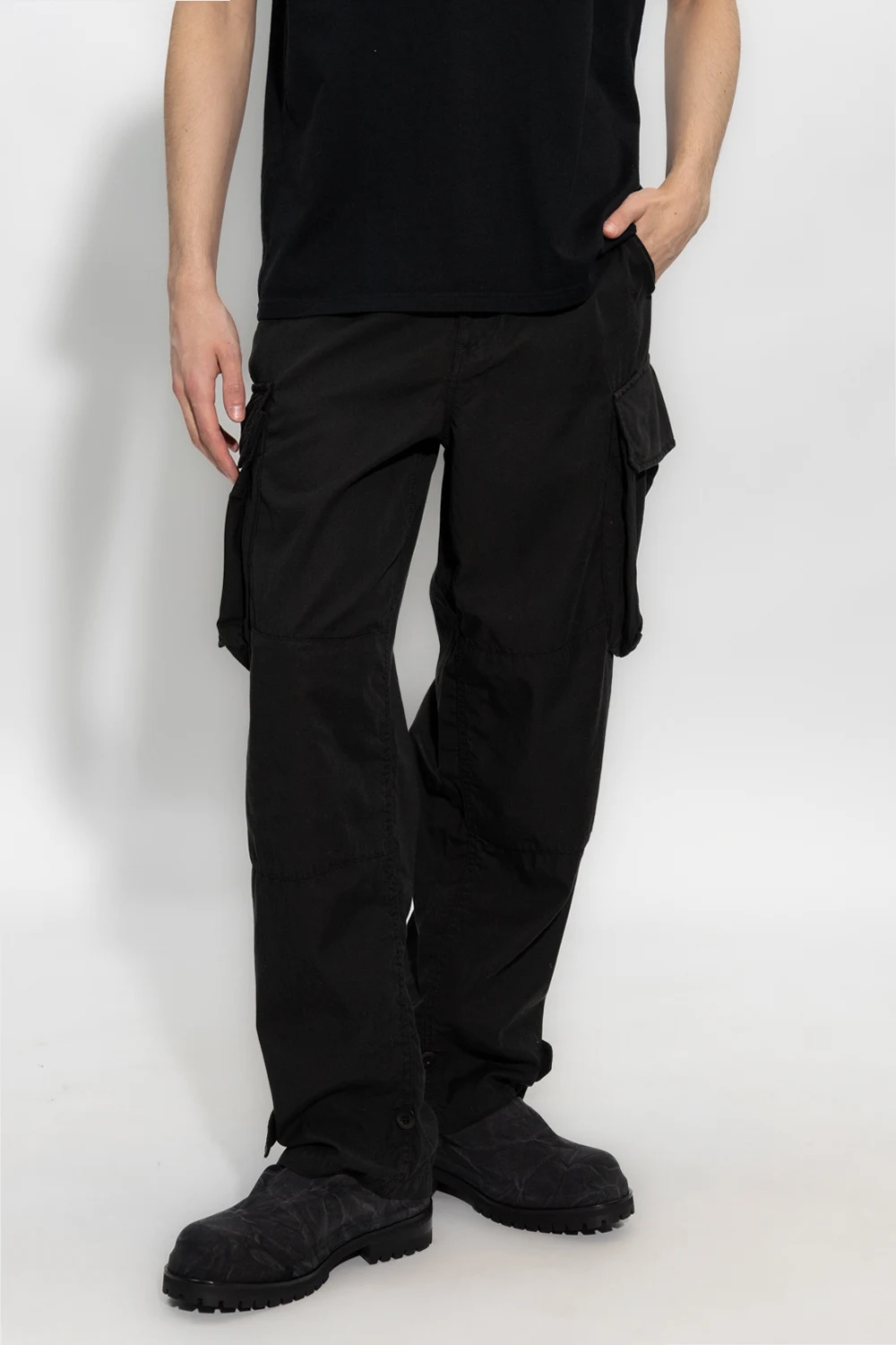 Black trousers from Undercover. Fastened with a zip and buttons, this pair falls down with slightly tapered legs with multiple pockets.