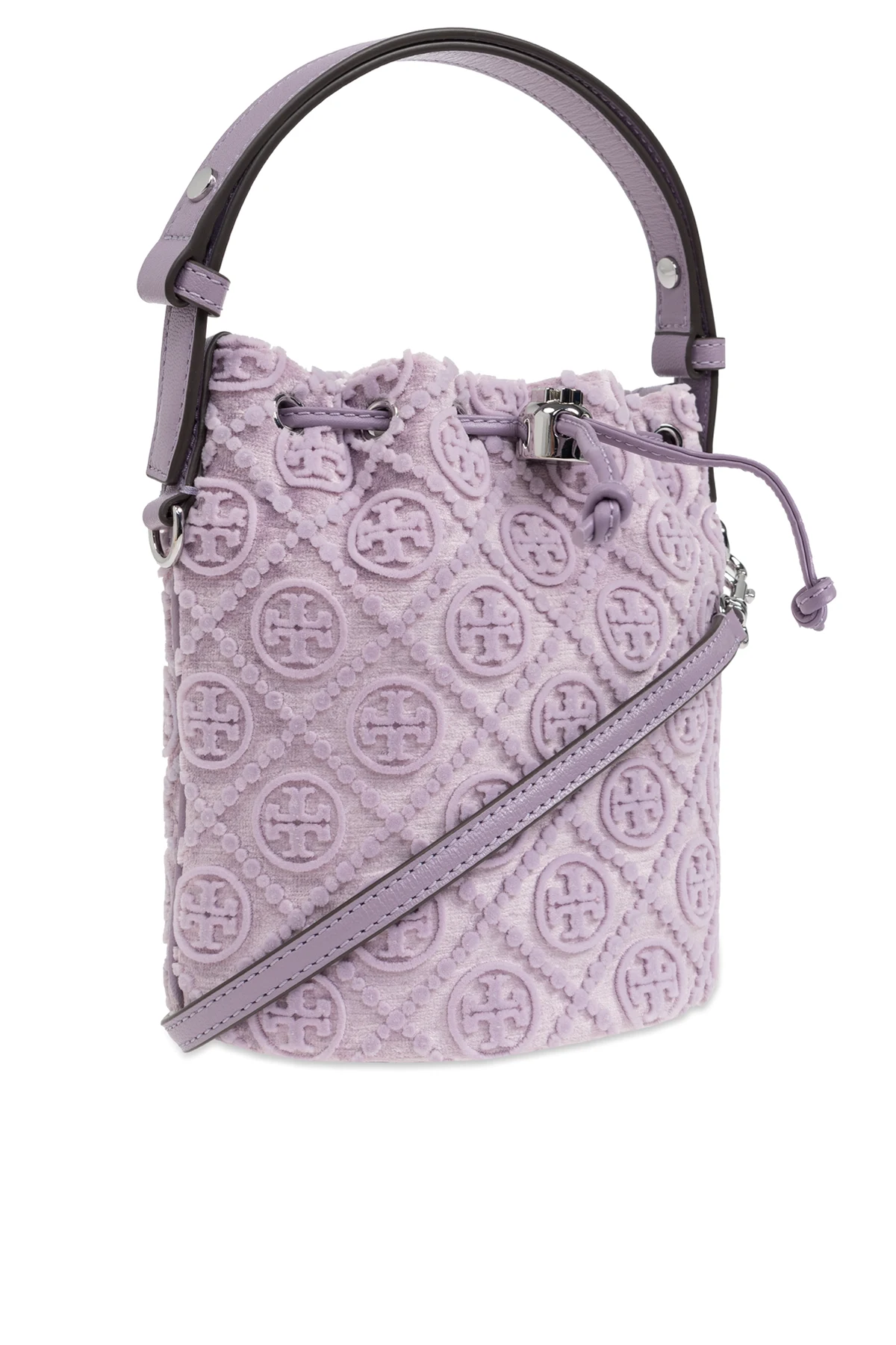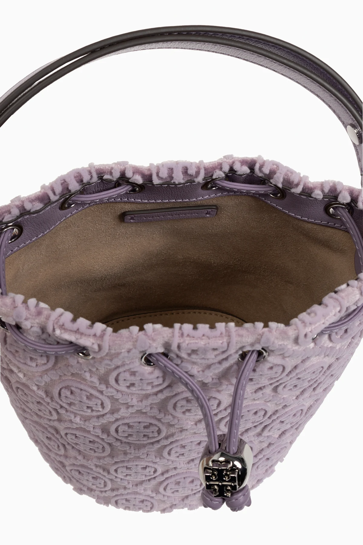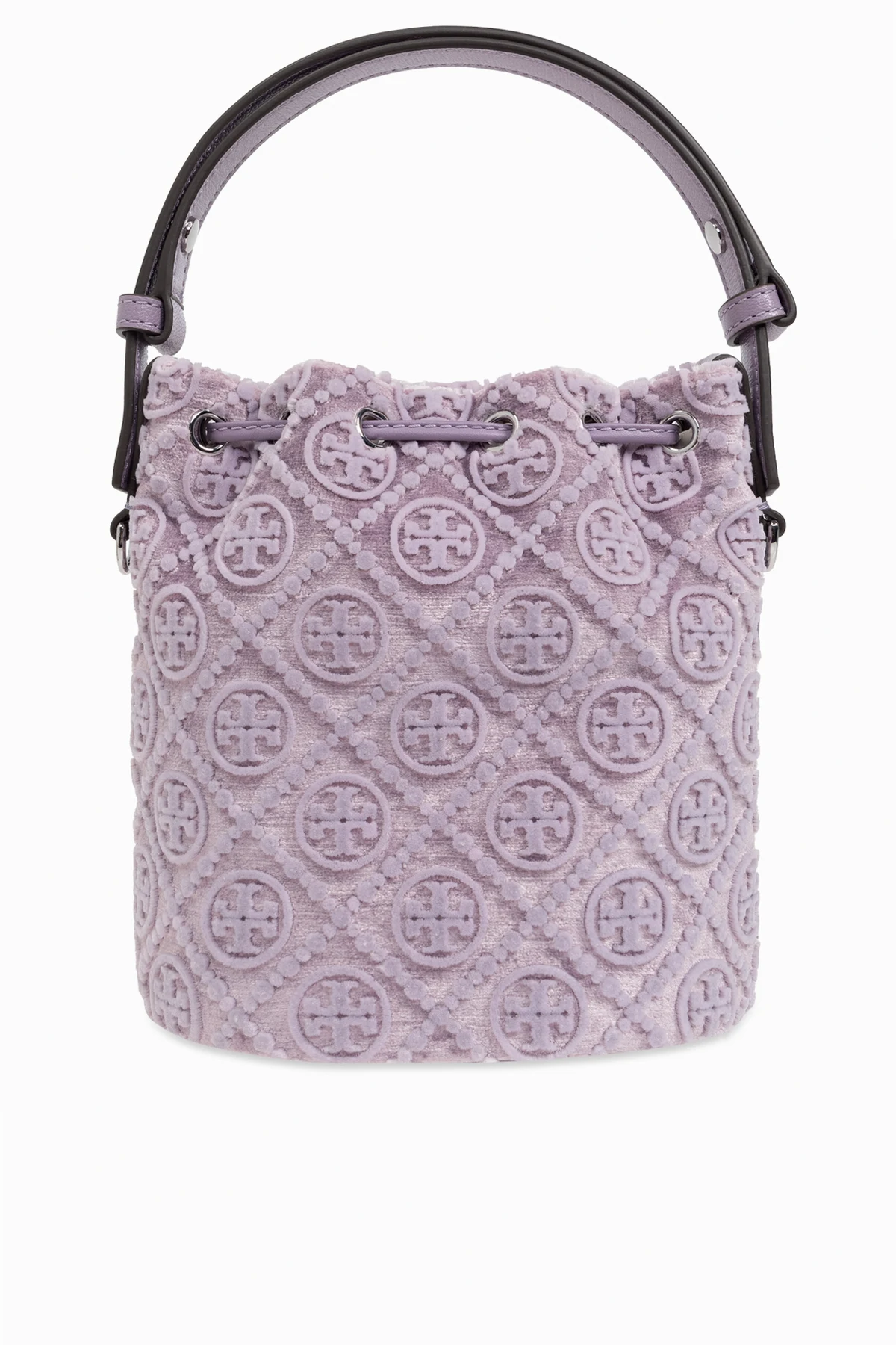 Wir präsentieren die Samthandtasche "T Monogram Mini" im 'Bucket'-Stil , ein außergewöhnliches Accessoire aus der Kollektion von Tory Burch. Diese äußerst elegante Tasche, gefertigt aus Samt höchster Qualität, strahlt Luxus und einen unverwechselbaren Stil aus. Der dominante violette Farbton harmoniert perfekt mit dem erhabenen Monogramm und schafft eindrucksvolle runde Embleme, die alle Blicke auf sich ziehen.