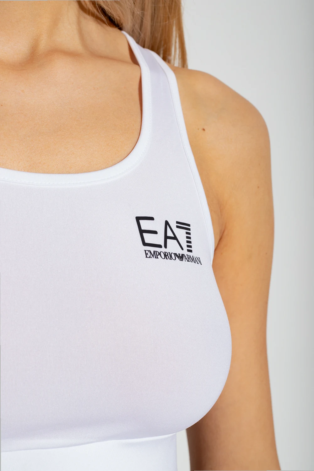 White sports top from EA7 Emporio Armani. Embellished with a black logo pattern, this style features an elastic trim at the bottom hem.