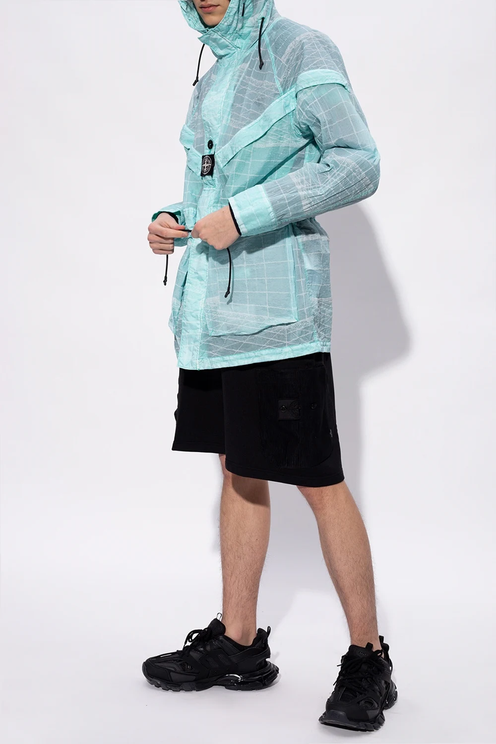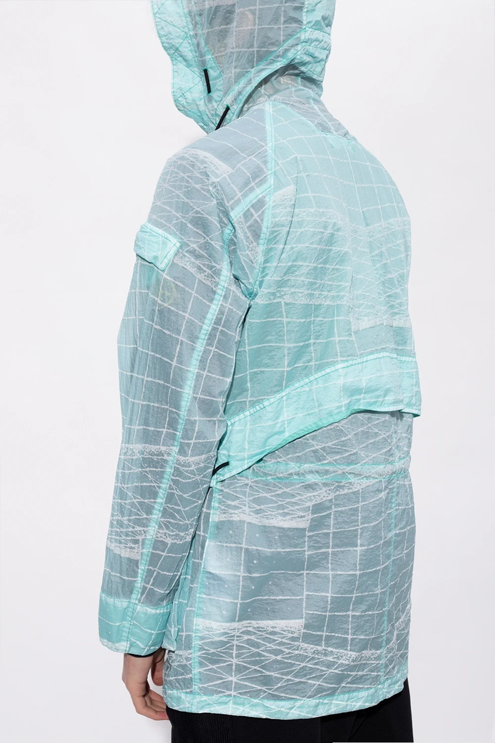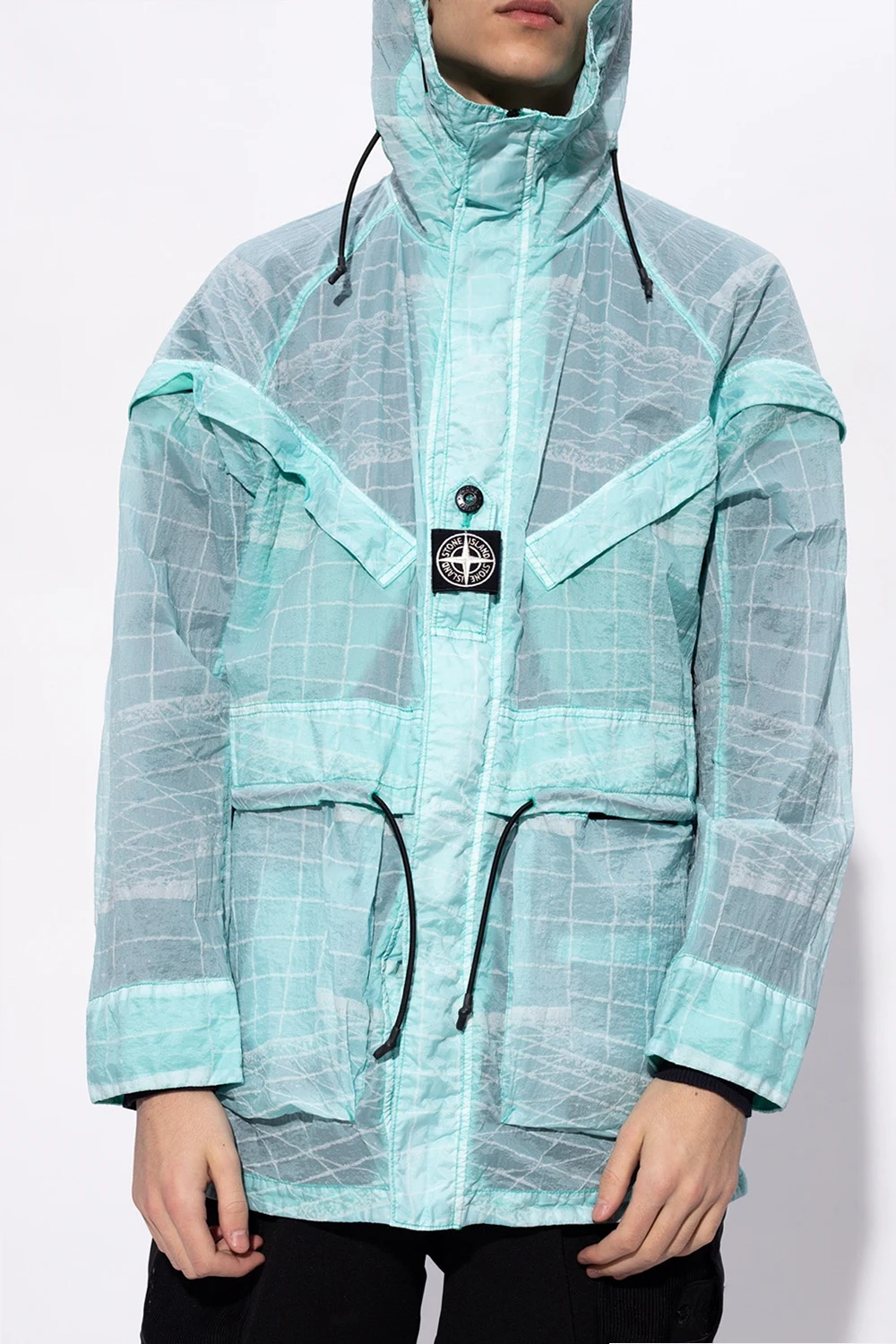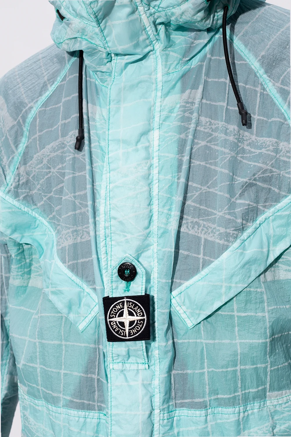 Light blue jacket from Stone Island. Illustrated with a white graphic print, this style secures with a two-way zip and velcro fasteners and features a concealed placket, long sleeves, cinching drawstrings to the hood and waist as well as two zipped pockets and two velcro-fastened flap pockets.