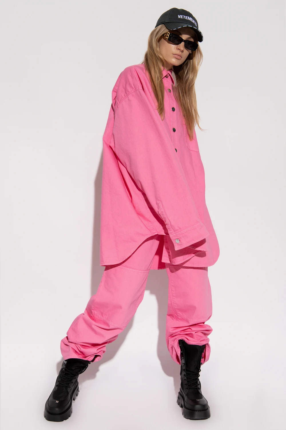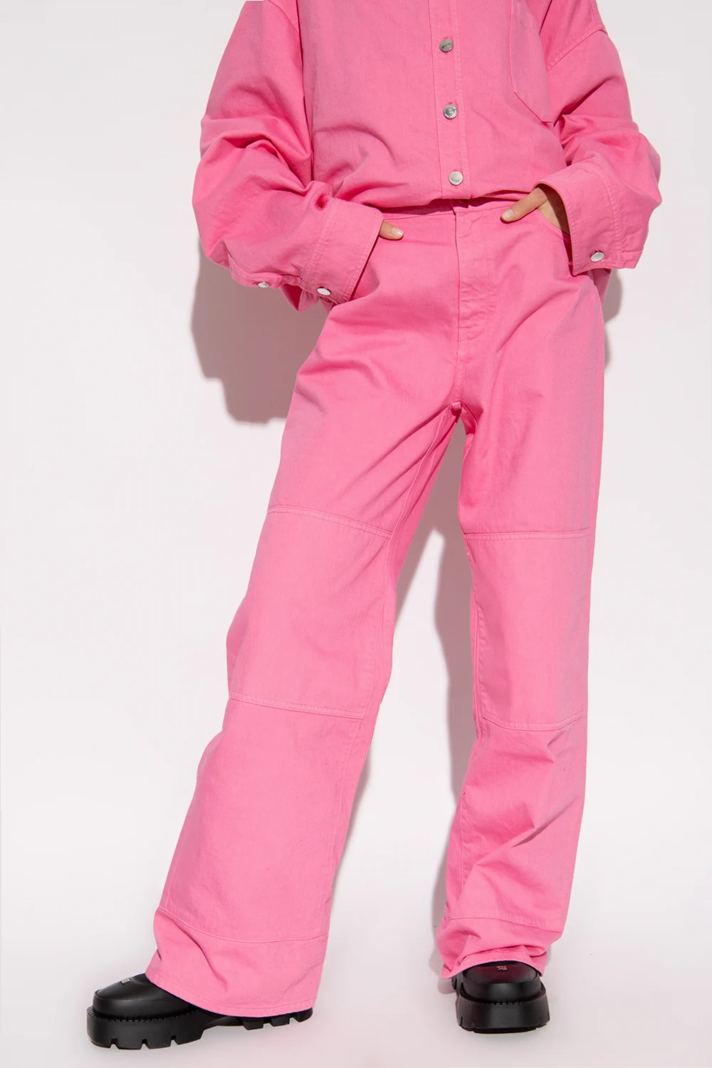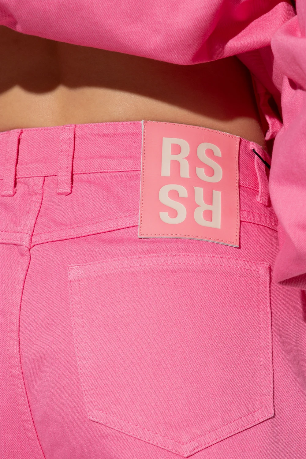 Pink trousers from Raf Simons. Crafted from cotton, this pair falls with wide, straight legs and features a zip fly with a button, classic five jean pockets and a logo patch on the back.