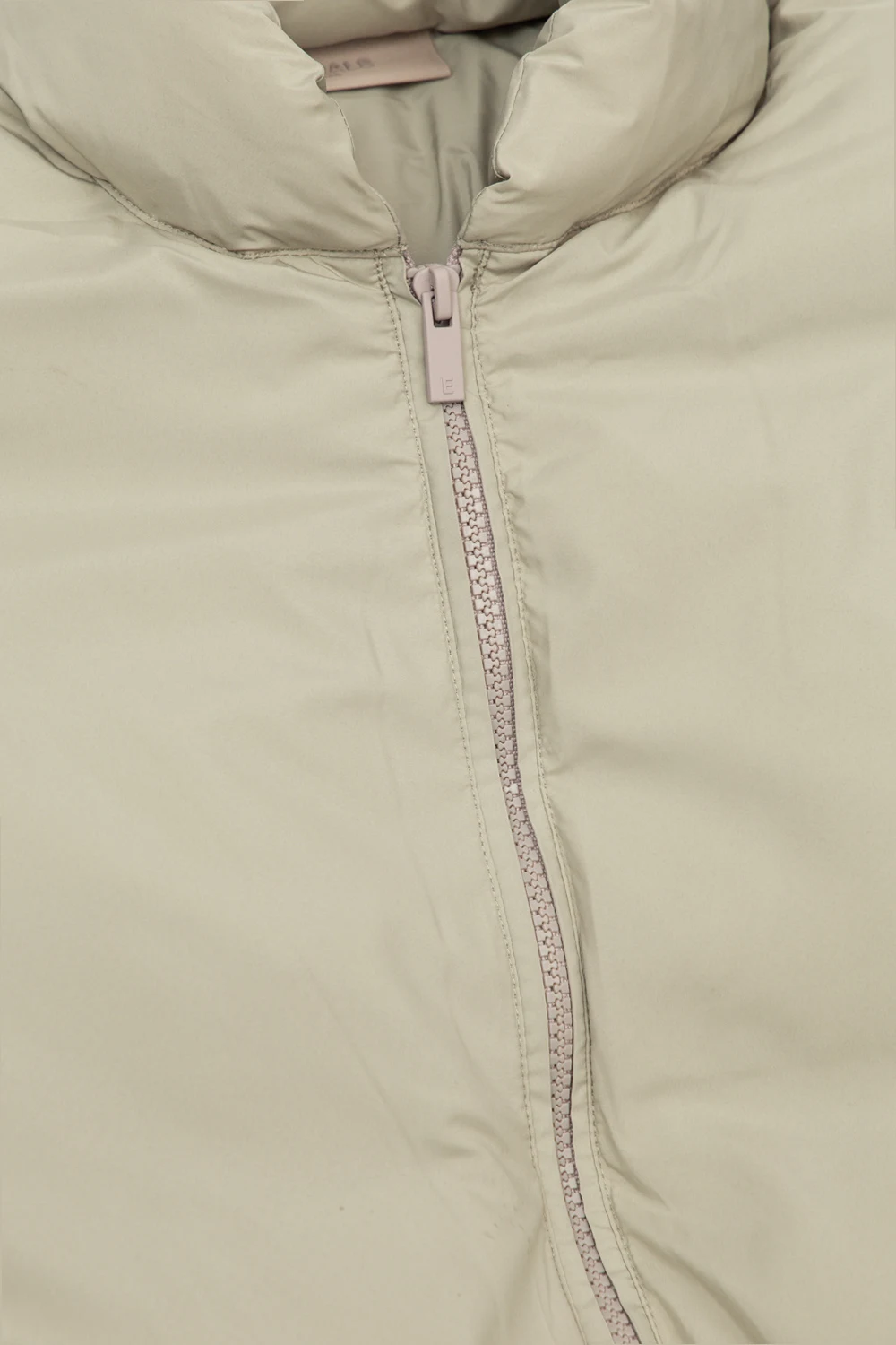 Greyish-green insulated jacket with a standing collar from Fear Of God Essentials Kids. Emblazoned with a logo patch at the back, this style features a two-way zip fastening, two frontal slip pockets and an elasticated bottom hem and cuffs.