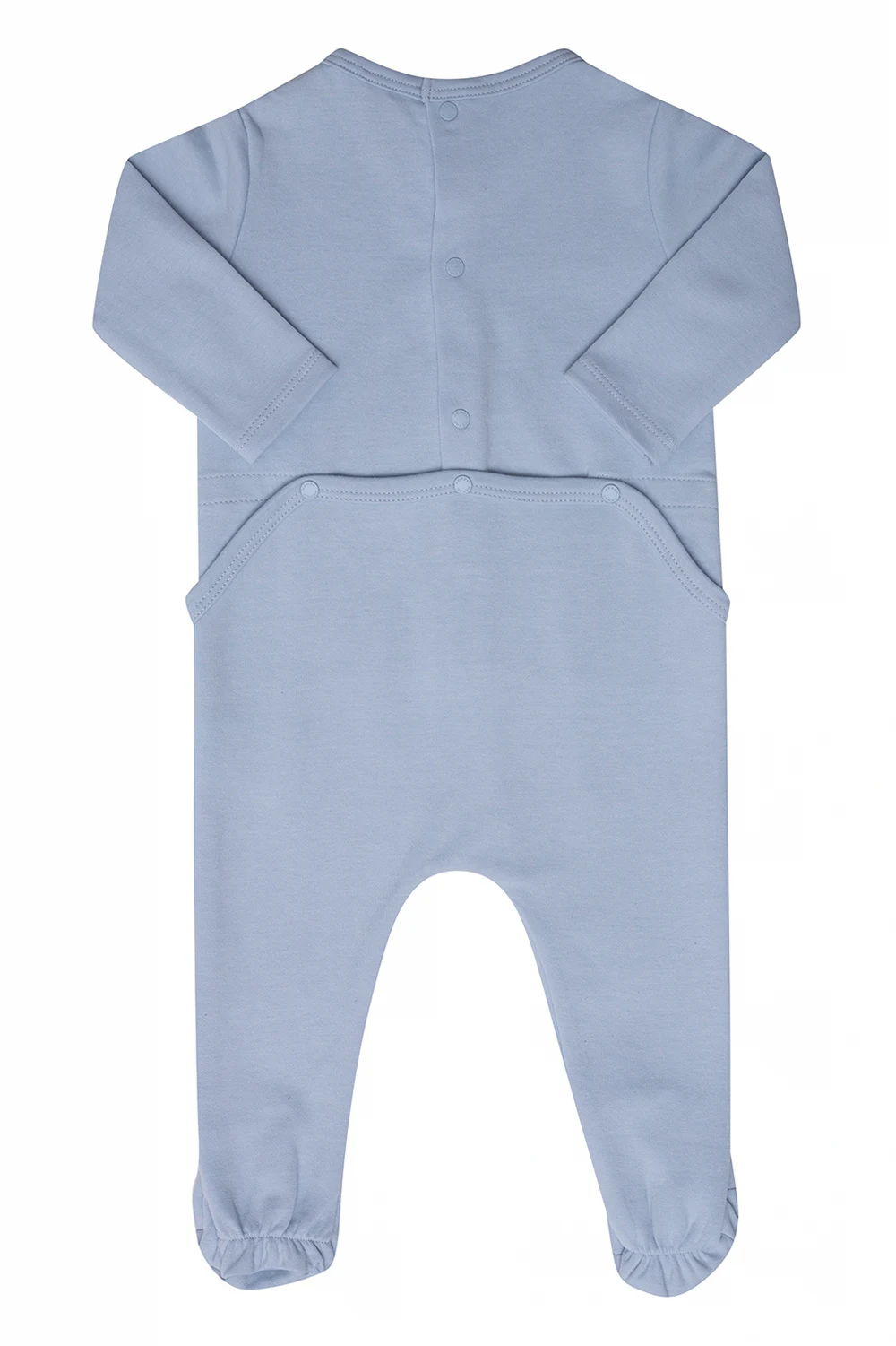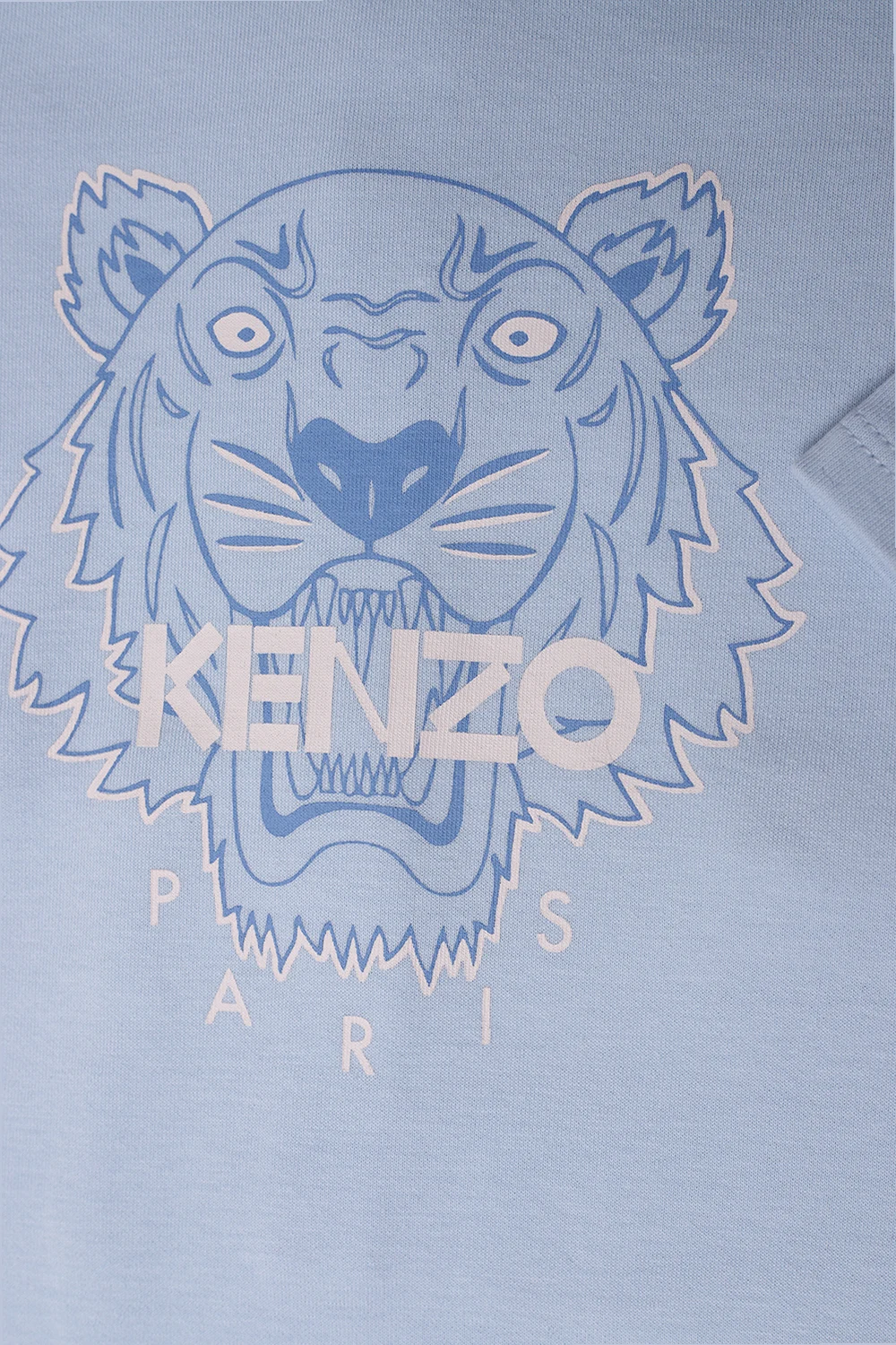 Light blue romper suit from Kenzo Kids. Crafted from organic cotton, this style features a round neck, snap fastenings on the back and a blue and white graphic print with a signature motif of tiger on the front.