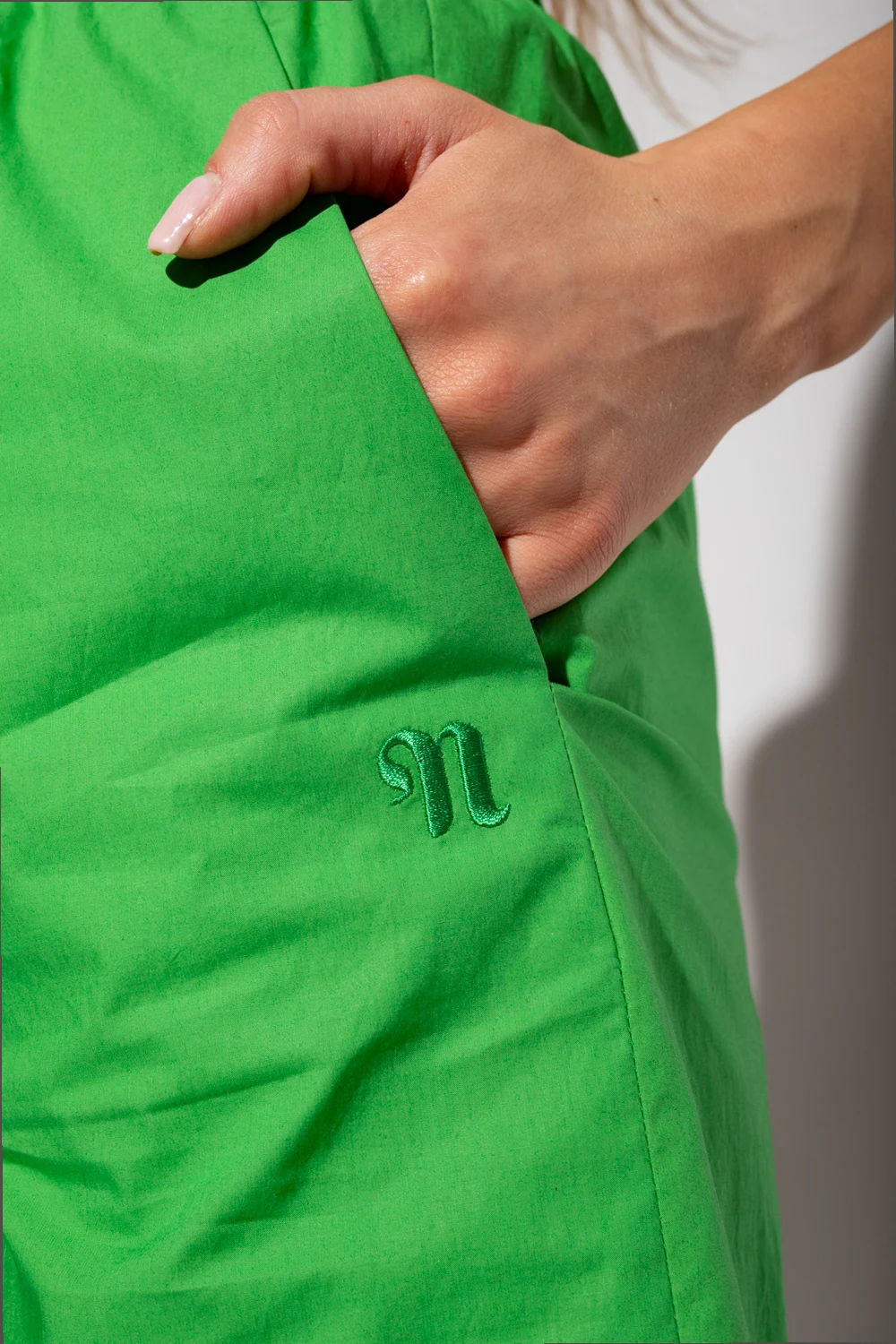 Green ‘Megan’ shorts from Nanushka. Made of cotton, this pair features a drawstring waist, two front pockets and a logo embroidery.