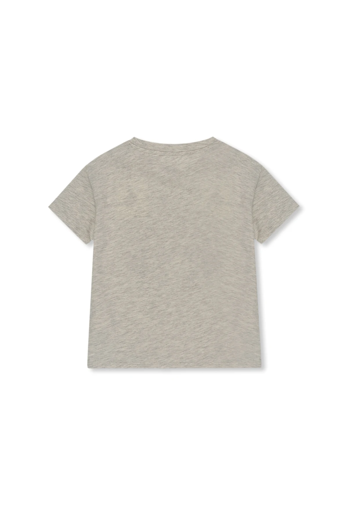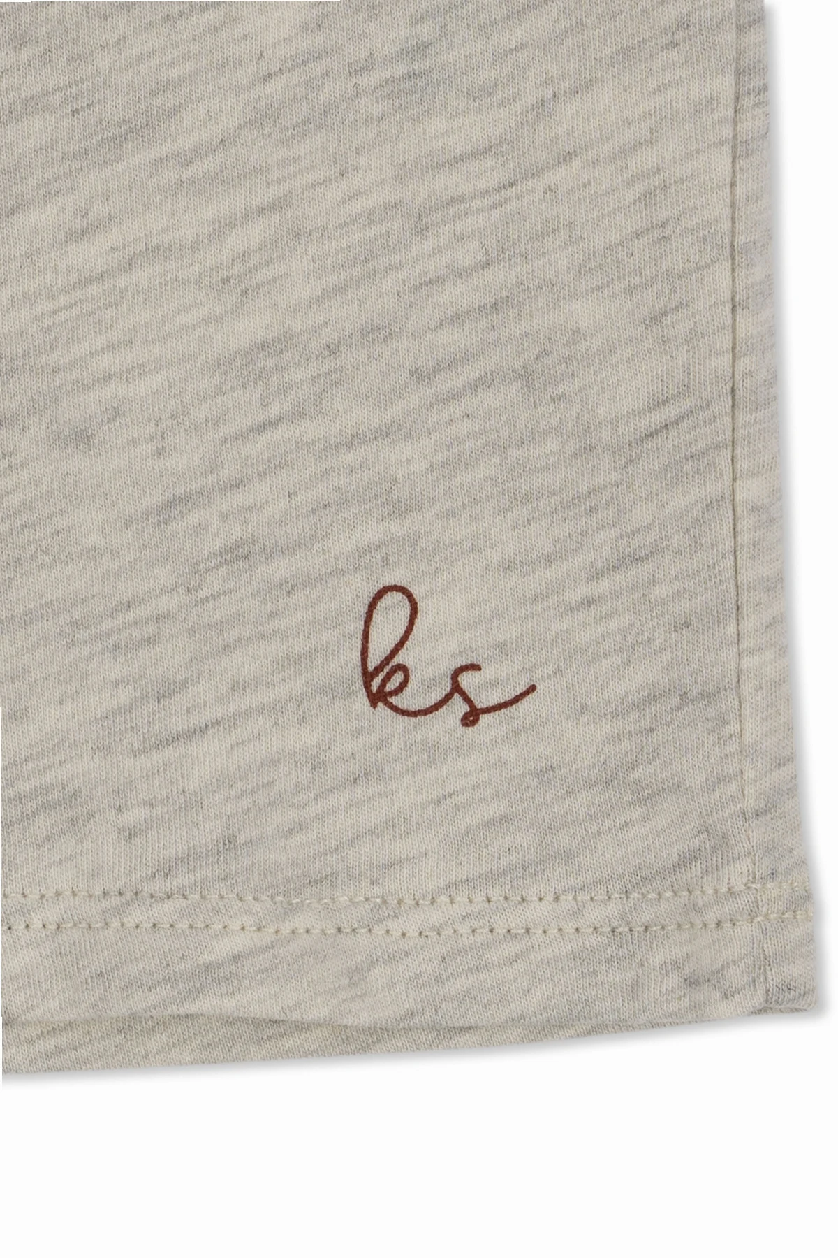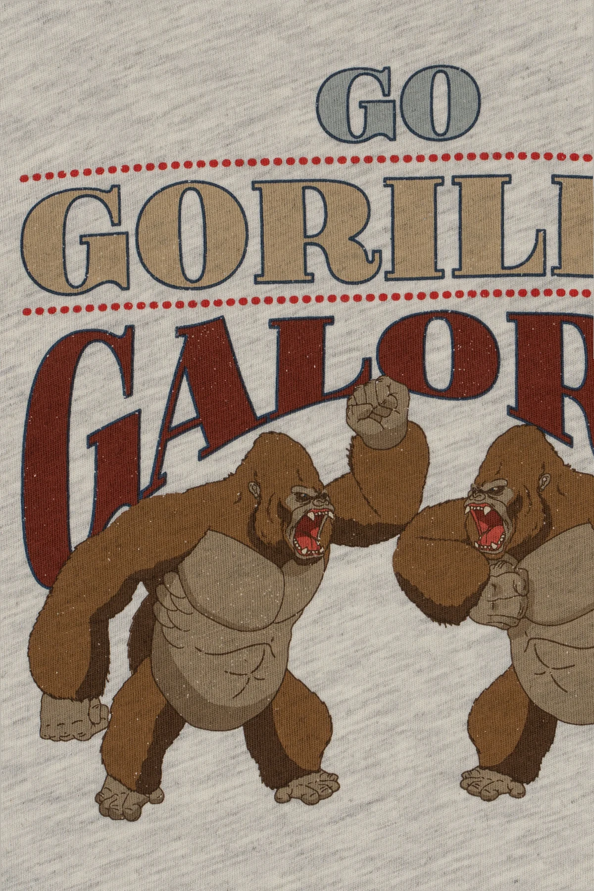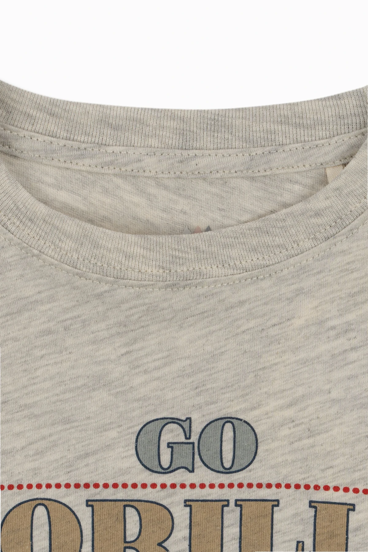 Wir präsentieren Ihnen ein exquisites Kleidungsstück – das T-Shirt mit ‘Famo’-Druck vom renommierten Designer Konges Sløjd . Sein subtiler, melierter Grauton bietet die perfekte Leinwand für den ausdrucksstarken Druck, der zwei Gorillafiguren zeigt, welche ein Manifest der Kraft und Wildheit darstellen. Der Aufdruck "GO GORILLA GALORE" in lebhaften Rot- und Blautönen verleiht dem Shirt Charakter und Einzigartigkeit.