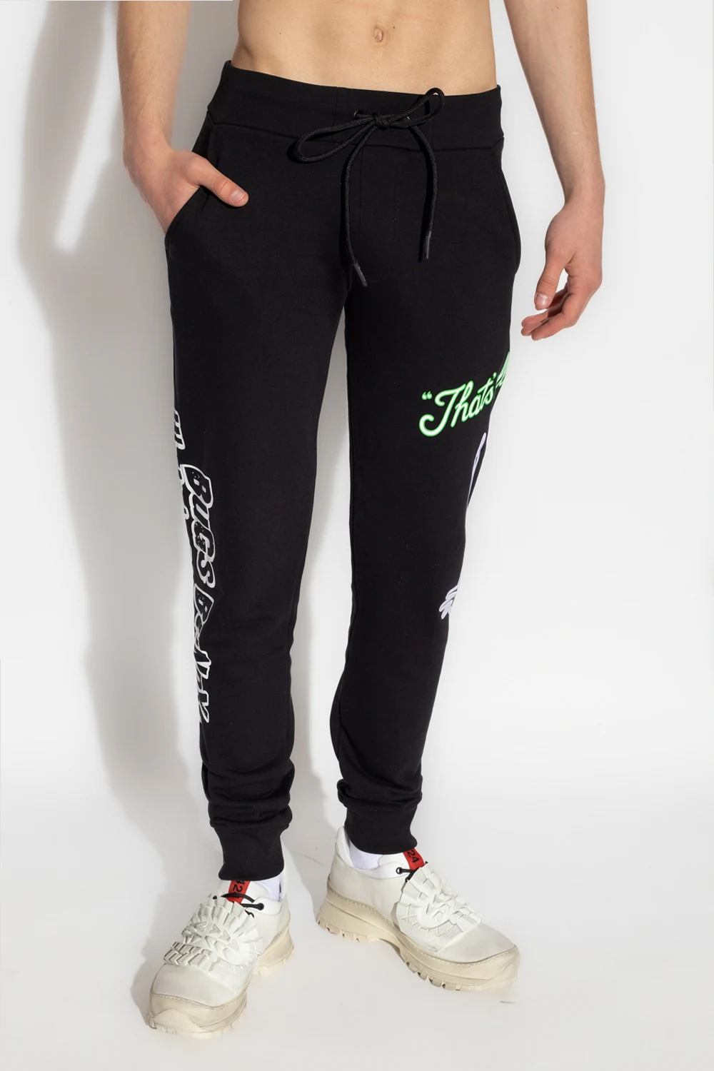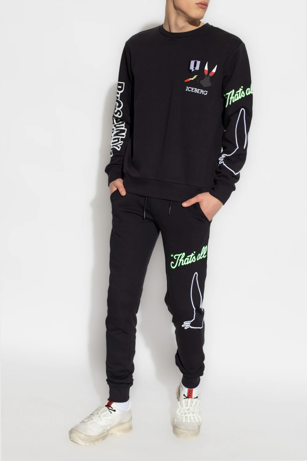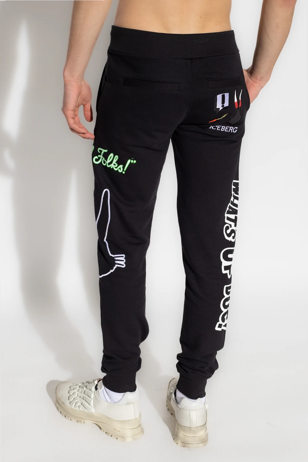 Black sweatpants from Iceberg. Crafted from cotton, this pair is cinched with drawstrings at the waist and features a colourful ‘Looney Tunes™ That's All Folks’ print and embroidery, four slip pockets and elasticated cuffs.