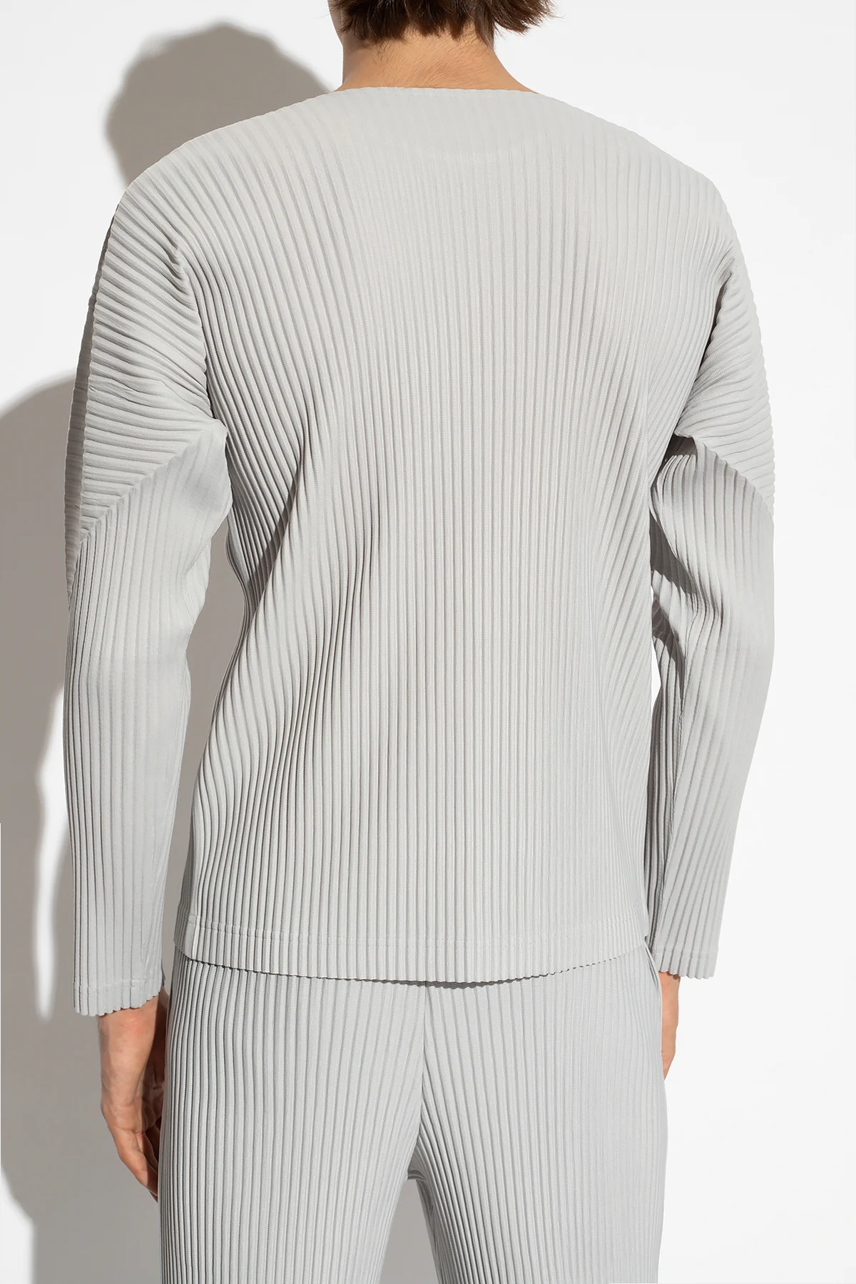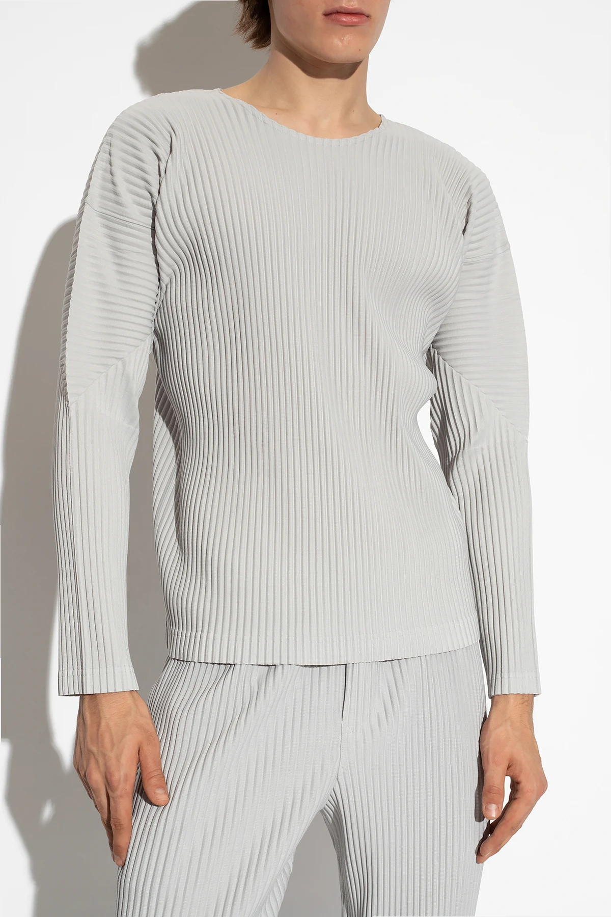 Grey pleated T-shirt from Issey Miyake Homme Plisse. Made from recycled materials, this round neck design has long sleeves.