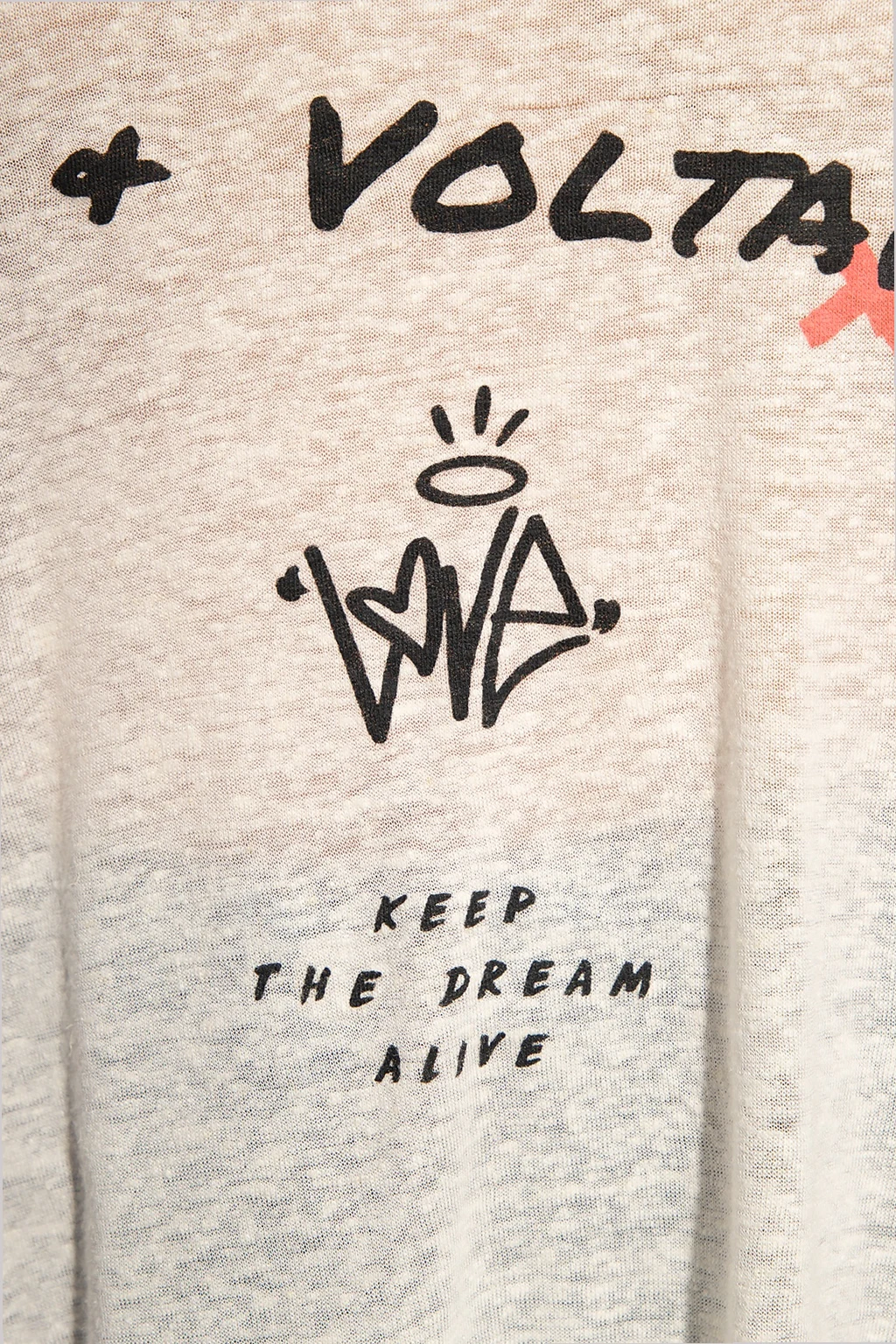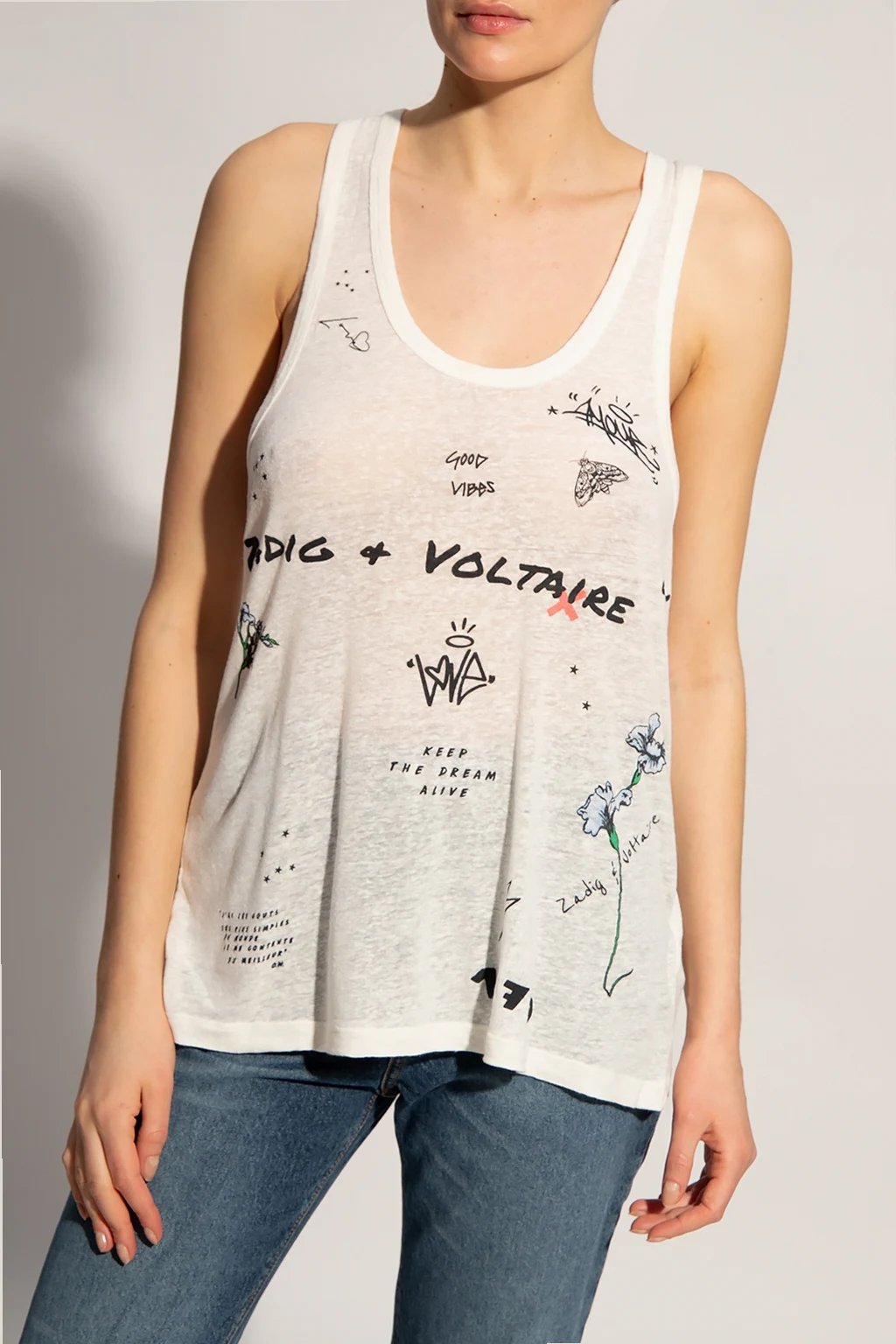 Cream tank top from Zadig & Voltaire. Crafted from sheer linen and modal blend, this sleeveless garment features a colourful graphic print.