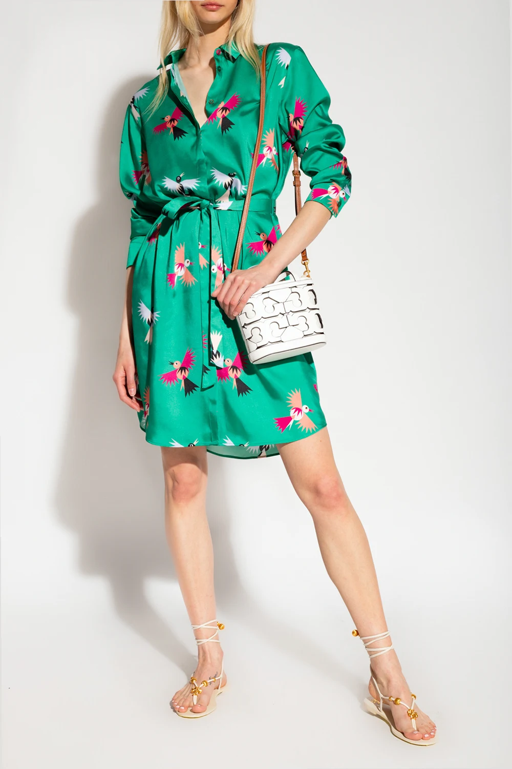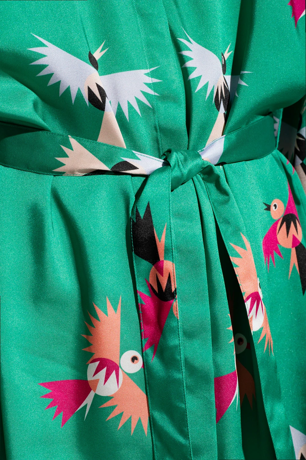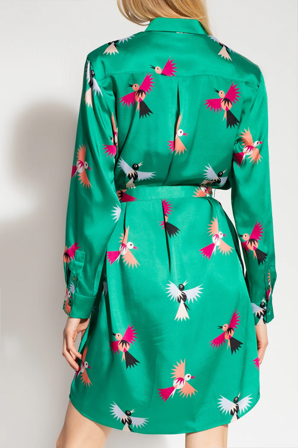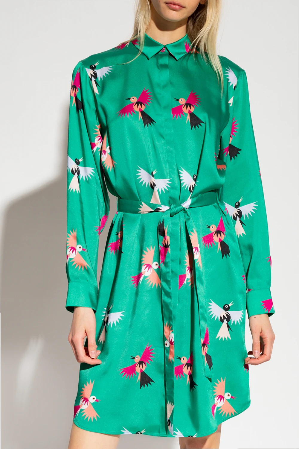 Green dress from PS Paul Smith. Cut from satin produced from recycled materials, this shirt cut silhouette is complete with a collar, buttons with a concealed placket, tie waist, multicolored bird print and long sleeves with button cuffs.