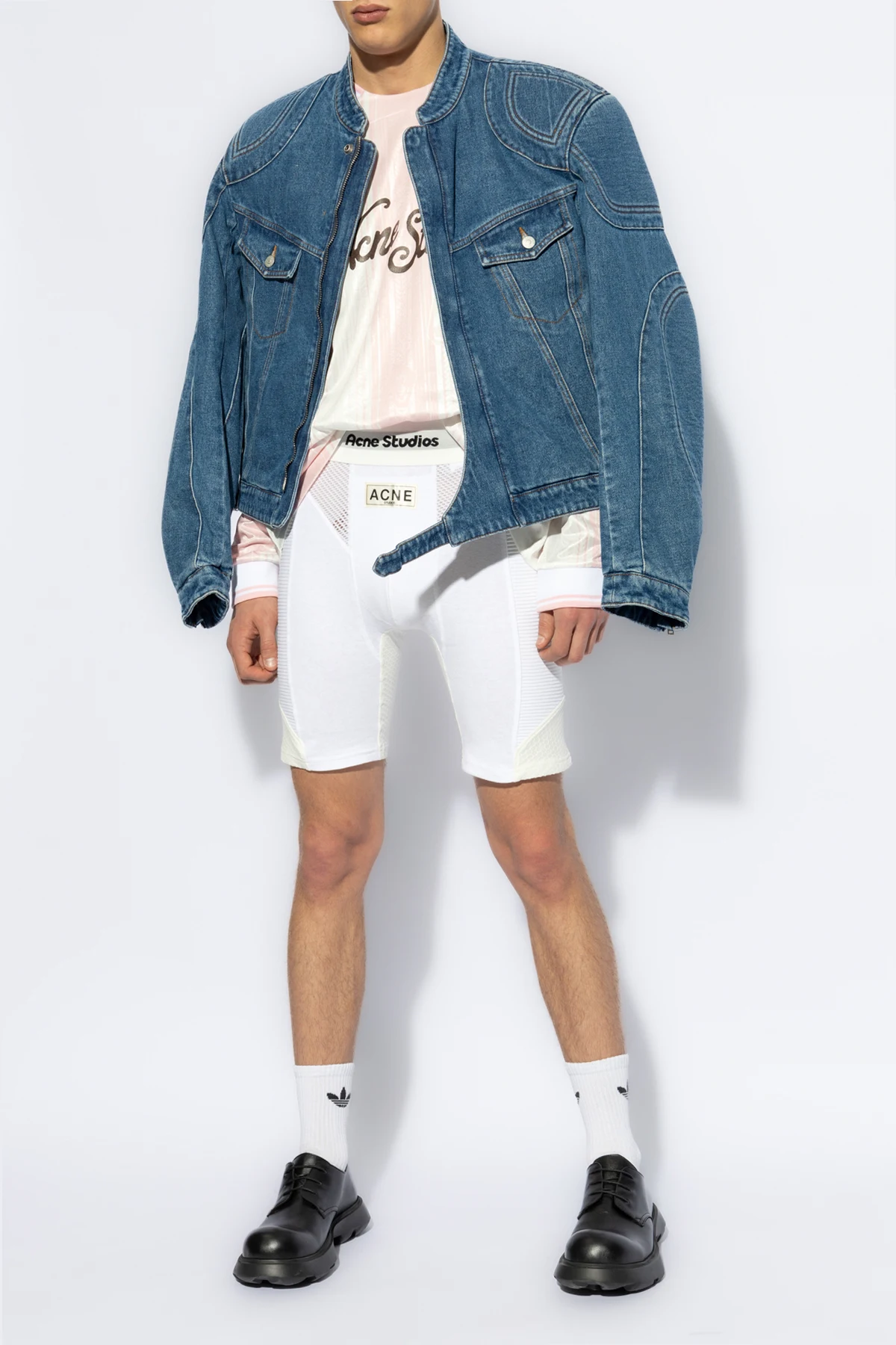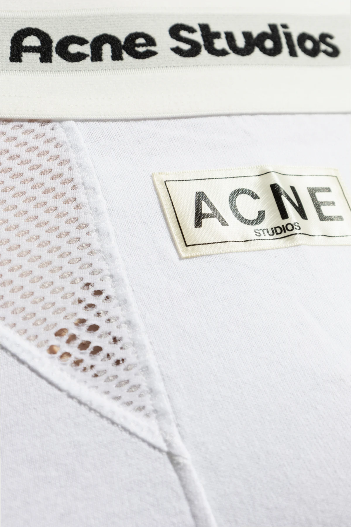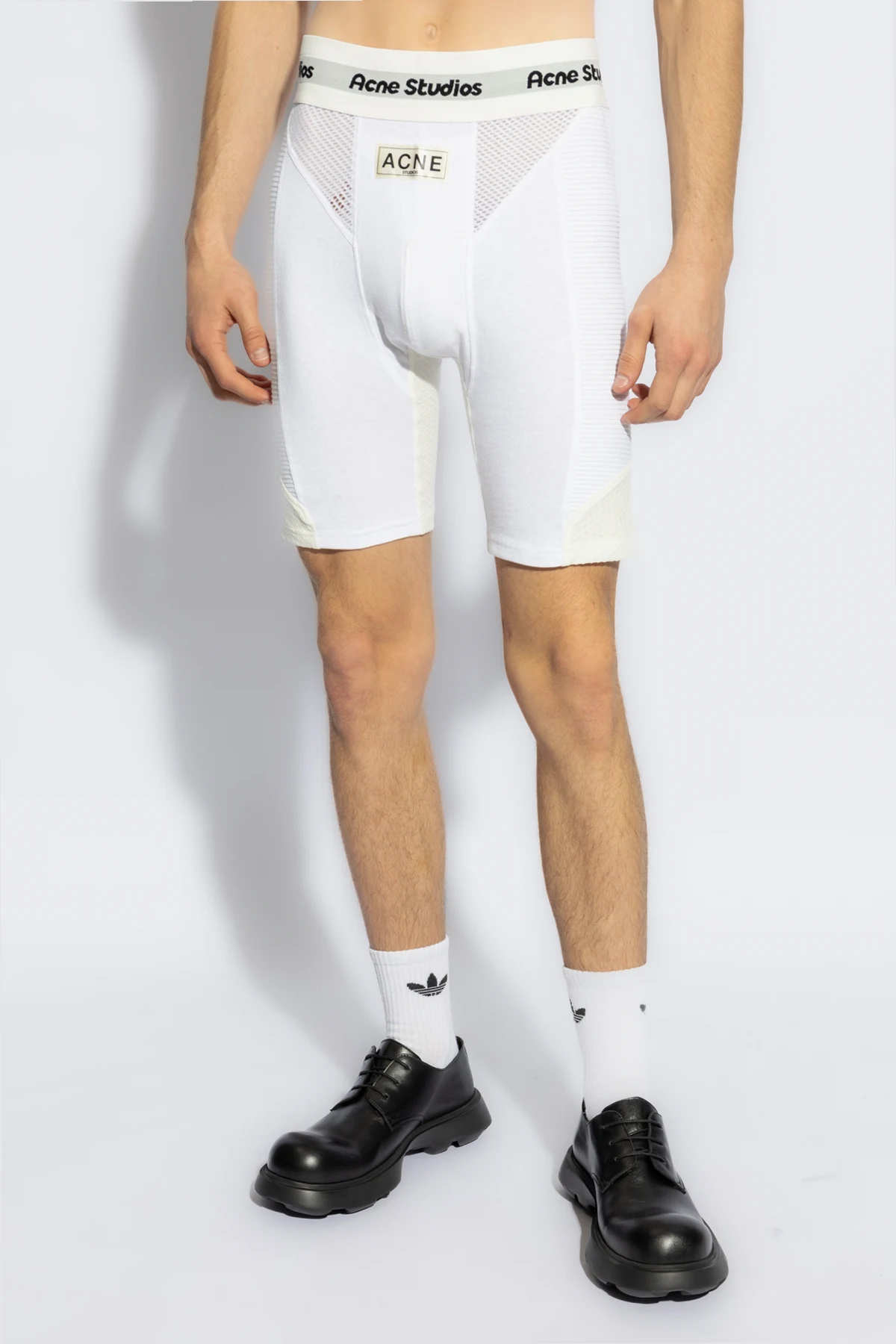 Charakteristisch für die Marke Acne Studios , befindet sich auf dem linken Oberschenkel eine Metallplakette mit dem Logo, was dem Ganzen eine edle Eleganz verleiht. Die weißen Shorts zeichnen sich zudem durch einen eng anliegenden Schnitt aus, der an Sportunterwäsche erinnert und die Dynamik der Figur betont. Die Netzstruktur an ausgewählten Stellen garantiert hervorragende Atmungsaktivität und macht sie ideal für aktive Tage.