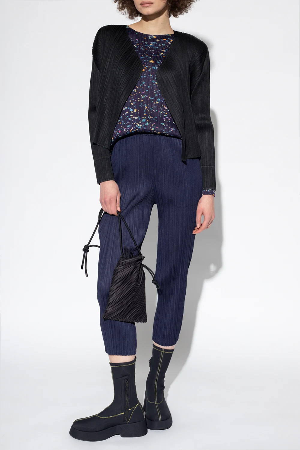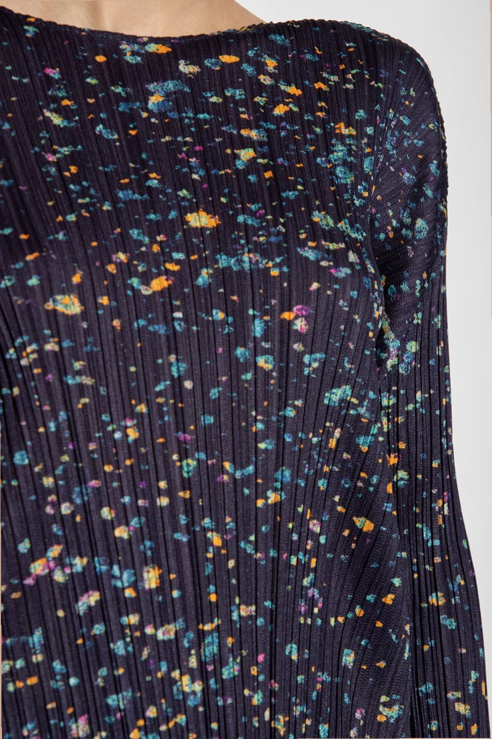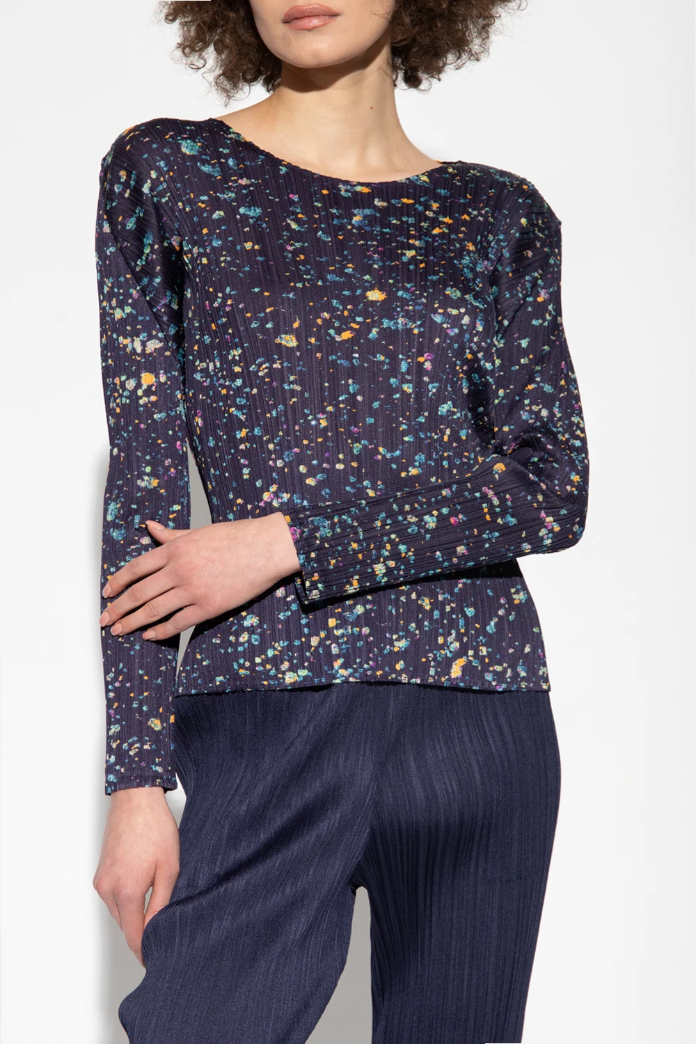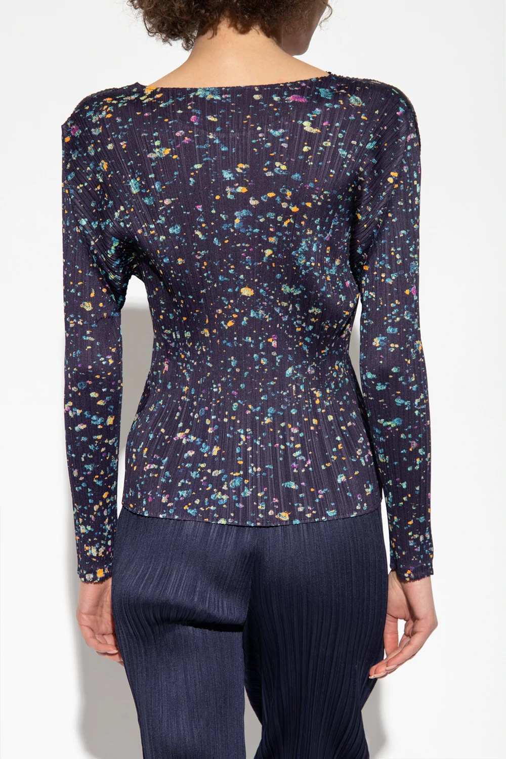 Navy blue top from Issey Miyake Pleats Please. Distinguished by the brand's signature pleating technique, this style showcases a colourful floral motif and long sleeves.