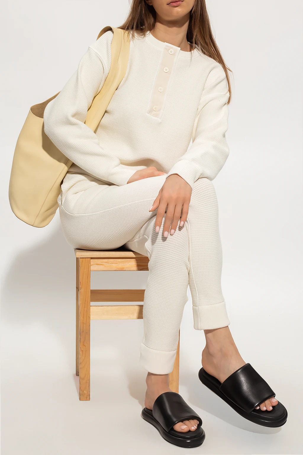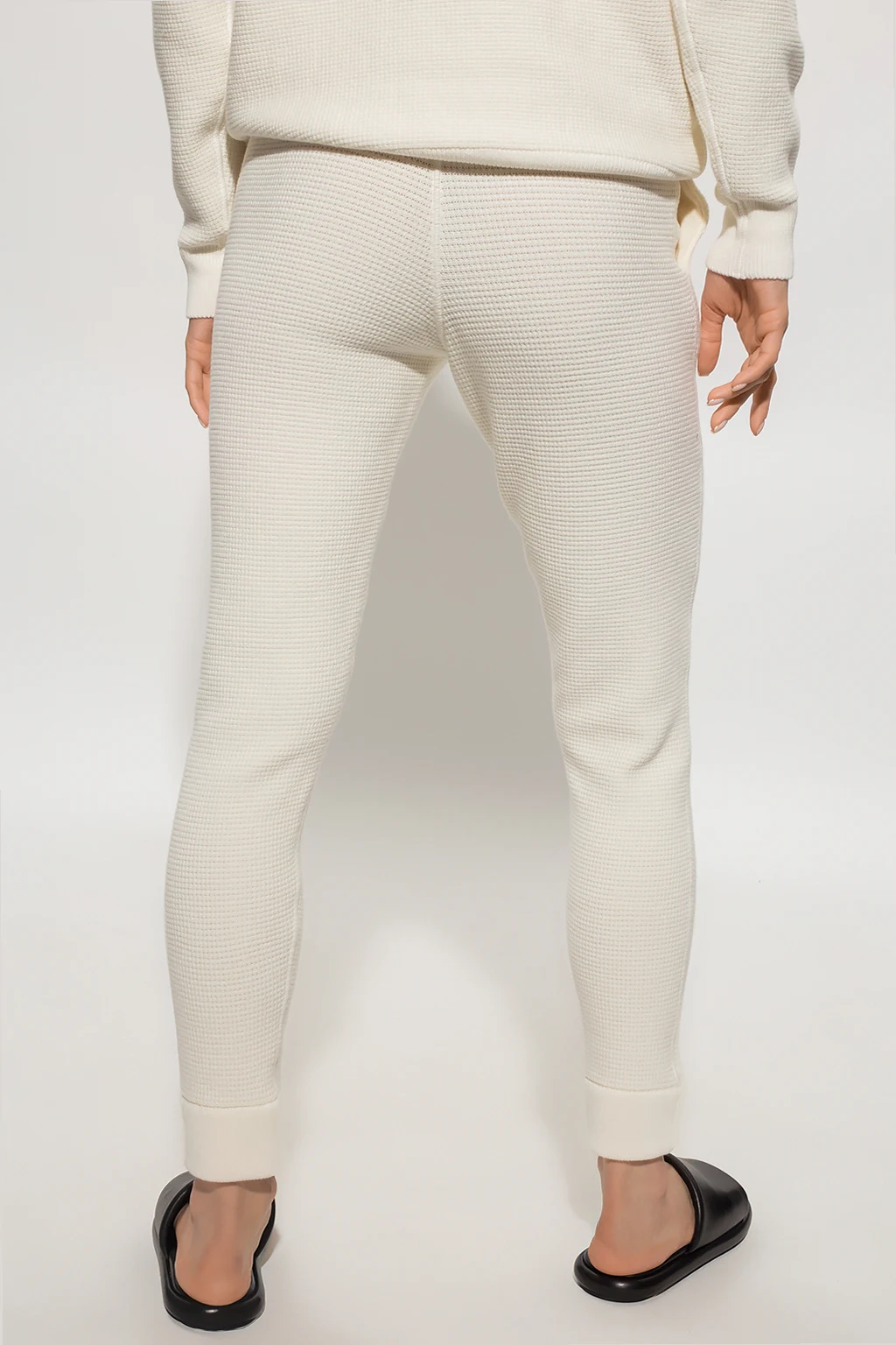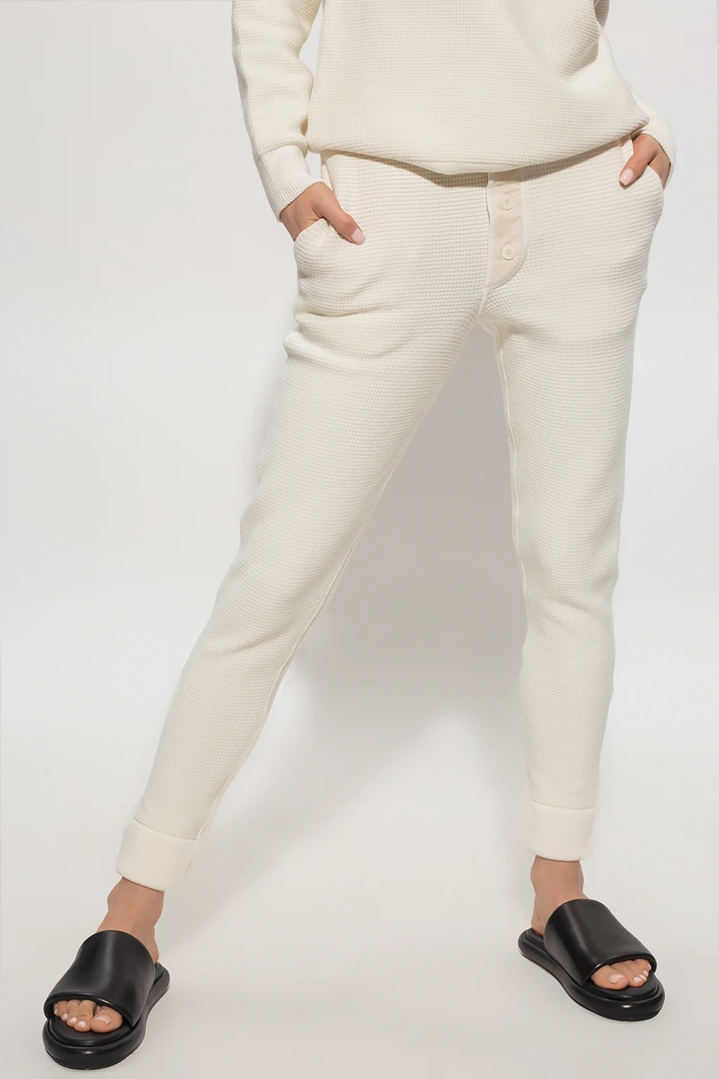 Cream ‘Ginzena’ trousers with pockets from The Row. Crafted from a cotton and cashmere blend, this pair features two slip pockets and ribbed cuffs.