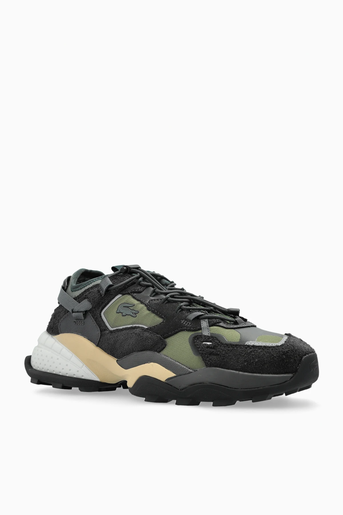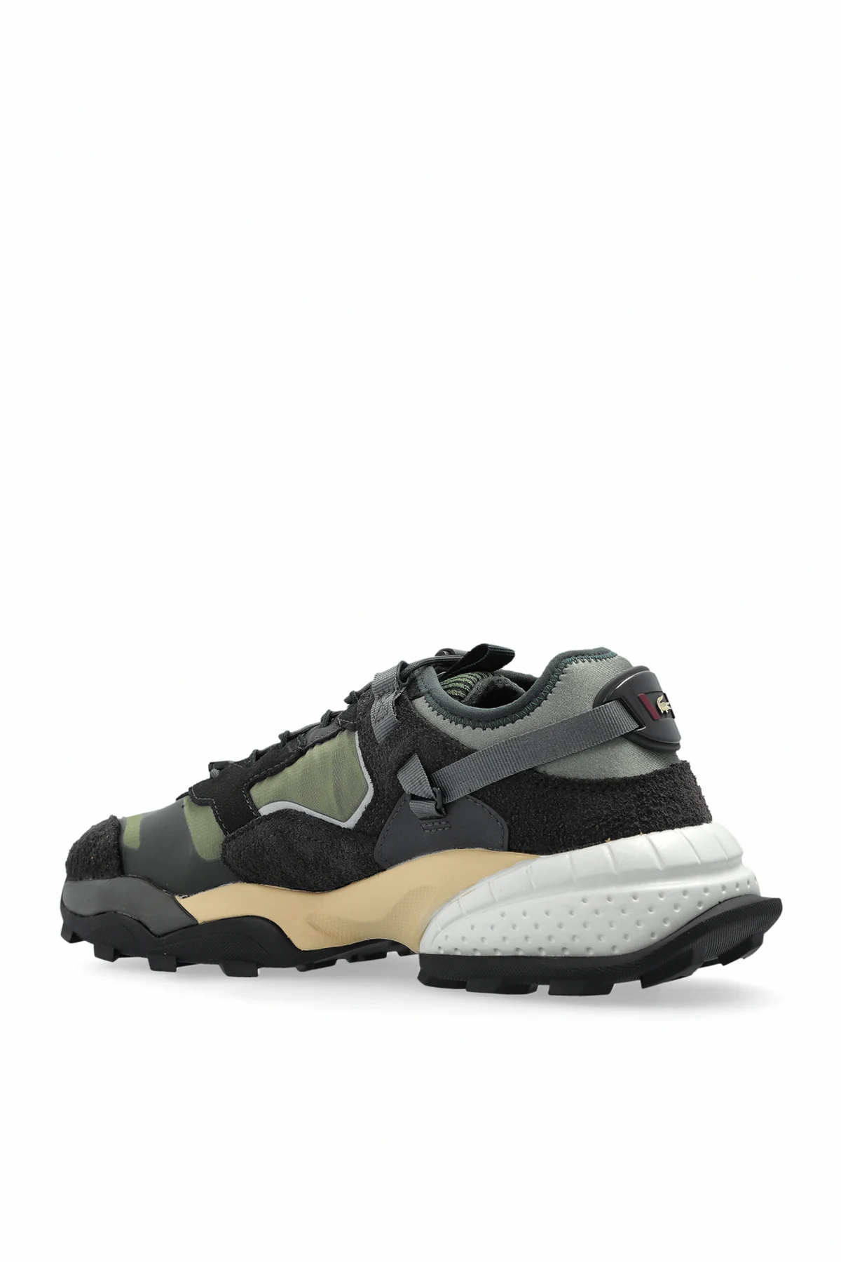 Wir präsentieren die Sneakers L-Guard der Marke Lacoste, die modernes Design harmonisch mit zeitloser Eleganz verbinden. Diese einzigartigen Sneakers zeichnen sich durch ein vielschichtiges Obermaterial aus, in dem ein zartes Mesh, weiches Wildleder und glattes Leder integriert sind. Die Kombination aus grafitgrauen, grünen und beigen Farben verleiht ihnen einen besonderen Charakter.