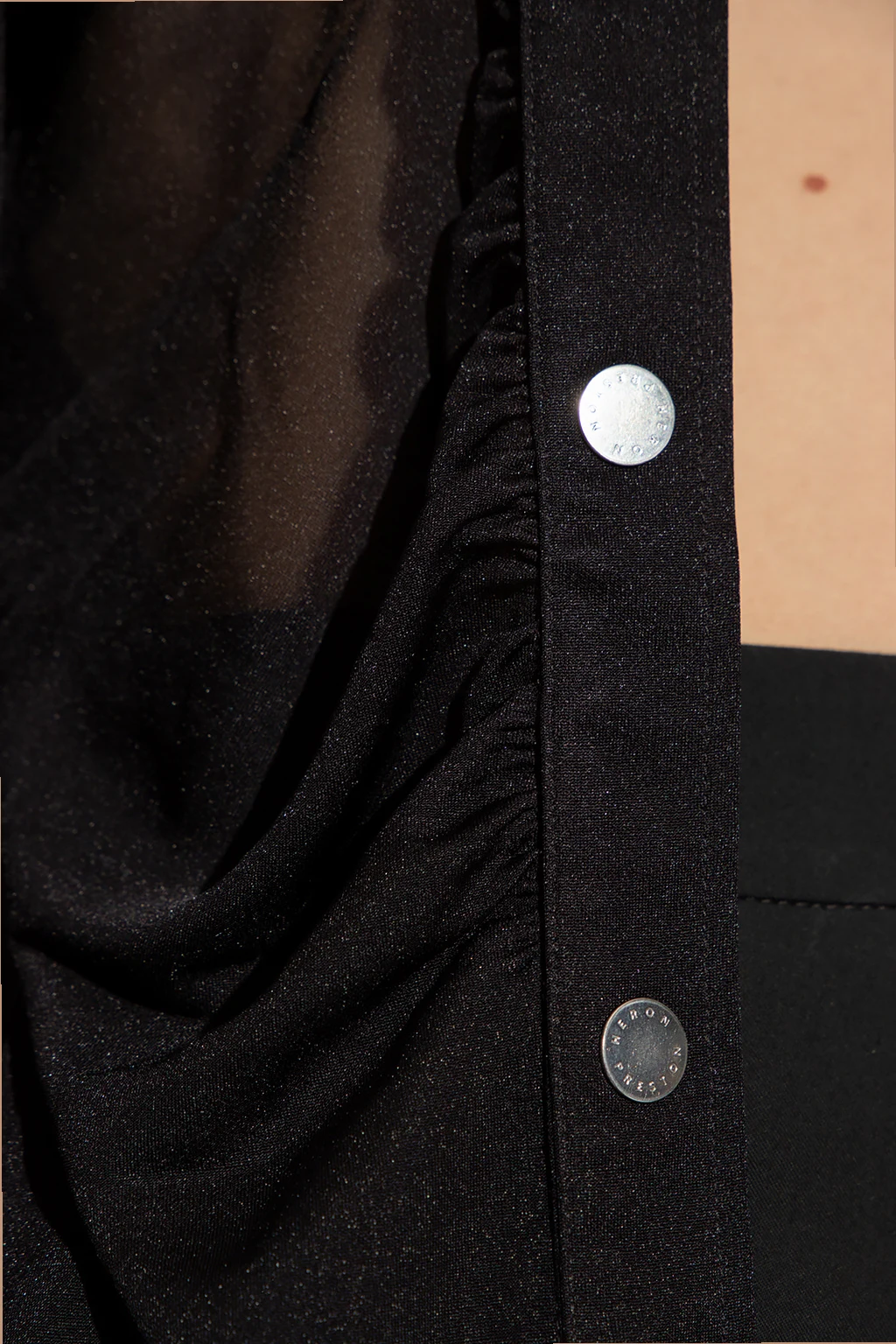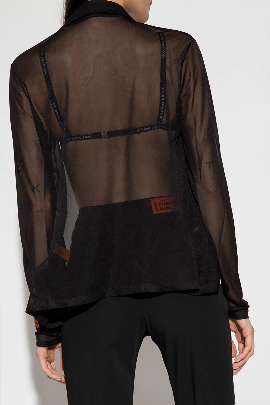 Black transparent shirt from Heron Preston. Fastened with snaps, this fitted garment has long sleeves with an orange logo patch.