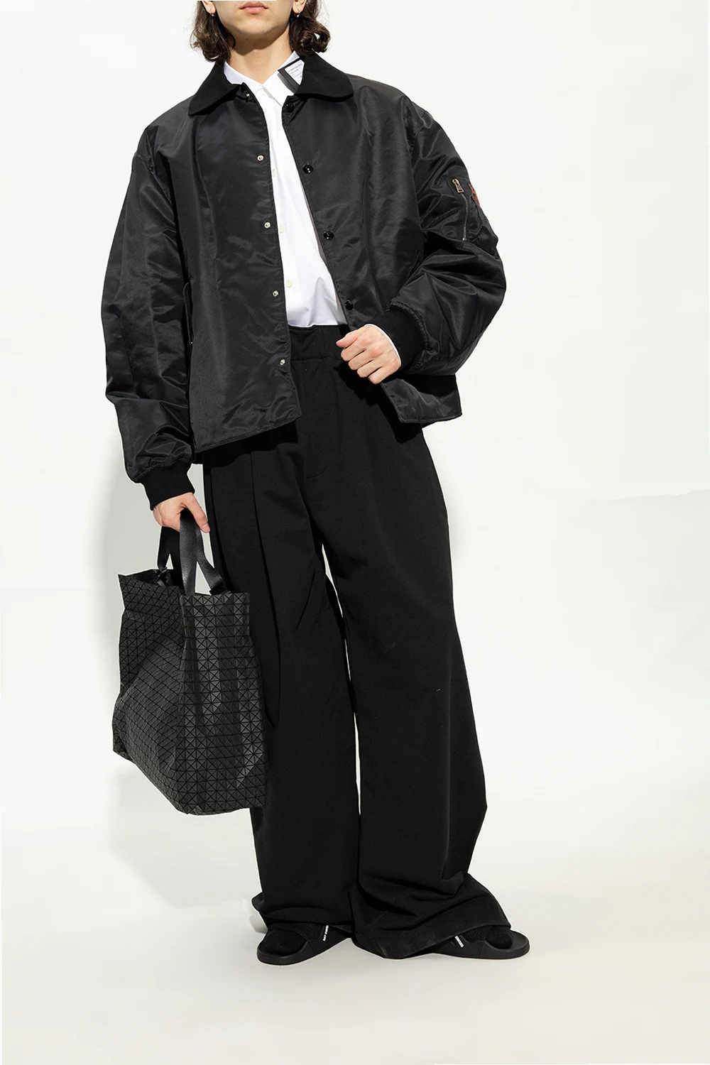 Black ‘Astra’ slides from Raf Simons. Made of fabric, this model sits on a black rubber sole and showcases a tactile white logo and a logo-shaped application.