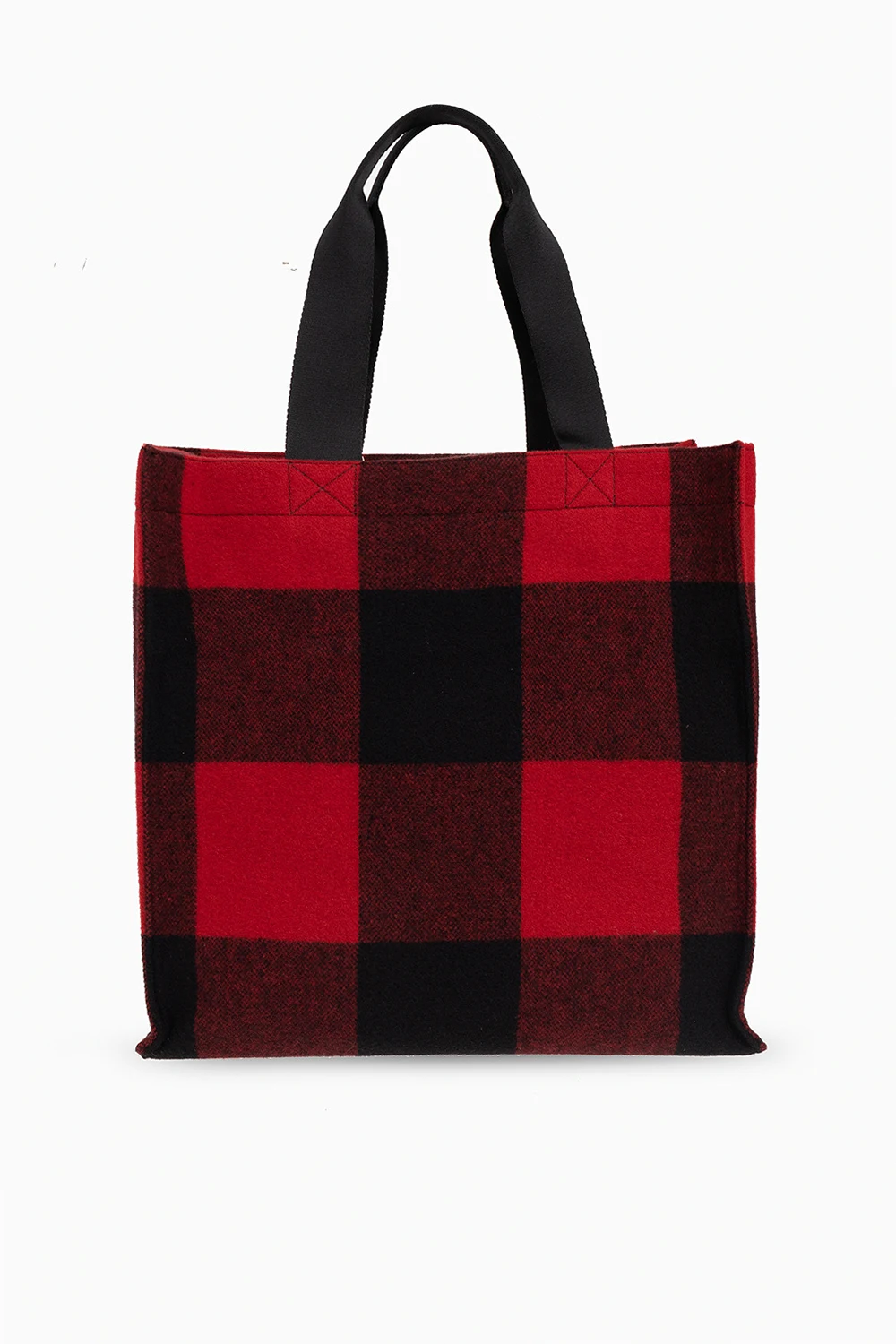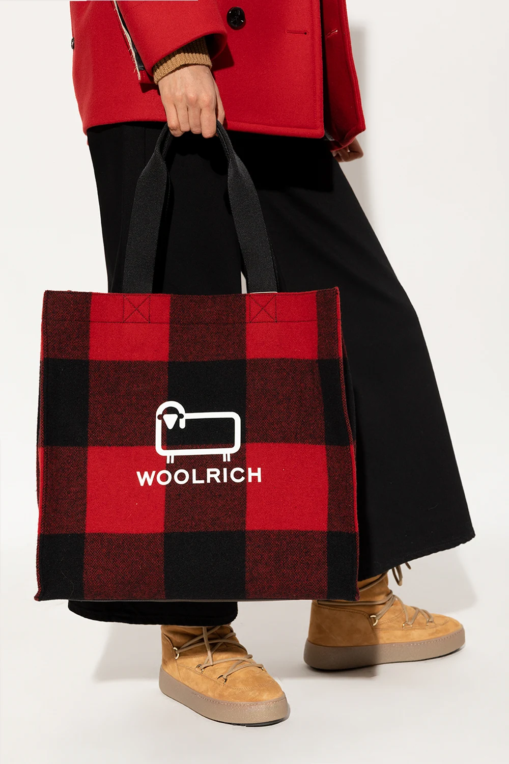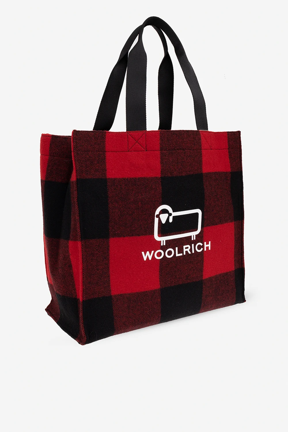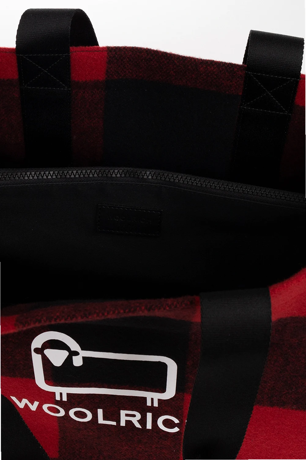 Red and black shopper bag from Woolrich. Crafted from a wool blend, this garment features a check pattern, white logo print, two half-round handles, dark silver-tone metal hardware and two separate internal compartments with one zip pocket.