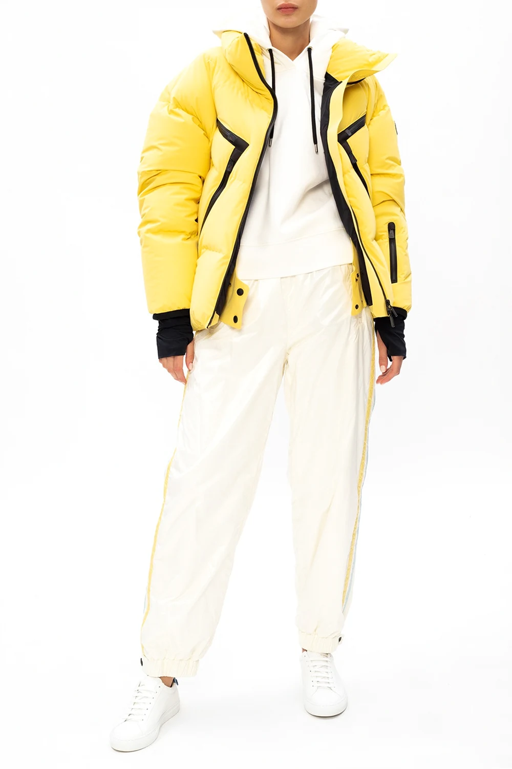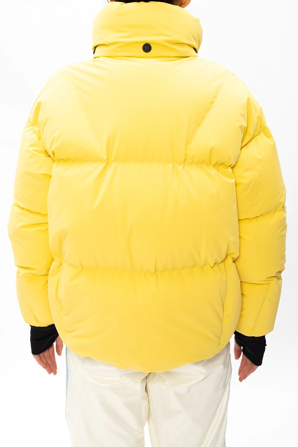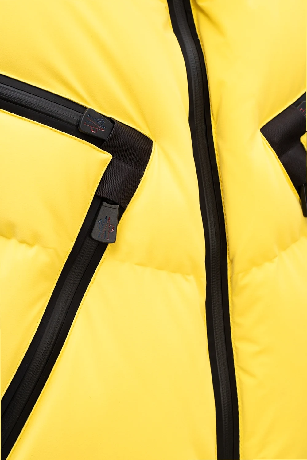 Yellow and black ‘Avise’ down jacket from Moncler Grenoble. Equipped with an embedded RECCO reflector, this item features a band collar with snap fastenings which can be worn as a hood, four zip pockets on the front, a logo patch on one sleeve and long sleeves with thumb holes.