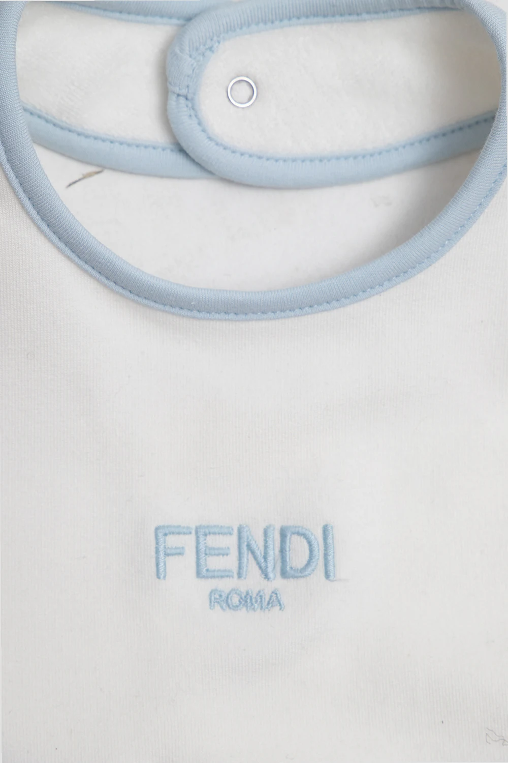 Blue and white babygrow, hat & bib set from Fendi Kids. Made of cotton, each item showcases the brand's logo.