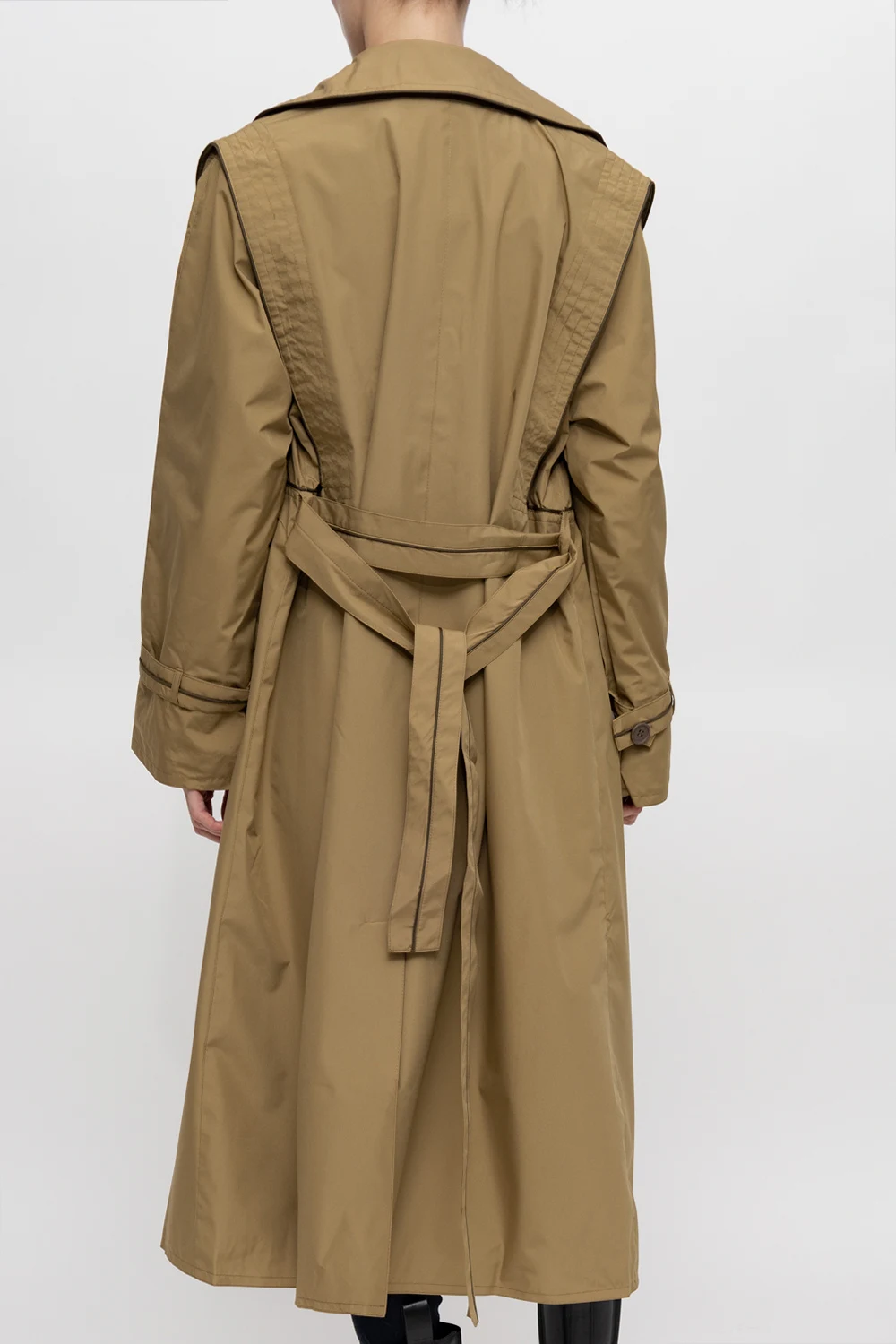 Khaki ‘EvelynGZ’ trench coat from Gestuz. Crafted from recycled material with a relaxed, double-breasted silhouette, this style features button fastenings, an attached waist-cinching belt, notch lapels, quilted panels on the shoulders, two slip pockets, a single back vent and long sleeves with buttoned adjusters.