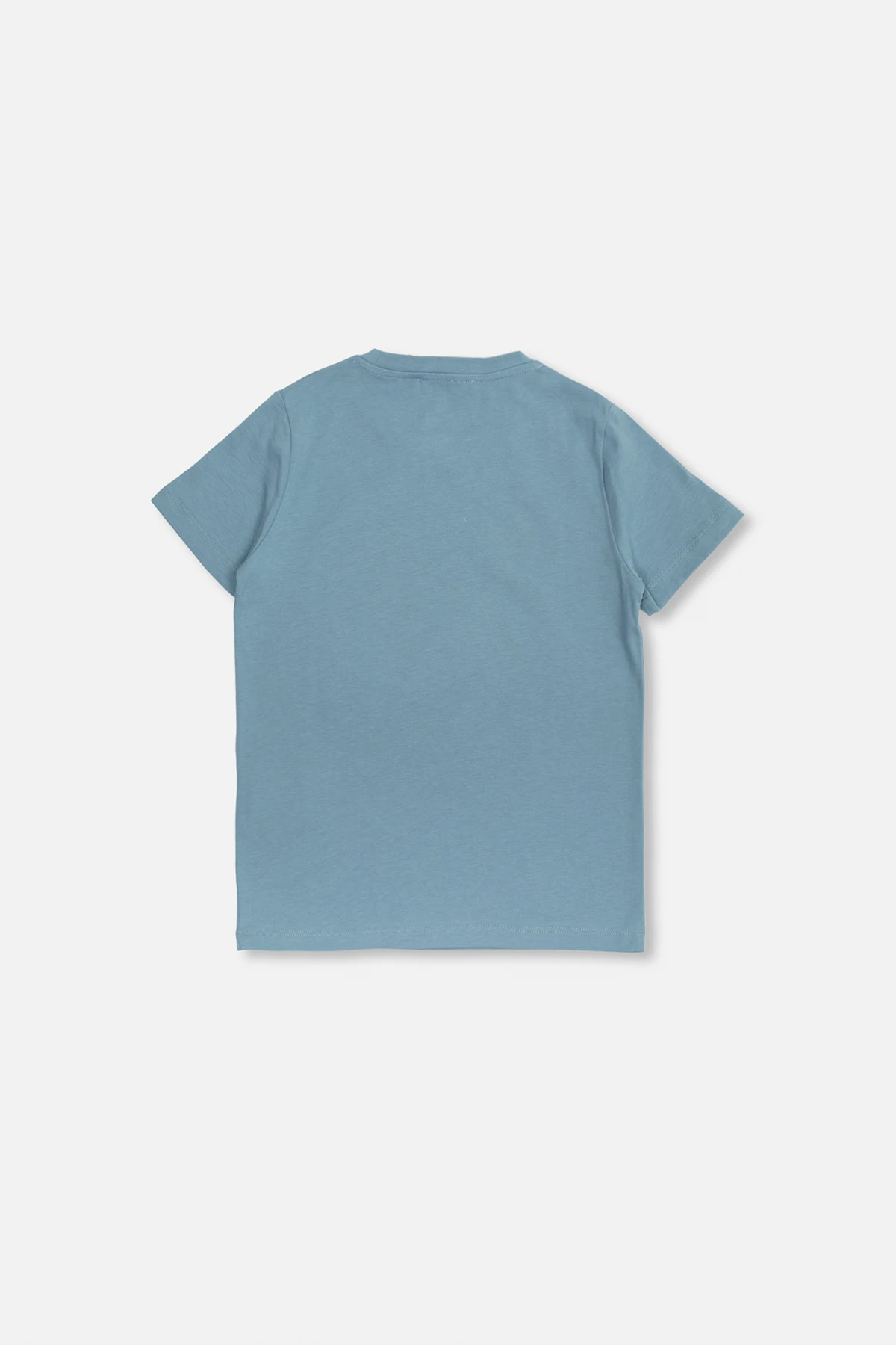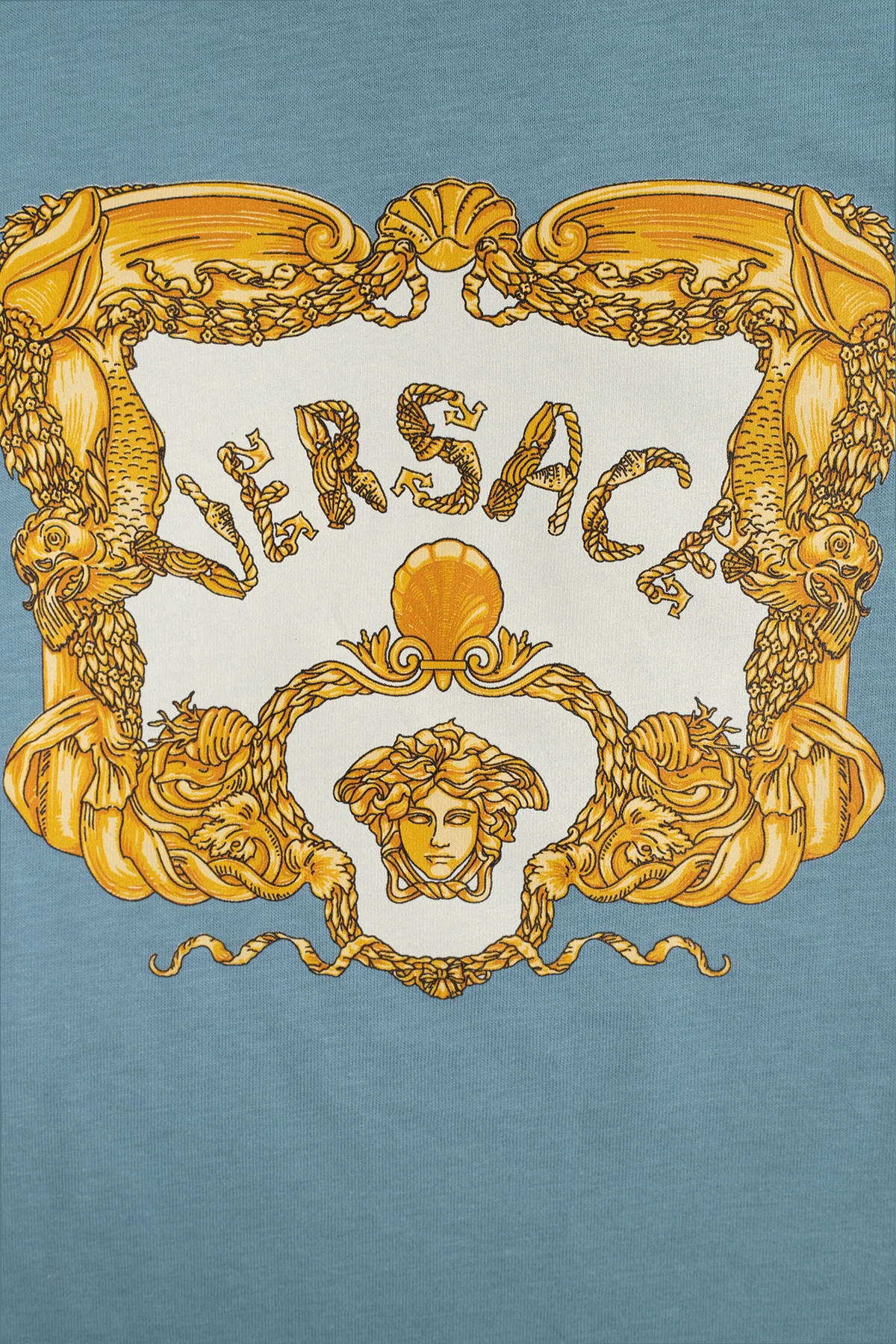 Blue T-shirt from Versace Kids, ‘La Vacanza’ capsule collection. Made of cotton, this short sleeve design features a cream and gold-tone Seashell Baroque Kids pattern and ribbed crew neck.