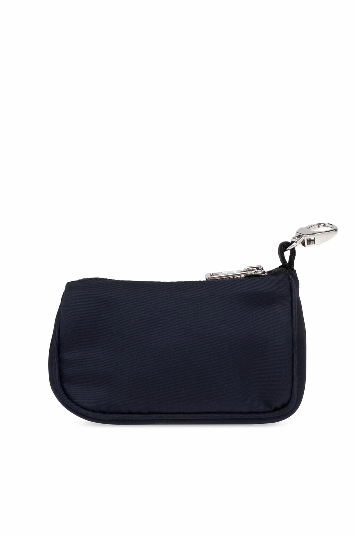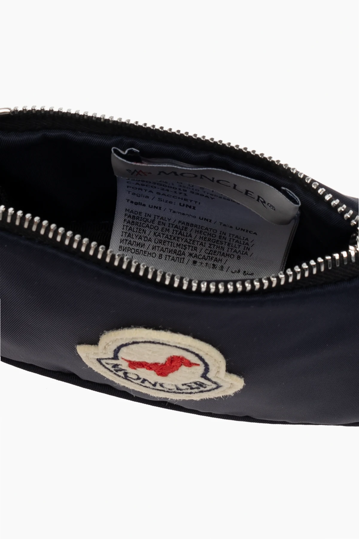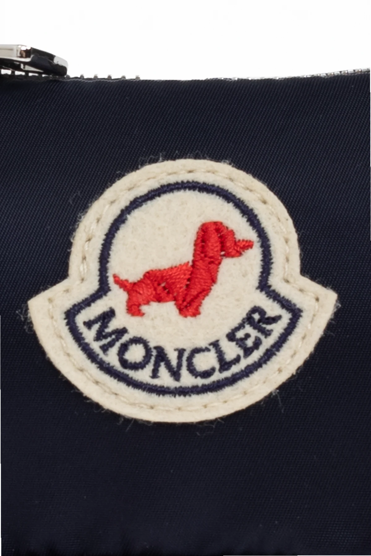 Die dominierende Farbe ist dunkelblau , die mit dem markanten, gestickten Moncler -Logo auf der Vorderseite des Etuis harmoniert. Das Logo zeigt die rote Silhouette eines Hundes sowie den Schriftzug "MONCLER" auf cremefarbenem Hintergrund und unterstreicht die Exklusivität des Produkts. Ein silberner, robuster Reißverschluss mit Metallgriff sowie ein Metall- Karabinerhaken , der das Befestigen an Leine, Tasche oder Gürtel ermöglicht, fügen praktische Funktionen und Benutzerfreundlichkeit hinzu.