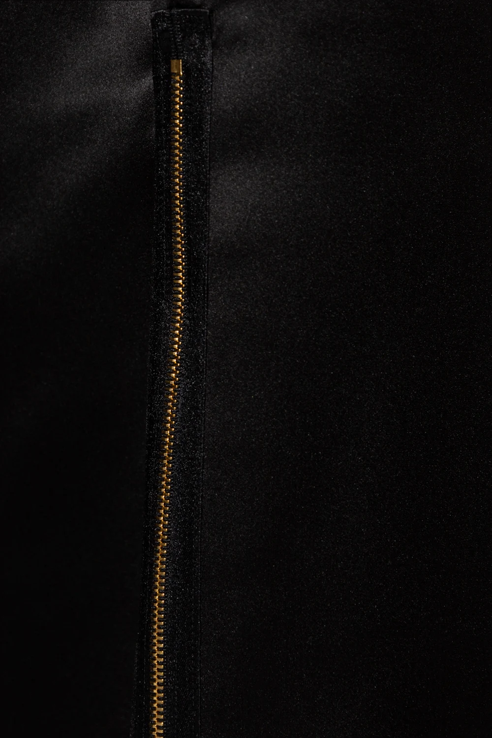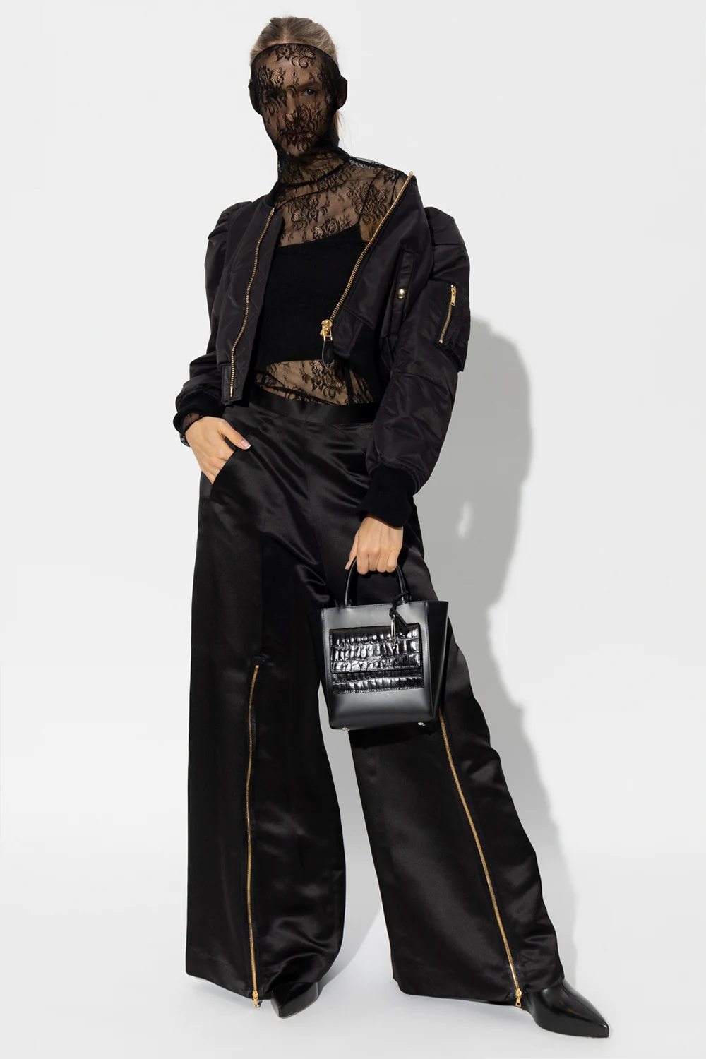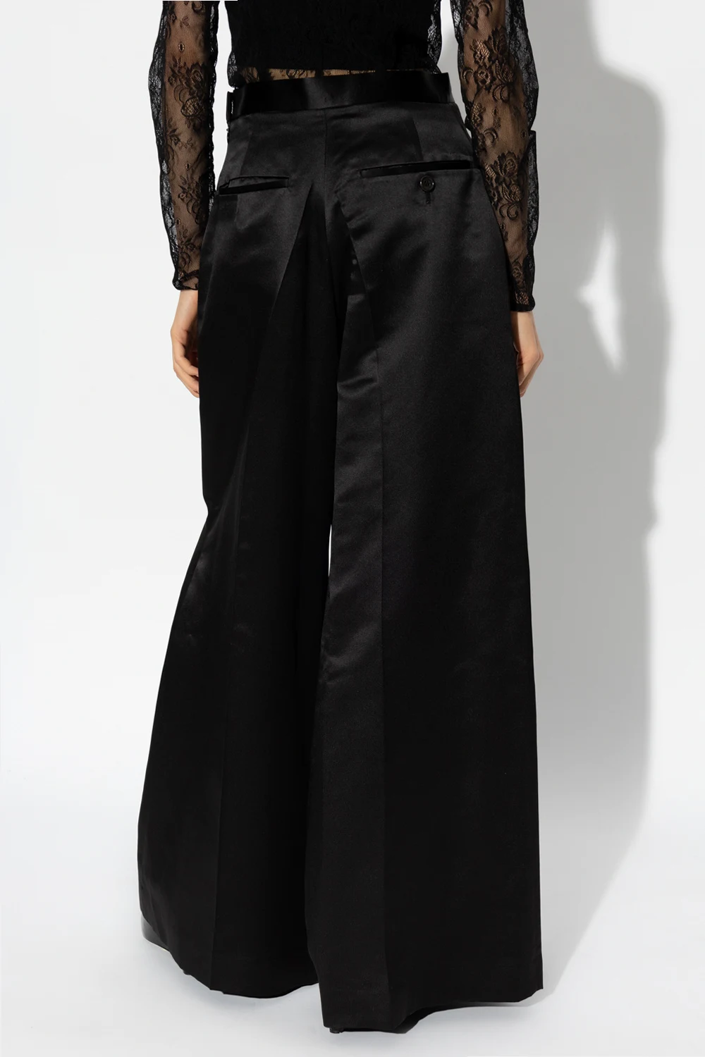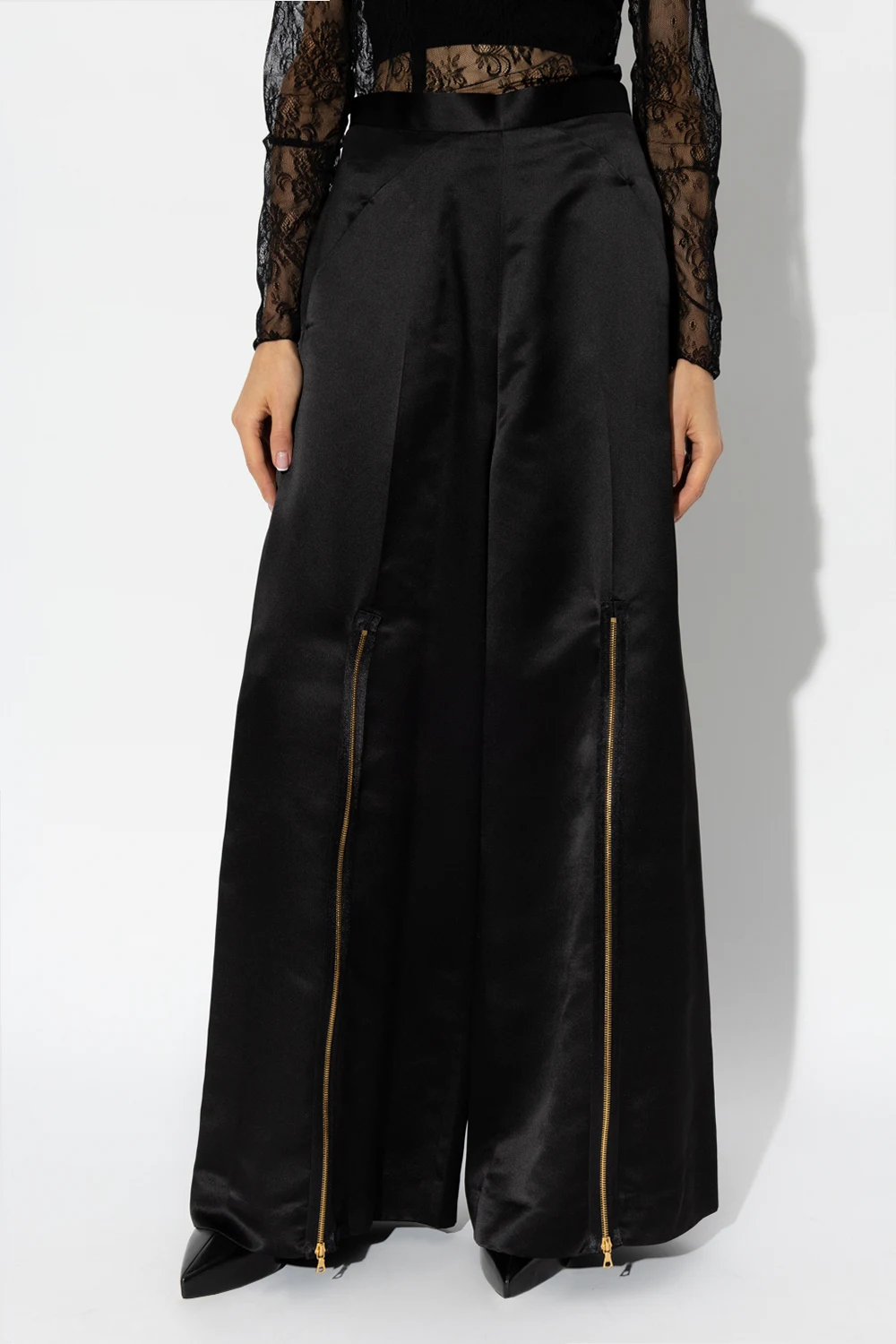 Black high-waisted trousers from Undercover. Made of silk satin, this pair is complete with a concealed side zip and hook, two front pockets, two back pockets and wide legs with gold-tone zips.