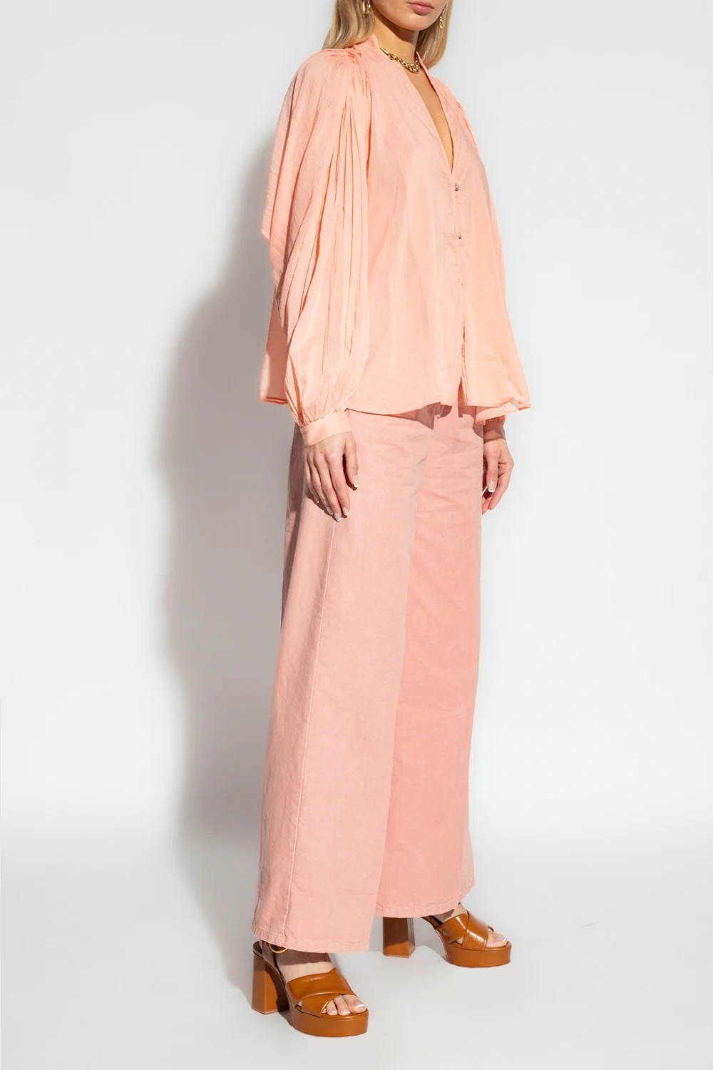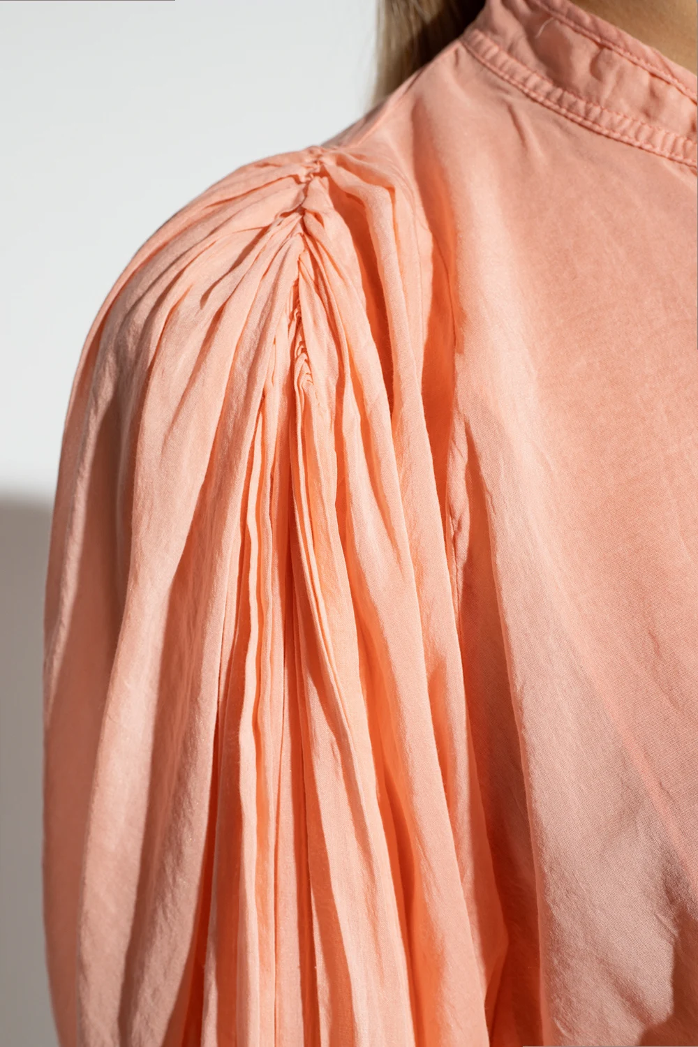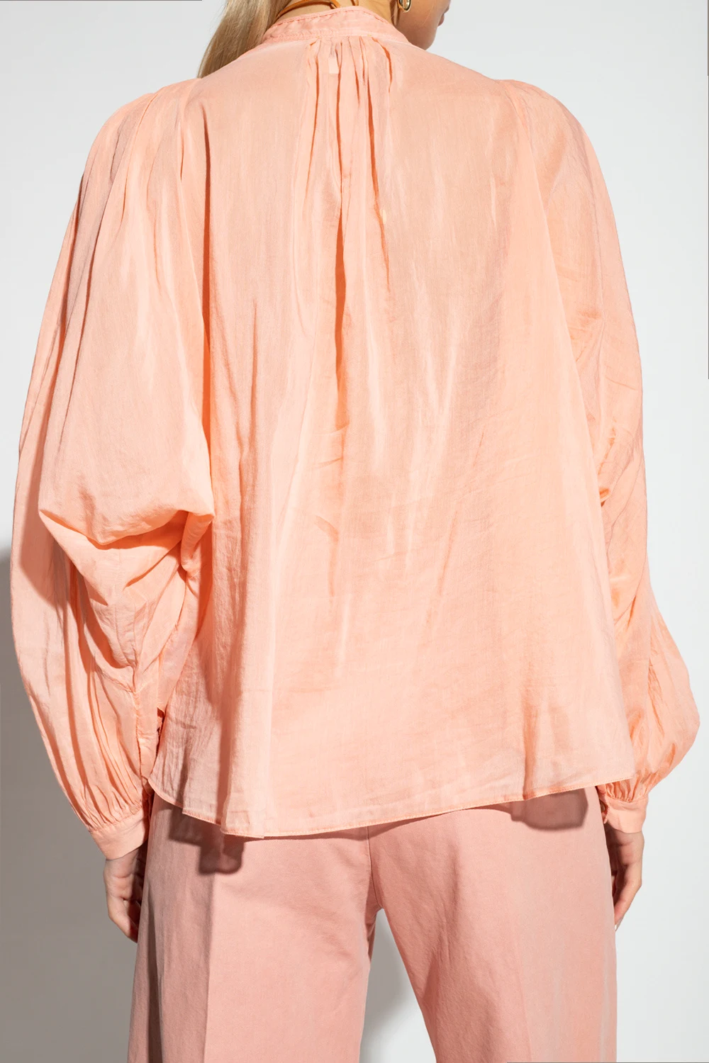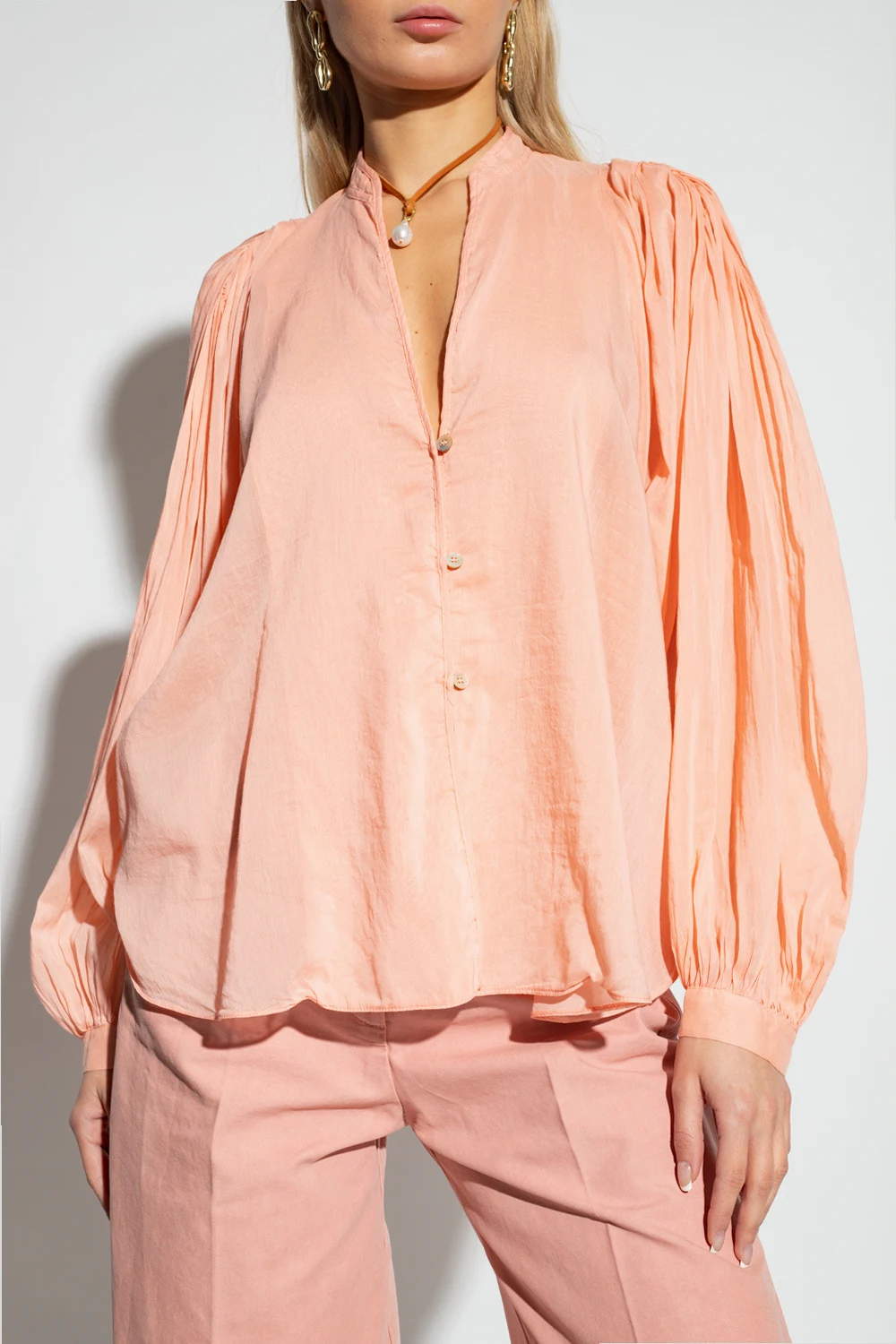 Pinkish orange shirt from Forte Forte. Made of a transparent cotton and silk blend, this loose-fitting design features button fastenings, V-neck with a stand collar and long puff sleeves with buttoned cuffs.