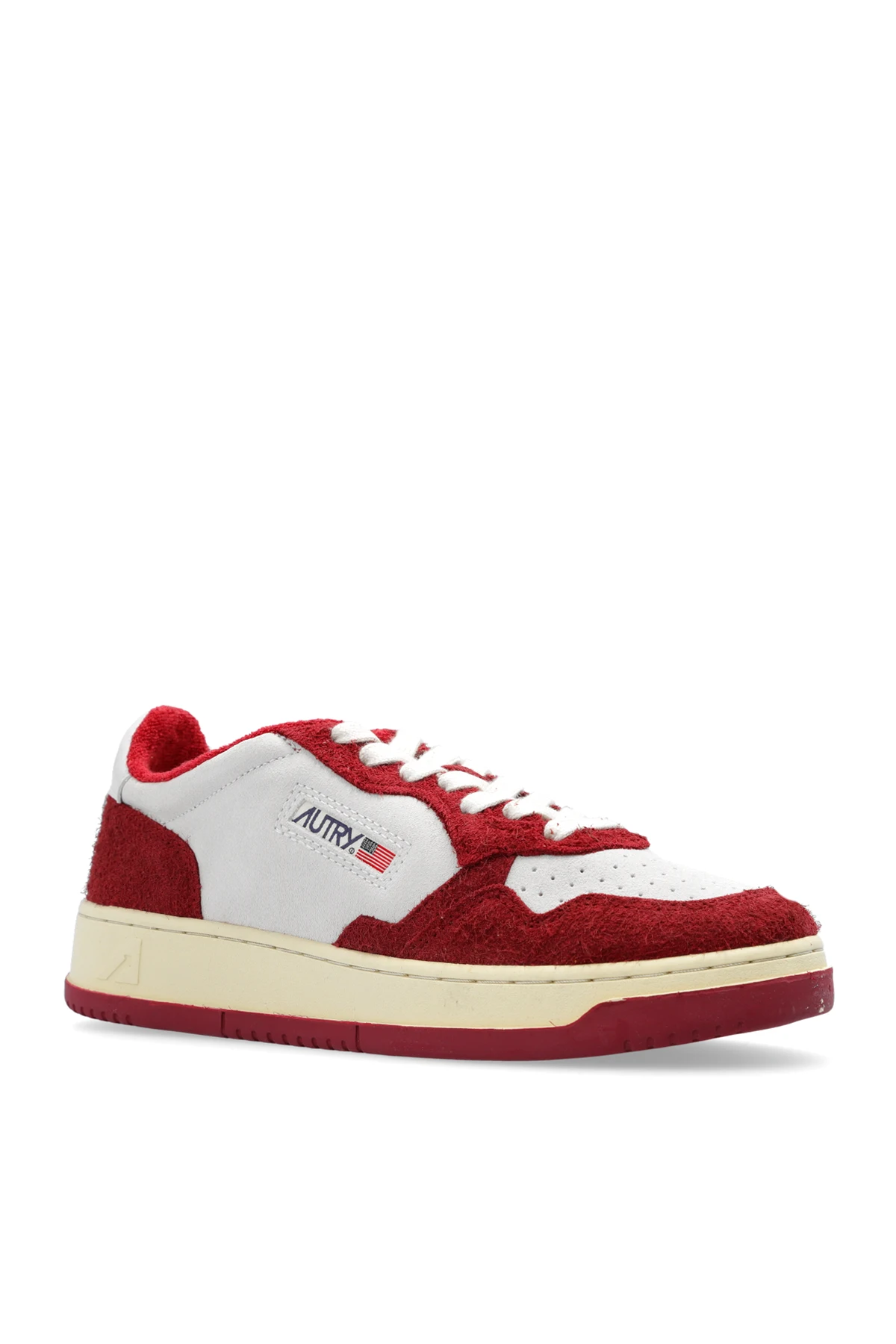 Maroon and light grey ‘AULM’ sneakers from Autry. Made of suede, this lace-up model sits on a maroon and cream rubber sole and showcases the brand's logo and perforations on the toe.