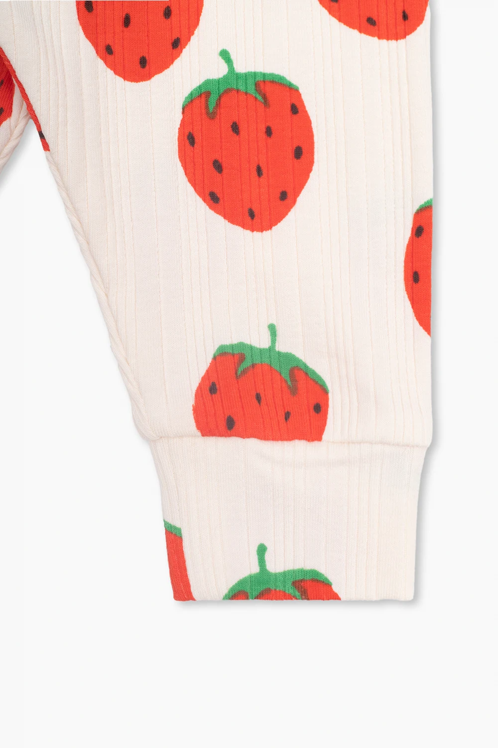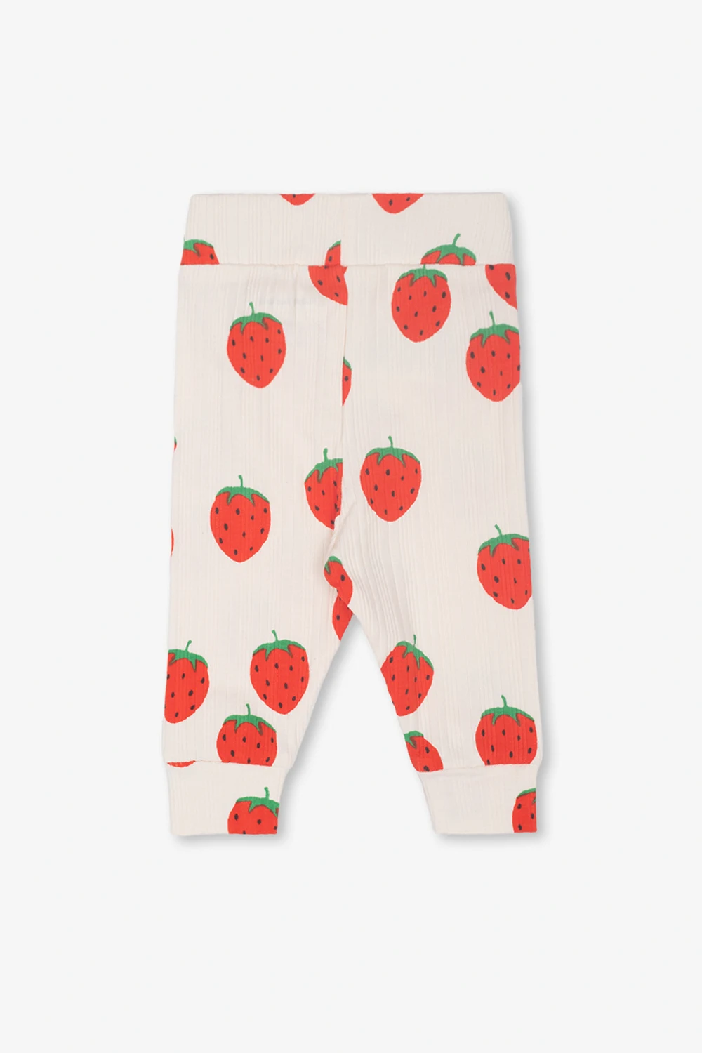 Cream trousers from Mini Rodini. Crafted from ribbed organic cotton with the GOTS certificate, this pair features a red, green and black motif of strawberries and an elasticated waistband and cuffs.