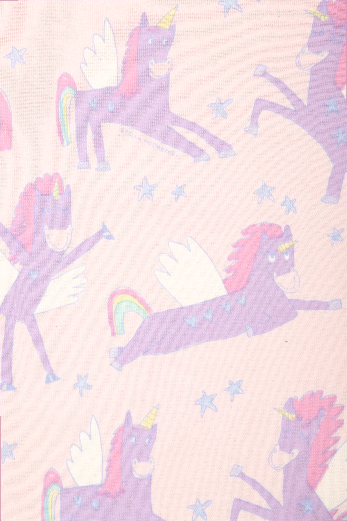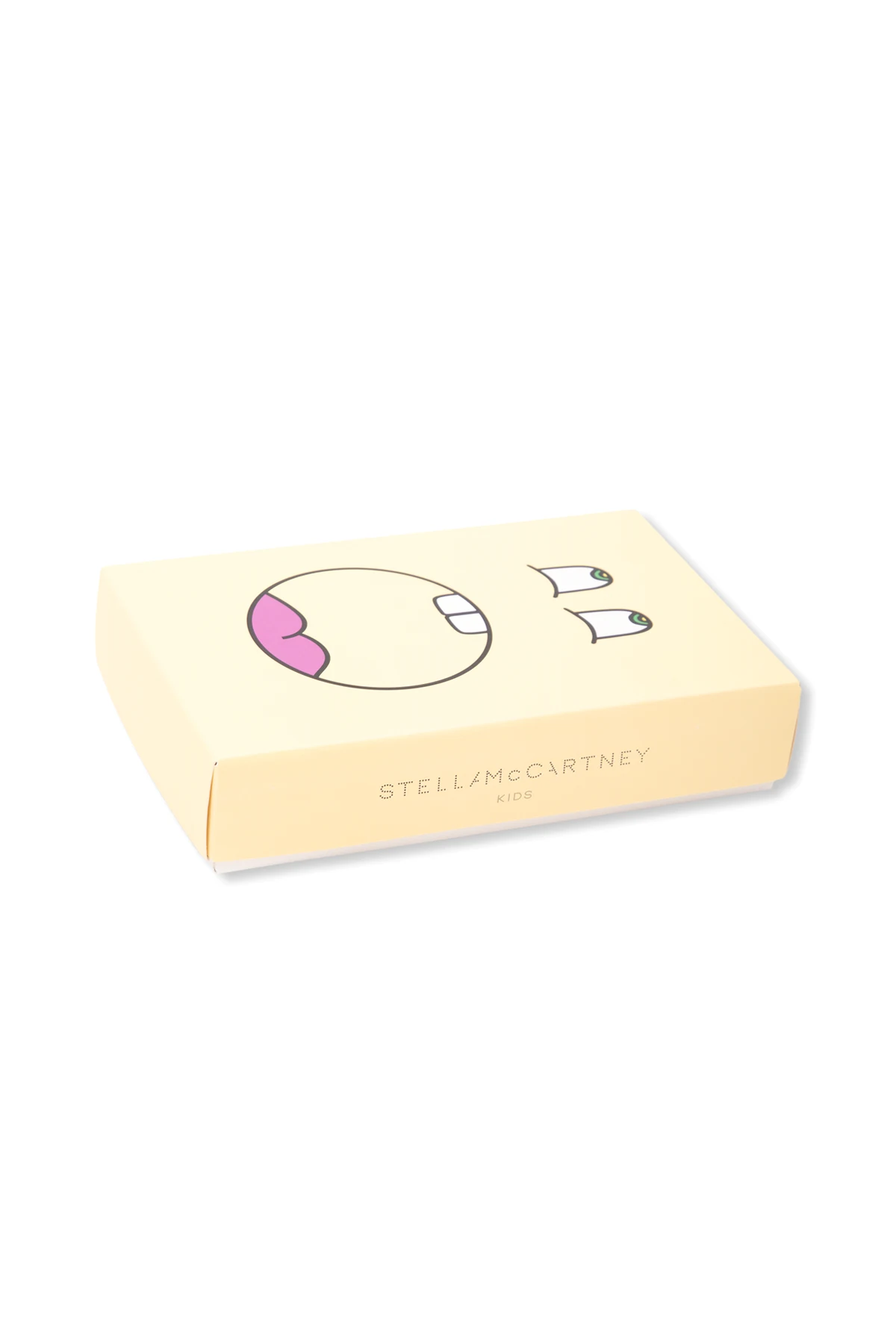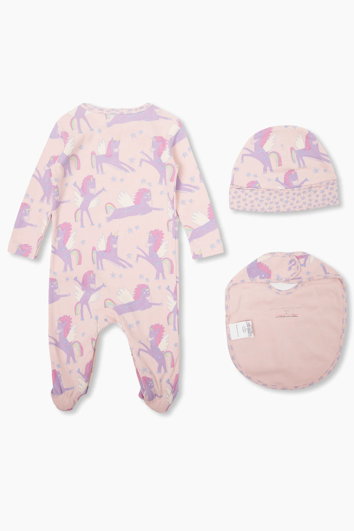 Light pink baby gift set from Stella McCartney Kids. Made of cotton, it includes a babygrow with a round neck, long sleeves, snap closures on the shoulders and crotch and long legs with anti-skidding prints, a hat and a bib with an adjustable snap closure.