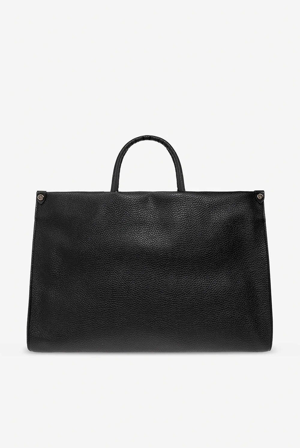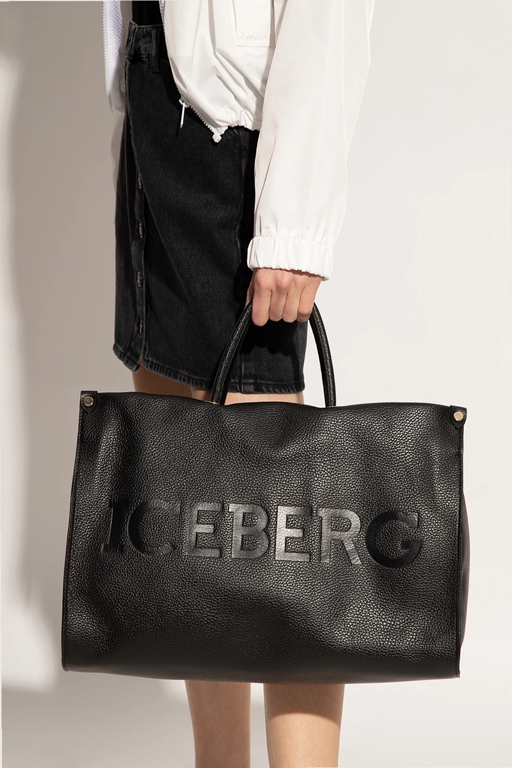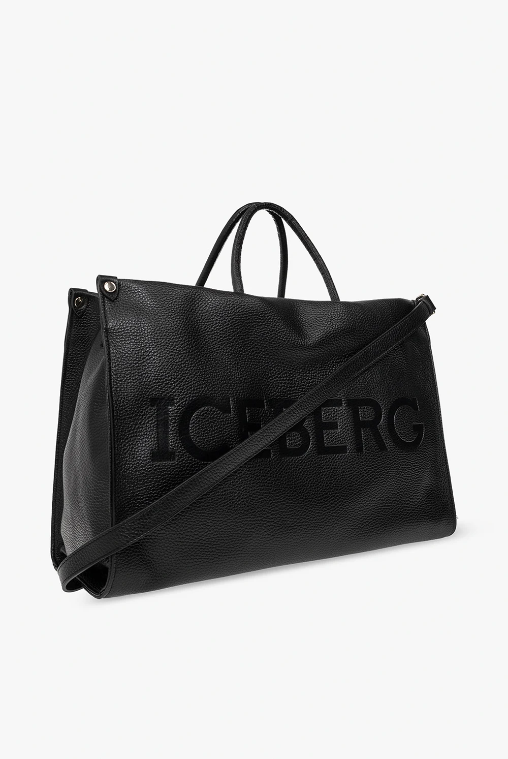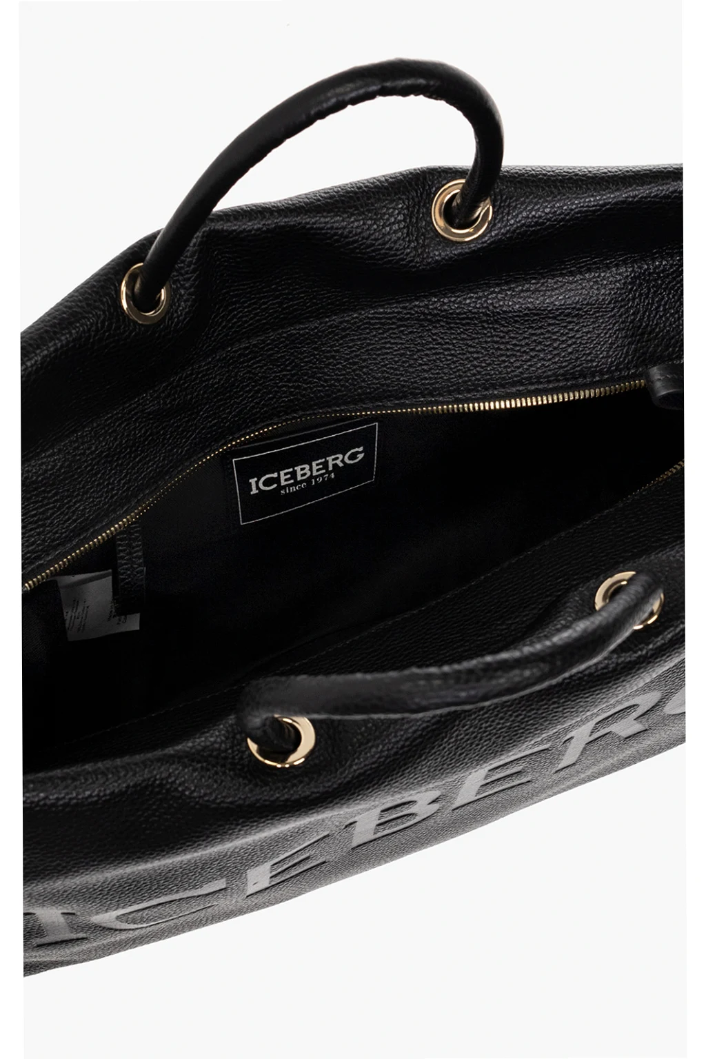 Black shopper bag from Iceberg. Crafted from leather, this design fastens with a zipper and features an embossed logo on the front, two half-round handles, a detachable and adjustable shoulder strap, gold-tone metal hardware and one internal compartment with one zip pocket and two slip pockets.